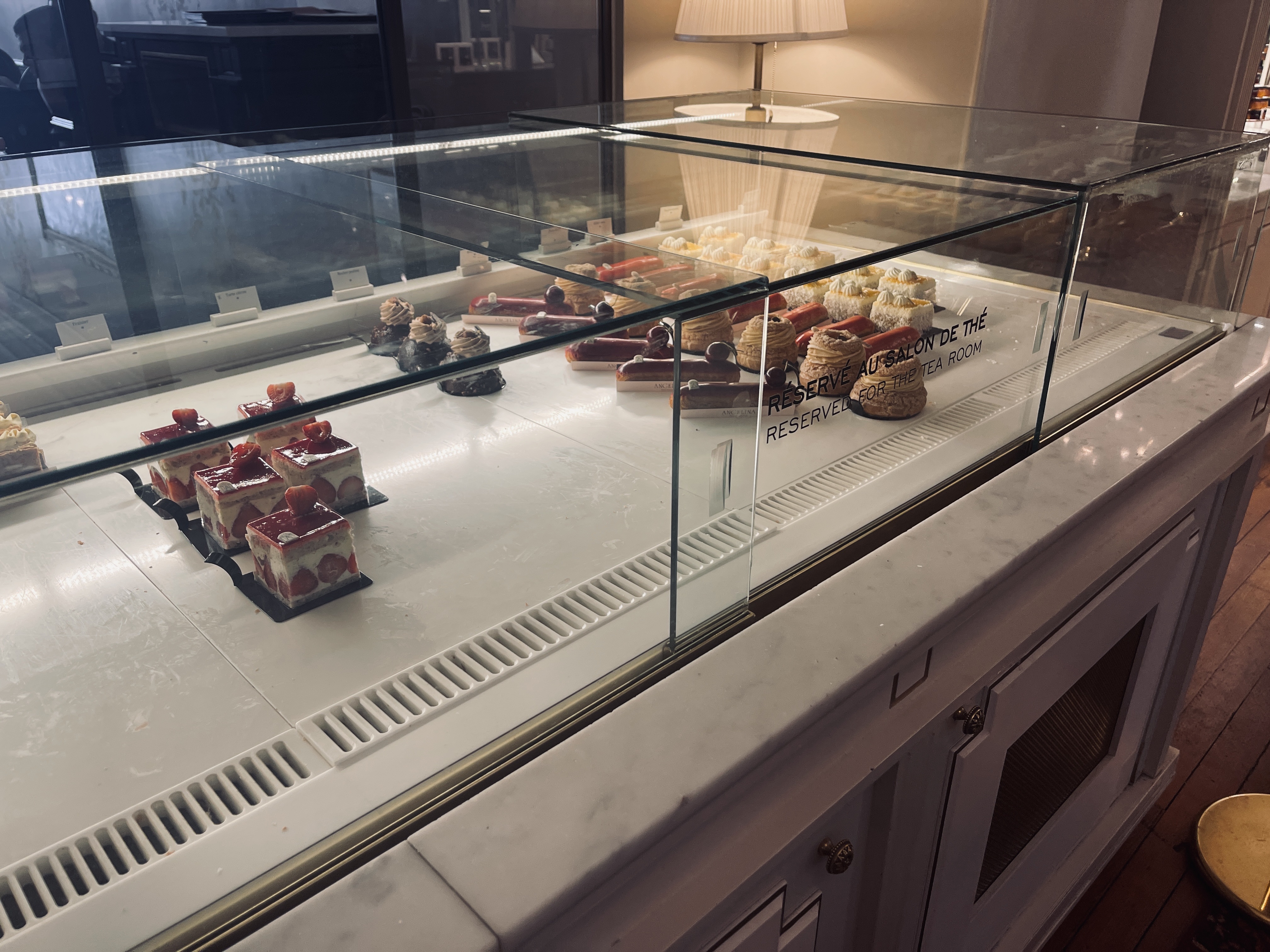 Accueil froid du premier monsieur rencontré pour nous placer ( qui est revenu néanmoins plus tard en cours de repas pour nous demander si tout allait bien ), un sourire suffirait, donc il y a lieu de s'améliorer cher monsieur.En revanche, Gerald s'est montré très agréable, prenant le temps d'échanger brièvement avec nous et aussi de s'enquérir si tout se passait bien.La salle fait vraiment dissonance avec le standing que l'on attend d'Angelina, la salle est morne, la moquette terne, et les murs faits de planches en bois disloquées, à revoir...Les tables deux personnes sont bien trop petites.Les toilettes également pourraient être rafraichies.Pour autant, nous avons pris avec ma fille deux salades césar et un croque monsieur, et c'était absolument délicieux, et que dire des pâtisseries d'une finesse dans les textures et justesse dans le dosage du sucre, c'est bien calibré pour ne pas être écoeurant, bravo à l'équipe des cuisines, nous nous sommes régalés.Oui c'est un peu cher pour ce que c'est, mais le choix se fait devant les pupitres des menus avant d'entrer, on ne le fait pas tous les jours.Merci à vous pour ce bon moment, bon courage et bonne continuation !