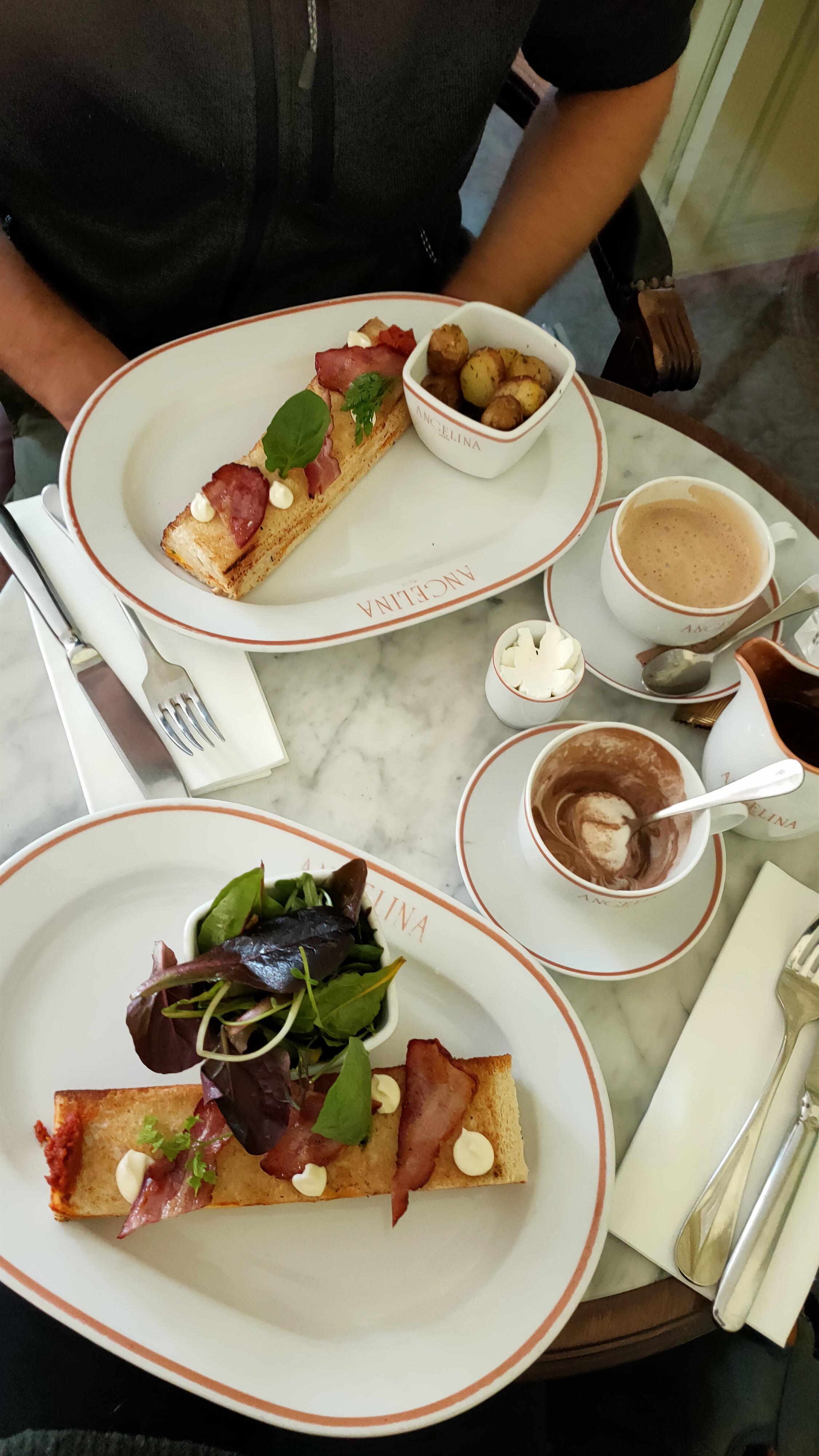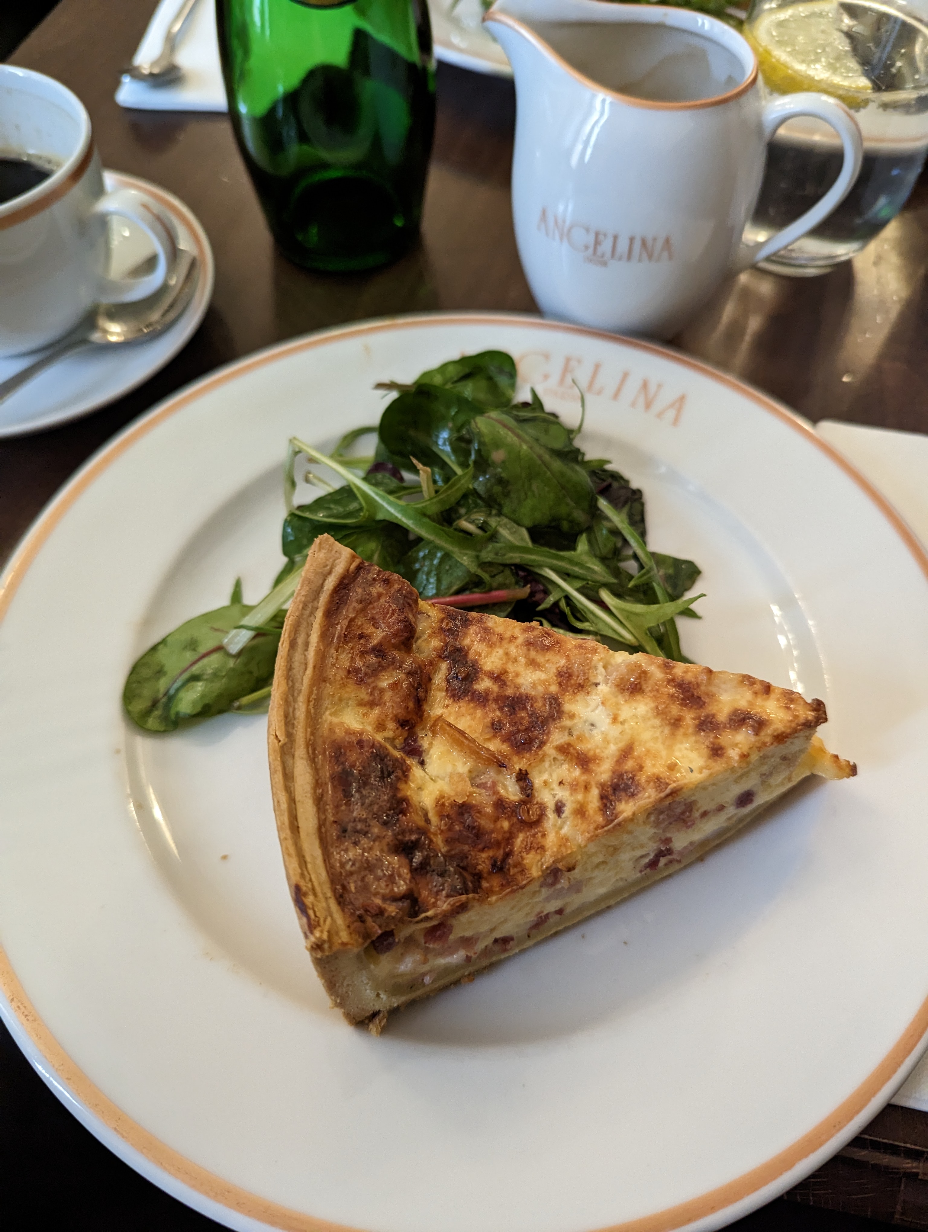 Je voulais rendre visite à Angelina et j'ai eu la chance de prendre une bouchée rapide à Versailles. J'étais assis tout de suite avant qu'il n'y ait trop de monde. Salade et quiche commandées et bien sûr, nos Millefeuille, Rocher Praliné et Mont-Blanc préférés. Absolument délicieux !