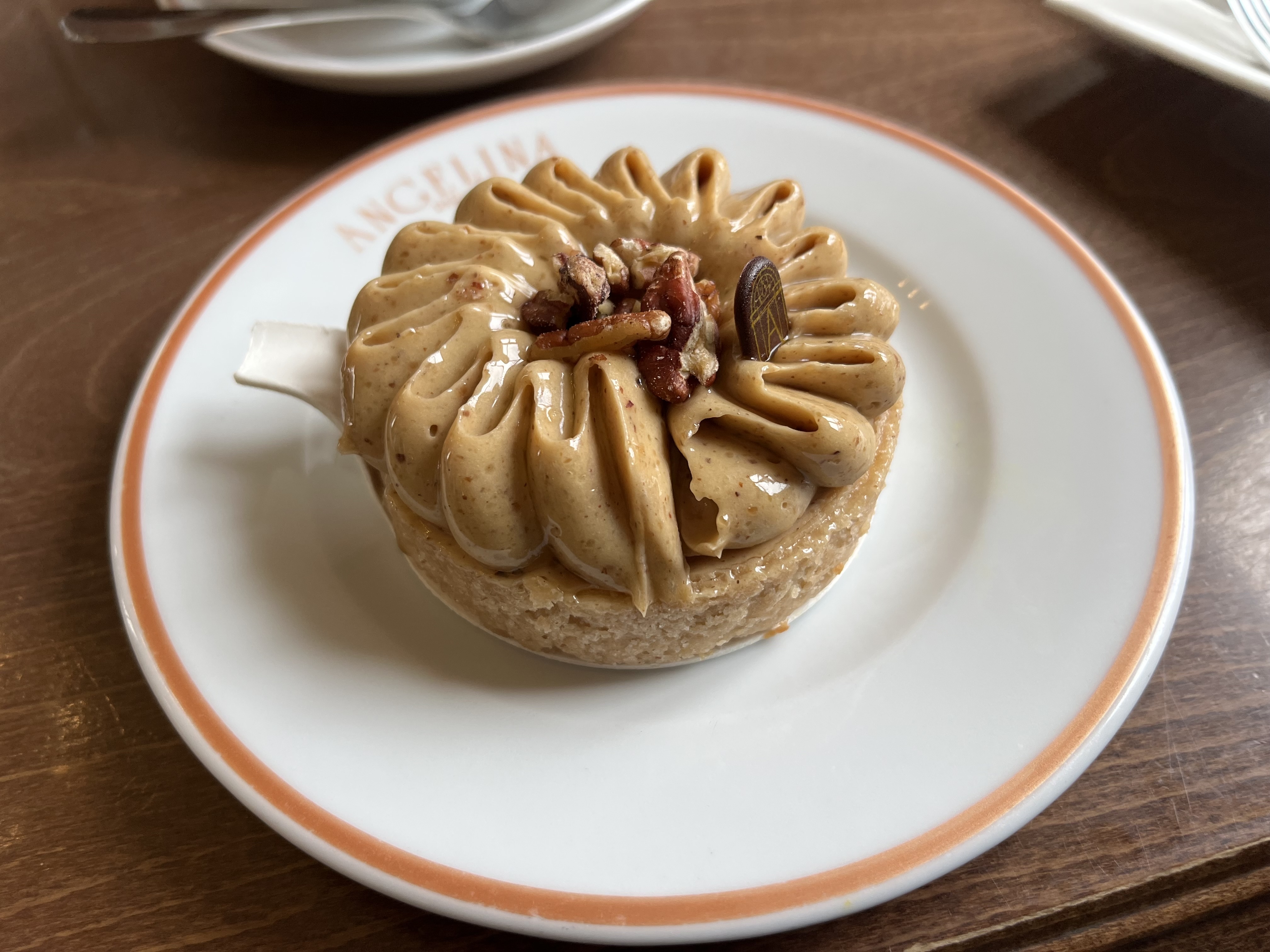 L’intérieur est décoré tristement, la terrasse est rudimentaire. On se sert au comptoir et on doit prendre la commande sur un plateau pour aller se installer. On débarrasse soi-même comme dans un fast-food. Les patisseries sont très médiocres. Le Mont Blanc, qui est la patisserie, fétiche de cet établissement est une simple boulle de crème de marrons de très moyenne fourrée de crème fouettée. Le chocolat à l’ancienne était tiède ou presque froid et bien trop sucré. Angelina est resté figé dans le temps, et c’est laisser dépasser par une concurrence créative et bien plus délicieuse. Dommage. Pour tout cela, le prix est bien entendu excessif.