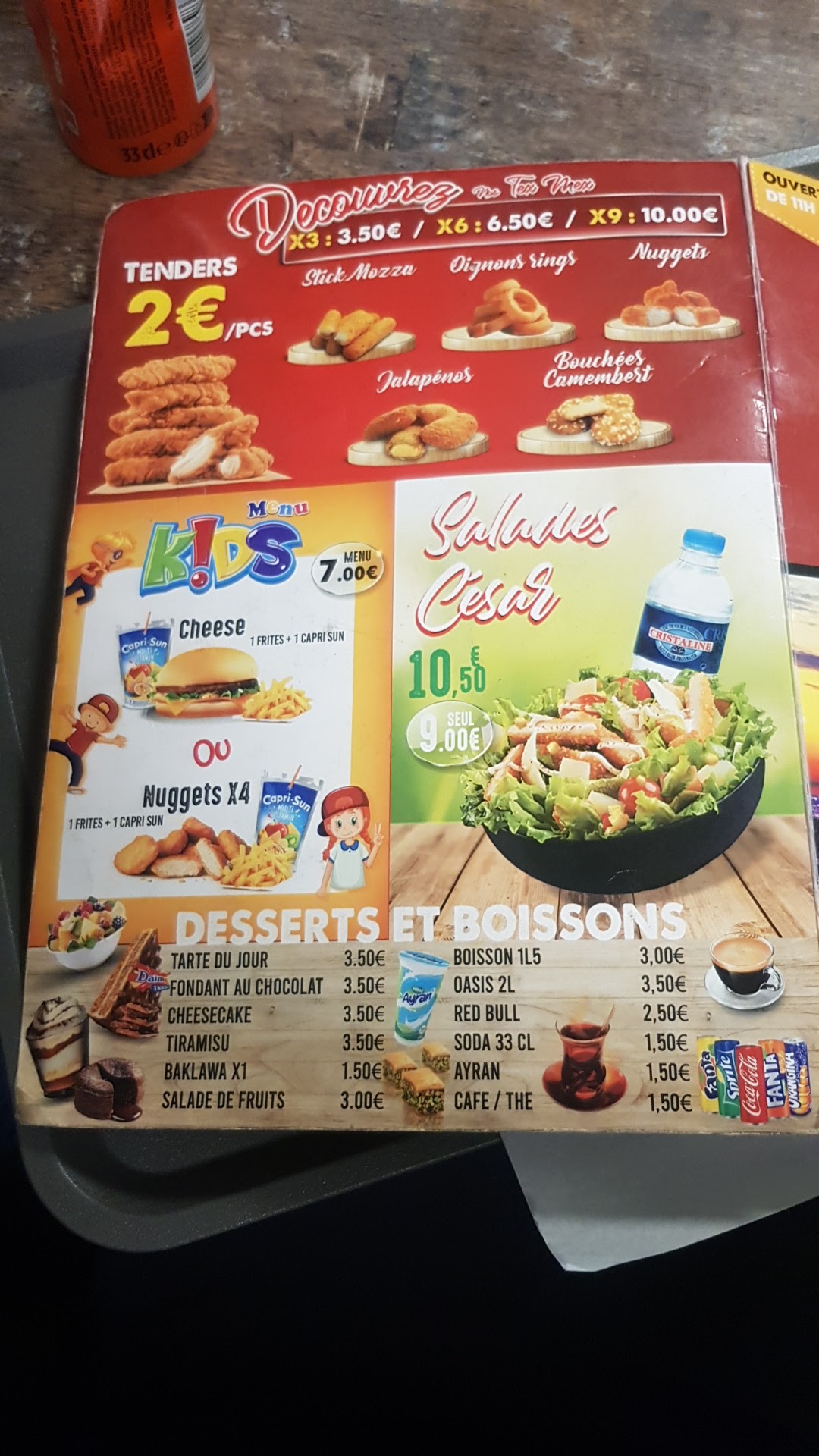 même pas un bonjour,on dirait qu'on est pas là bienvenue,kebab plus que minuscule qui serait même trop petit pour un enfant de 5 ans, 9 frites sur le plateau,le menu pour 9 euros c'est extrêmement cher pour rien à manger,tacos tenders extrêmement petit,franchement c'est la première et dernière fois où nous venons...on avait l'impression de n'avoir rien mangé à notre départ...très très déçu de la quantité servi... porté des WC où il faut forcer pour sortir. hygiène pas top du tout, je ne recommande pas du tout ce snack