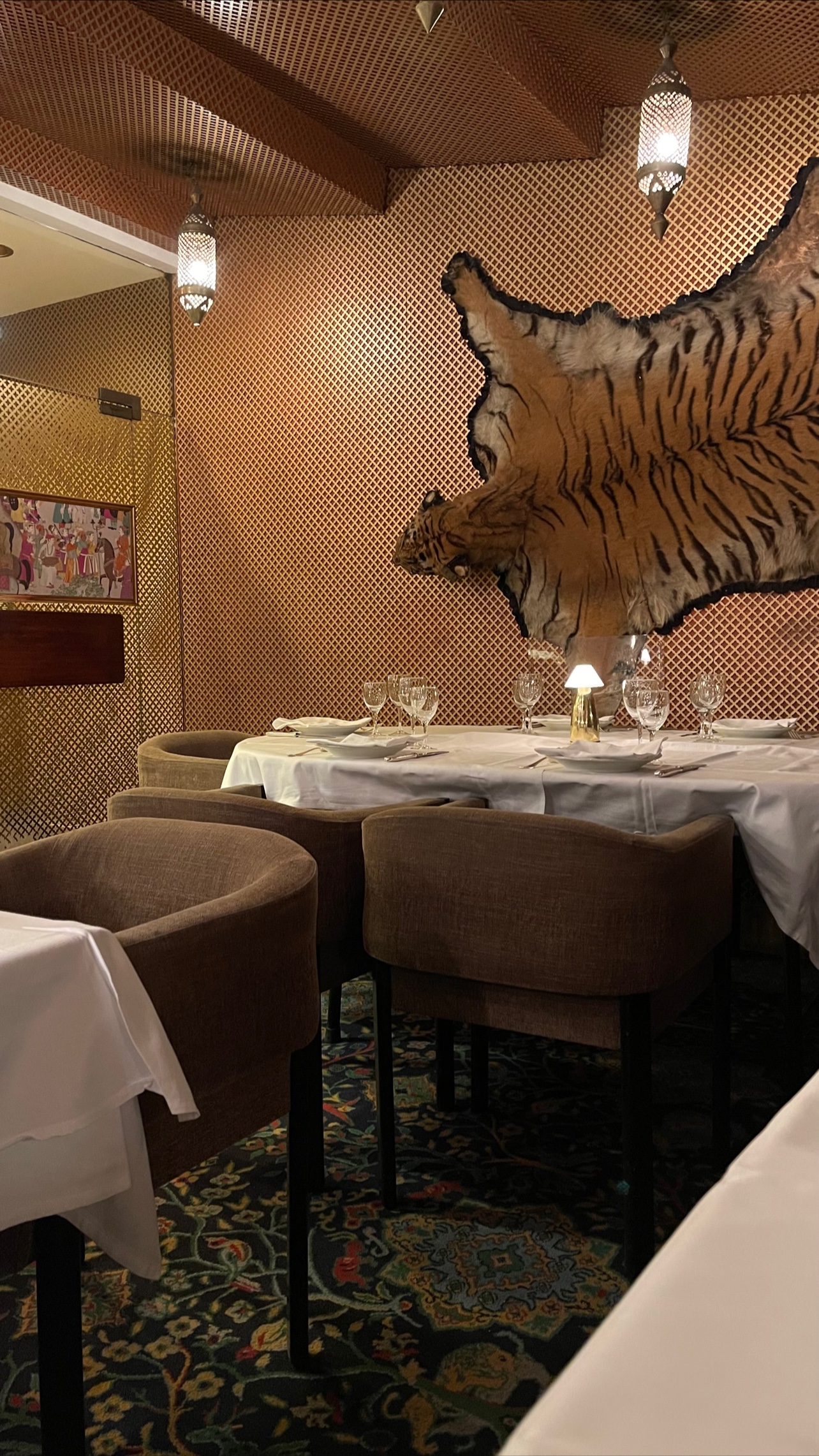 Cette critique ne concerne pas la nourriture mais l'ambiance. Le personnel était courtois et nous nous sommes assis rapidement. Puis ce fut le choc de voir deux carcasses de tigres fièrement exposées sur les murs de ce restaurant. Je demande par la présente à la direction, est-ce nécessaire ? Un restaurant indien dans une destination touristique populaire comme Paris - ne devriez-vous pas prendre les devants sur un problème aussi grave que l'extinction du tigre due au braconnage ?? Au lieu de cela, vous décorez vos murs avec la carcasse non pas d’un mais de deux tigres. S'il vous plaît, repensez !!