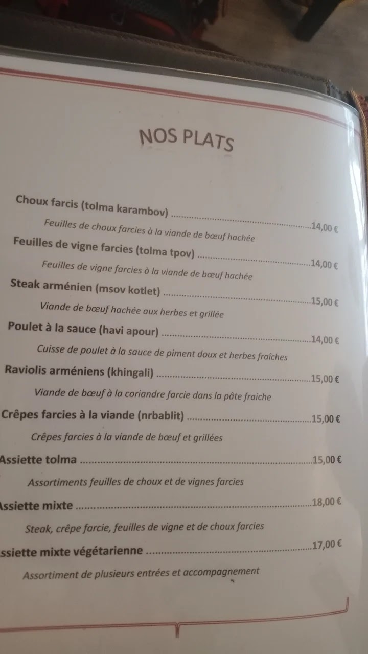 Un restaurant aperçu en nous garant, la rue n'est pas grande, dommage qu'il ne soit pas visible Menu arménien ? On ne sait pas trop avant de rentrer. L'accueil est chaleureux. Je recommande le menu découverte expliqué durant le service si vous voulez vraiment bien manger , c'est un véritable délice . Tout est maison c'est sûr Comme quoi le hasard fait parfois bien les choses