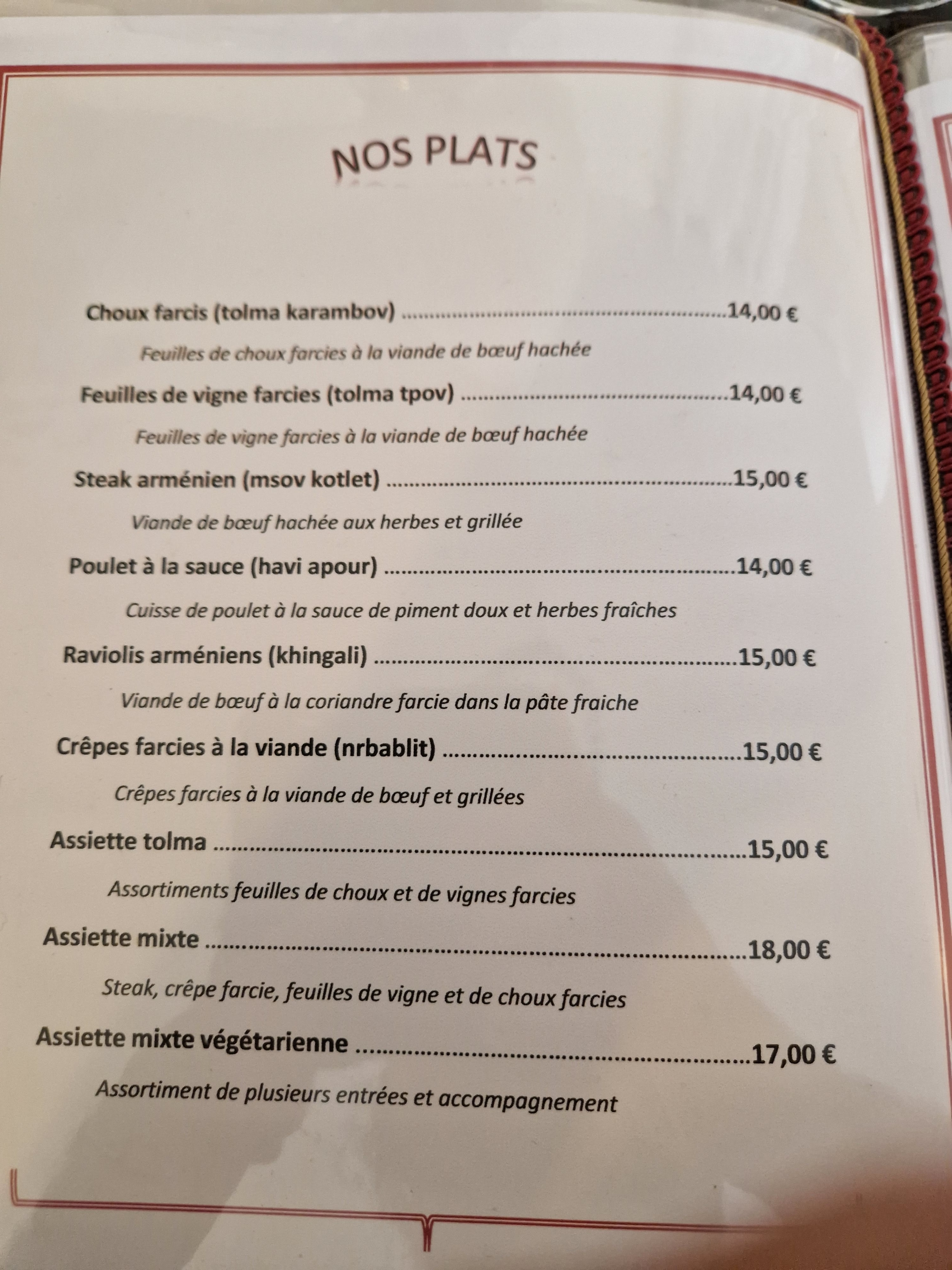 Une jolie découverte des plats arménien Une assiette mixte des entrées 13€ et en plat 15€ vous permetteras de découvrir différentes saveurs.