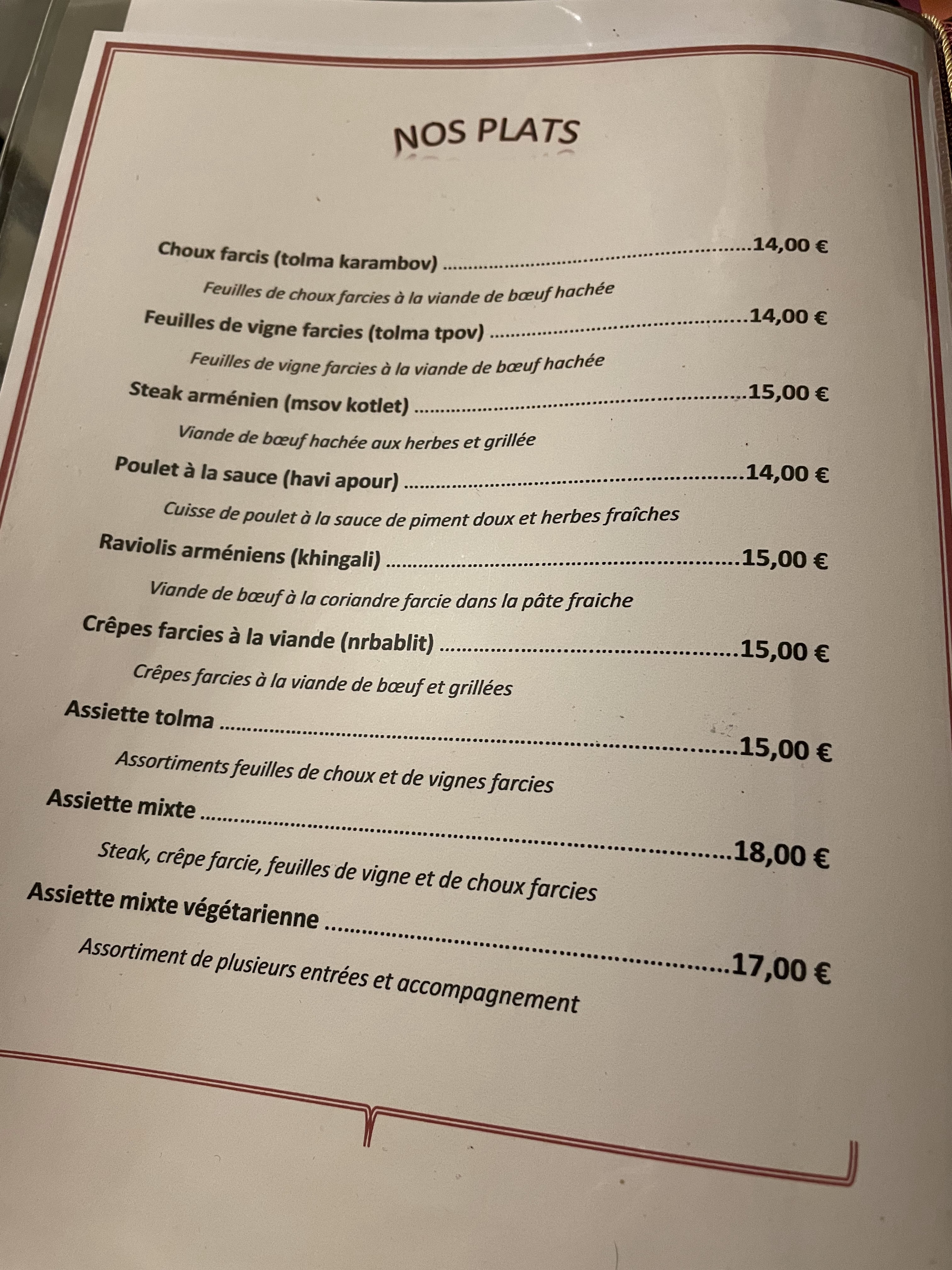 découverte des plats arméniens. tout est fait maison et les patrons nous ont accueillis malgré l heure tardive. ils sont très gentils.