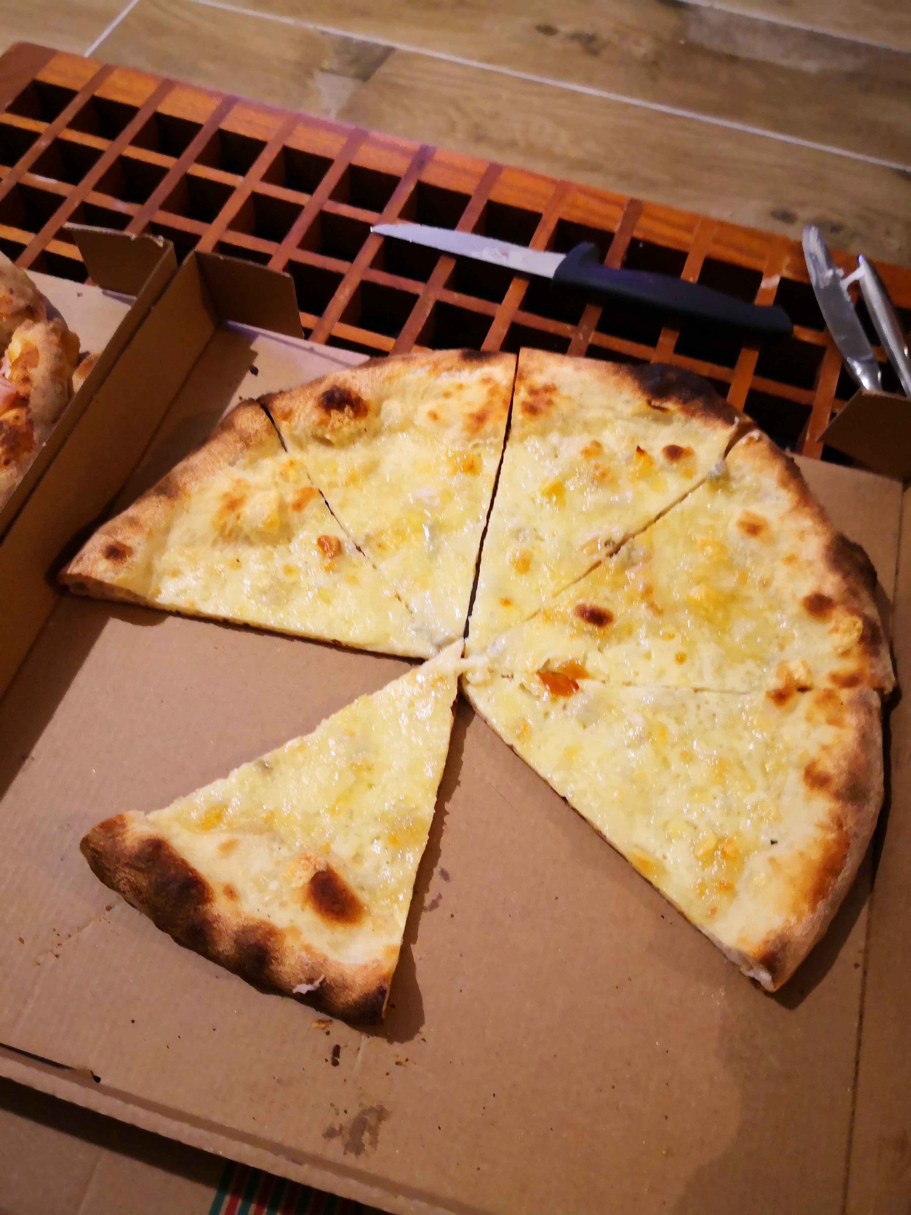 Commander via les freres toques, très déçue de la qualité de ces pizzas dont une est arrivée dégoulinante de crème au fond du carton (pizza à 15 euros...), Champignon de paris plein de flotte. Très peu de mozzarella sur les pizzas. A éviter....