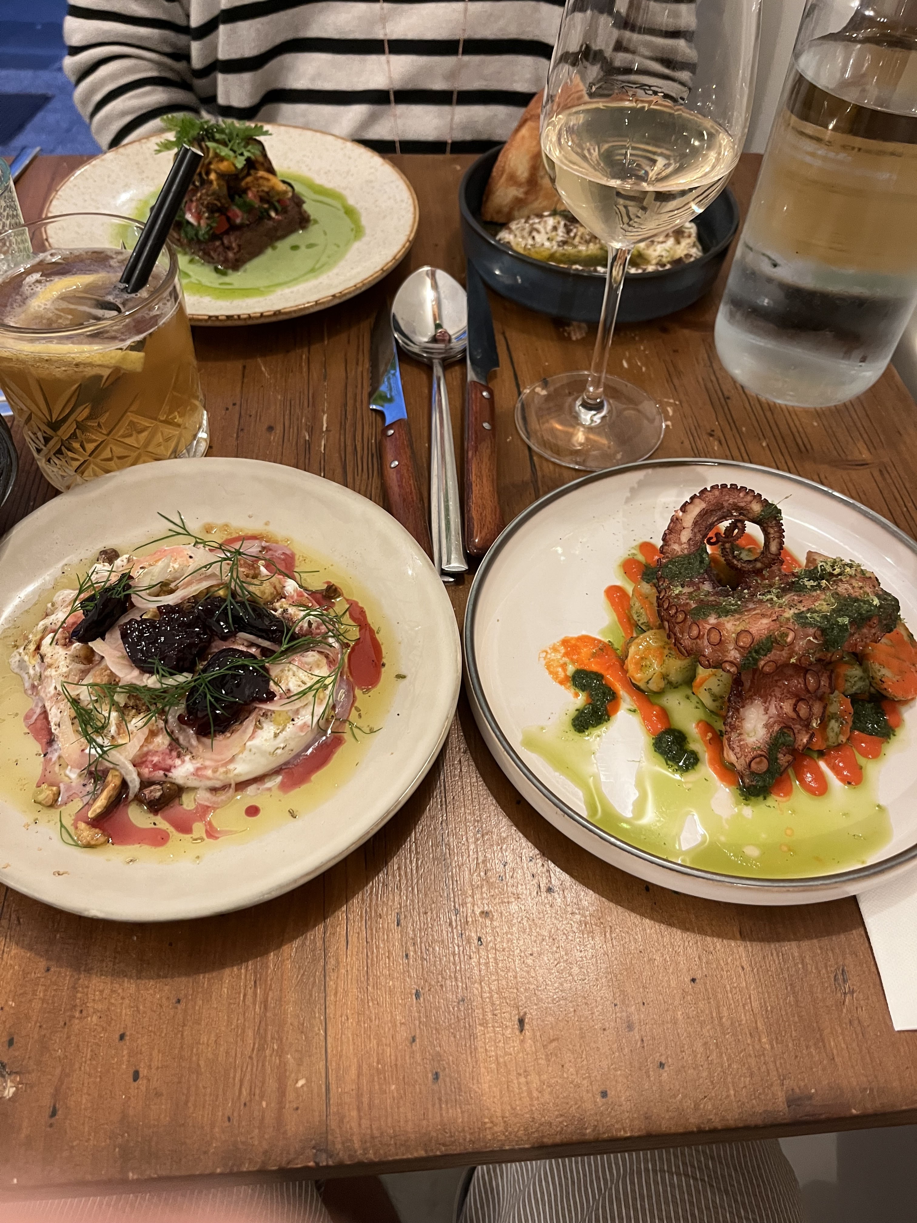 Ouah! Extrêmement créatif et incroyablement délicieux. Excellents plats panméditerranéens. Nous avons commandé tout le menu pour un groupe de 6 personnes. Nous avons tellement aimé que nous avons commandé un deuxième tour de tout le menu. Bonne musique, personnel adorable, petit endroit mignon niché dans la ville balnéaire de rêve. Les frites sexy étaient amusantes, la kefta et les rouleaux de porc confit nous ont tous fait fondre. Le dessert imbibé de café avec du mascarpone « vortexé » ressemblait à du tiramisu, mais d'une manière ou d'une autre, oserais-je dire, meilleur.