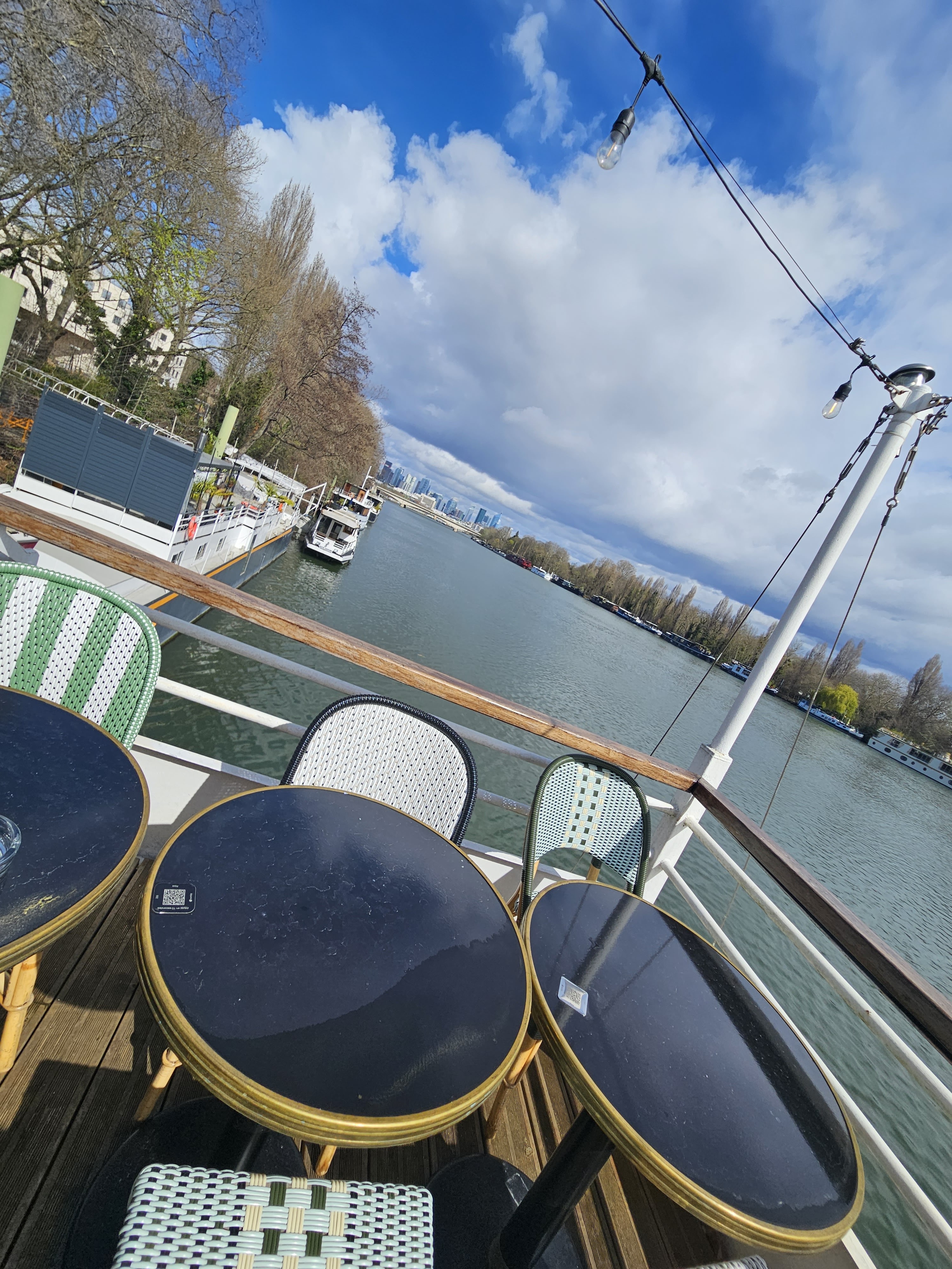 Le cadre est tres agreable, vous etes sur le pont d'une peniche, vue sur la seine entre la defense et boulogne . L'ambiance est tres sympathique, conviviable et les serveuses et serveur d'une efficacité remarquble . Nous sommes venues par un chaude soirée de printemps, 28-30°C, un leger vent raffraichi l'atmosphere. Nous avons reservé par La fourchette pour avoir les 20% sur la carte. nous celebrons le printemps et un ete tres precoce avec en aperitif un Spritz / Aperol bien servi dans des grands verres accompagné d'une poignée et gateaux aperitifs Je choisi une Pizza 4 fromage en direct , d'autres prennent des entrees, et en plat principal des tagliatelles au fromages . QUand ma pizza arrive deception une pates tres epaisse et gonflee. les 4 fromages sont tres peu present. c'est surtout de la patte .. TOut le contraire d'une vrai pizza avec une pate tres fine et une belle garniture. Les tagliatelles des filles sont mangeables , faire des pates il n'y a pas trop de risque . ... Les filles commandes des desserts. Moi echaudé par la pizza je prends juste un café .Le carpaccio de mangue arrive mais le fruit n'est pas bon .. retour en cuisine. Le patron ne comptera pas ces desserts . Au final une note de 150€ a 4, il y avait pour 60 € entre les apero et la bouteille de vin rouge excellente. mais le prix est exhorbitant pour les prestations. Le cadre est agreable mais il ne faut pas regarder ce qu.il y dan l'assiette. Au fait nous a fait le coup d'avoir oublier la reduction la fourchette .... apres reclamation ce fut fait .