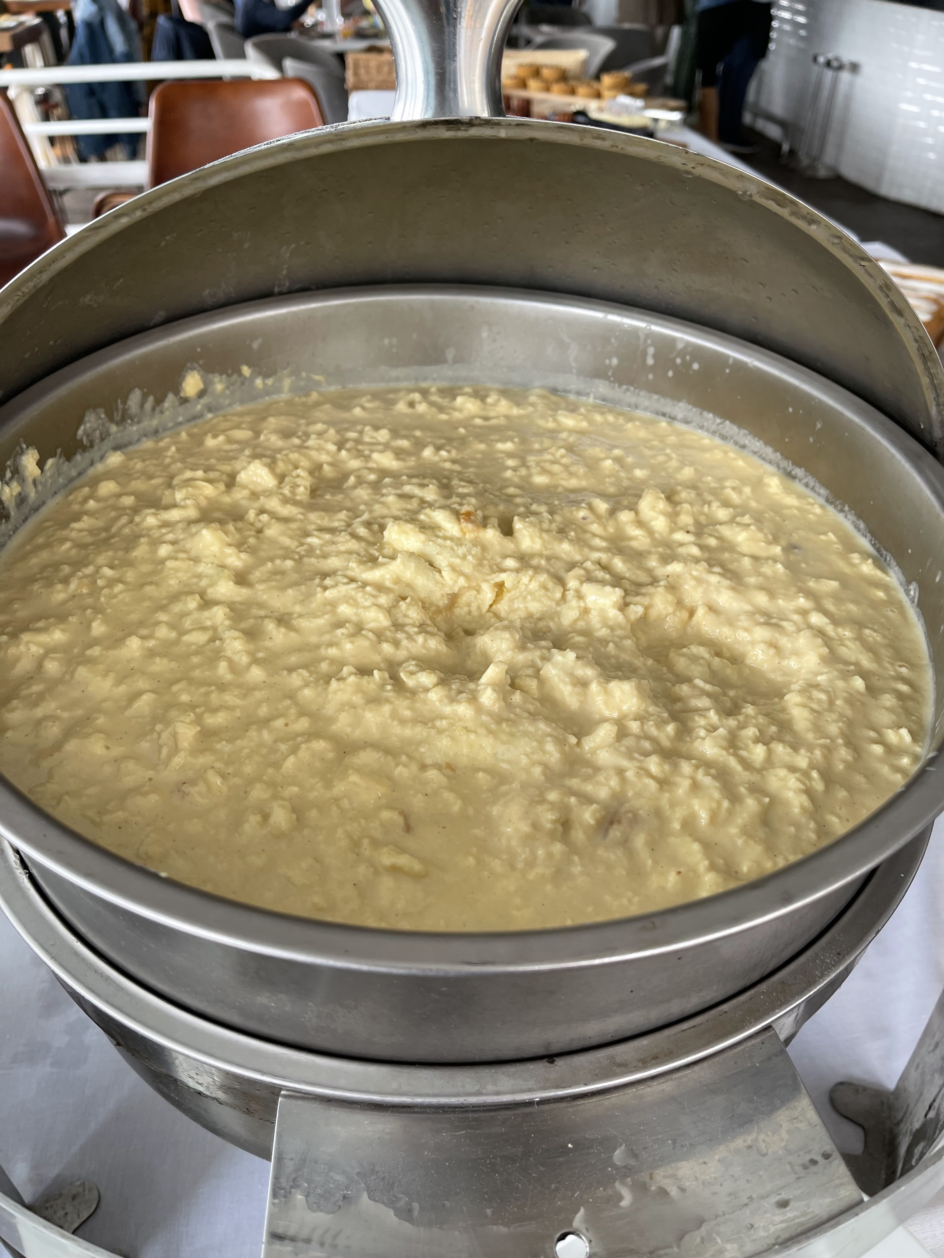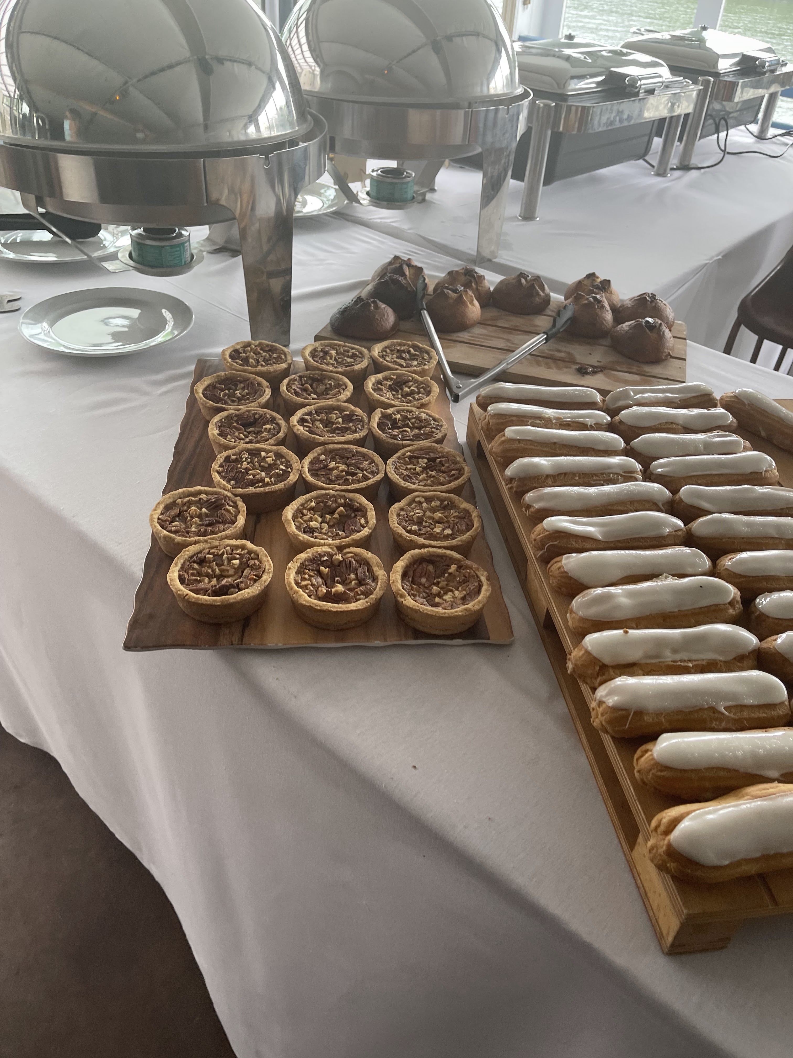Très bon brunch à neuf personnes au bord de l’eau tout en étant en intérieur. À 14h30 il y avait encore plein de choses à manger!