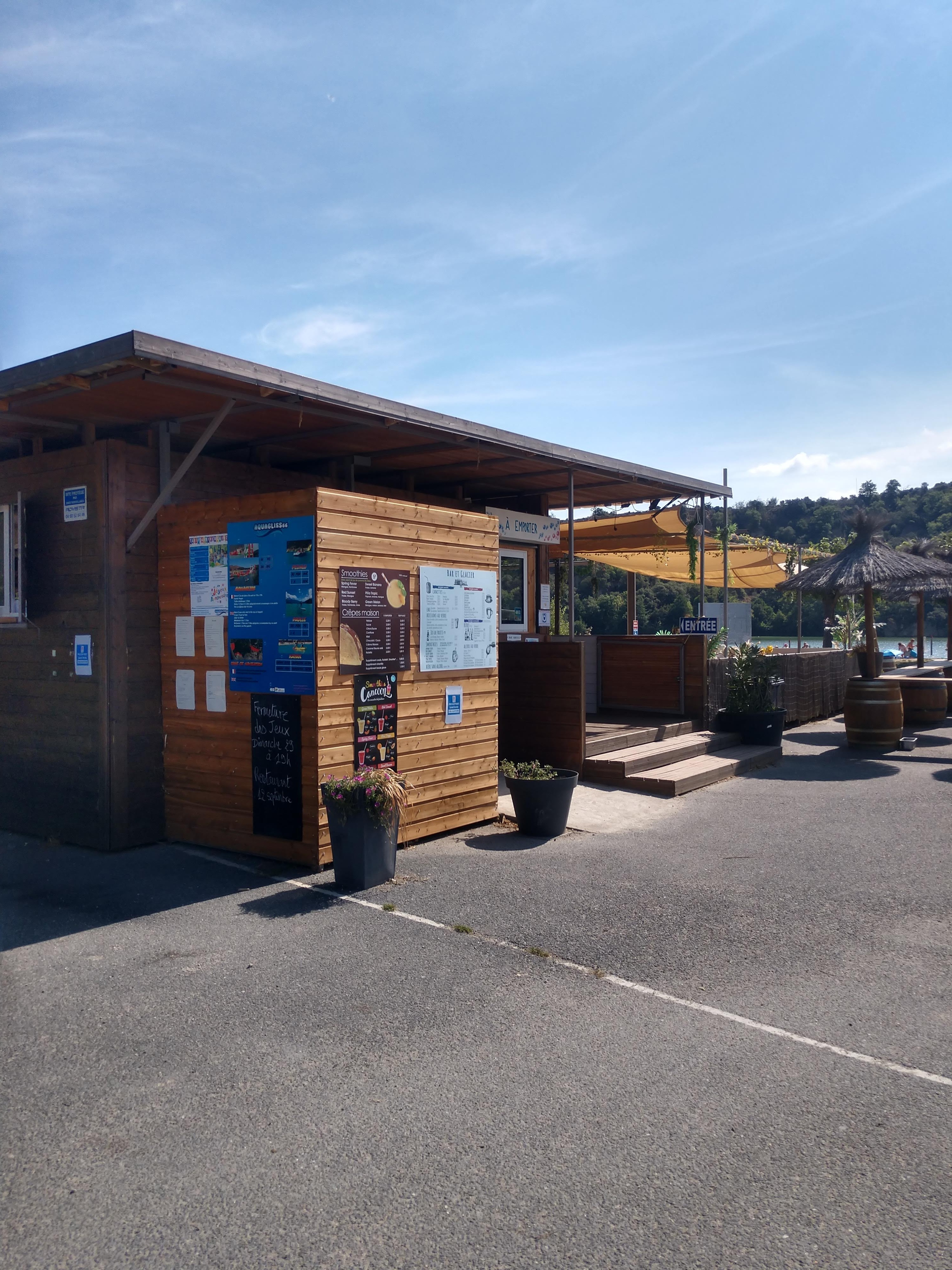 Restaurant sympathique où manger un burger (assiette bien garnie pour 10 euros très raisonnable) ou une salade . De belles coupes glacées, de bons jus de fruits des producteurs du coin et des smoothies (énormes ) délicieux qui ont ravi les enfants. On peut se baigner dans l'eau fraîche du lac avec une vue agréable sur le canigou. Nous n'avons pas testé les activités aquatiques payantes.