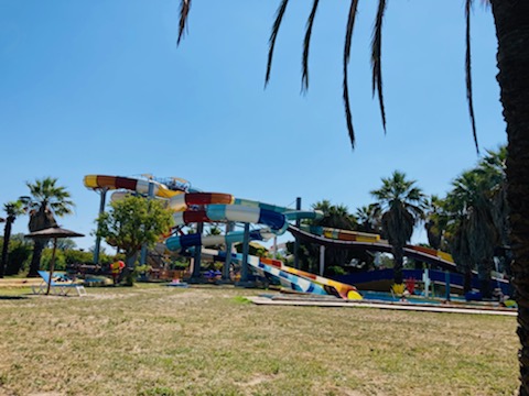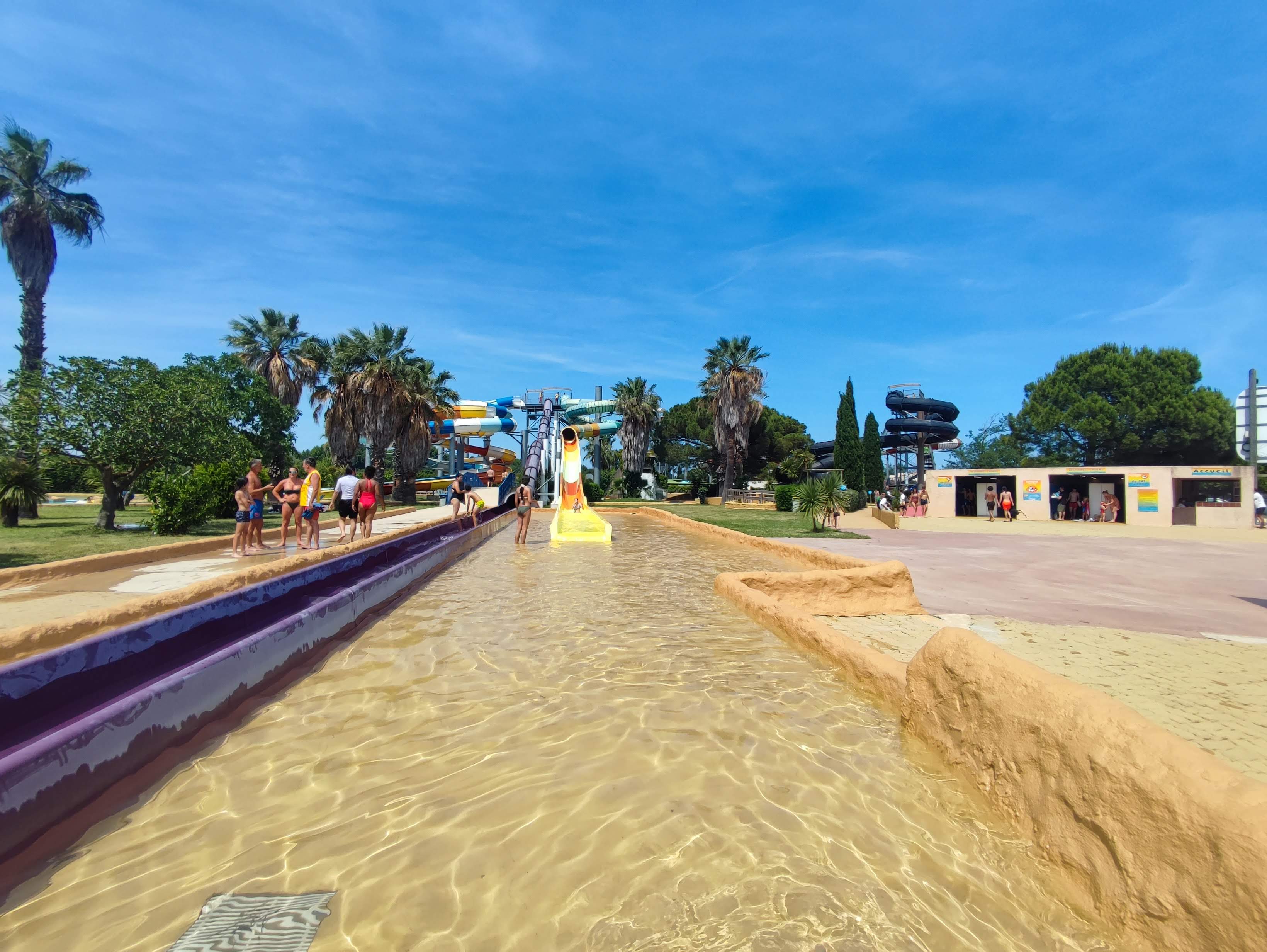 Mon avis sur le parc aquatique est assez mitigé. Le parc est plutôt limité en termes d'attractions, et on en fait rapidement le tour. Comparé à d'autres parcs du même groupe, celui-ci semble un peu abandonné. Bien que j'aie acheté le fastpass à 30 €, je recommande plutôt celui à 20 €, car les maîtres nageurs ne vérifient pas systématiquement. Les transats à 4 € sont à un prix raisonnable, et le personnel est très souriant. Nous avons apprécié la nourriture sur place, qui était très bonne. Cependant, il est dommage que toutes les tables soient occupées par des personnes apportant leur propre nourriture, ce qui nous a obligés à manger debout.