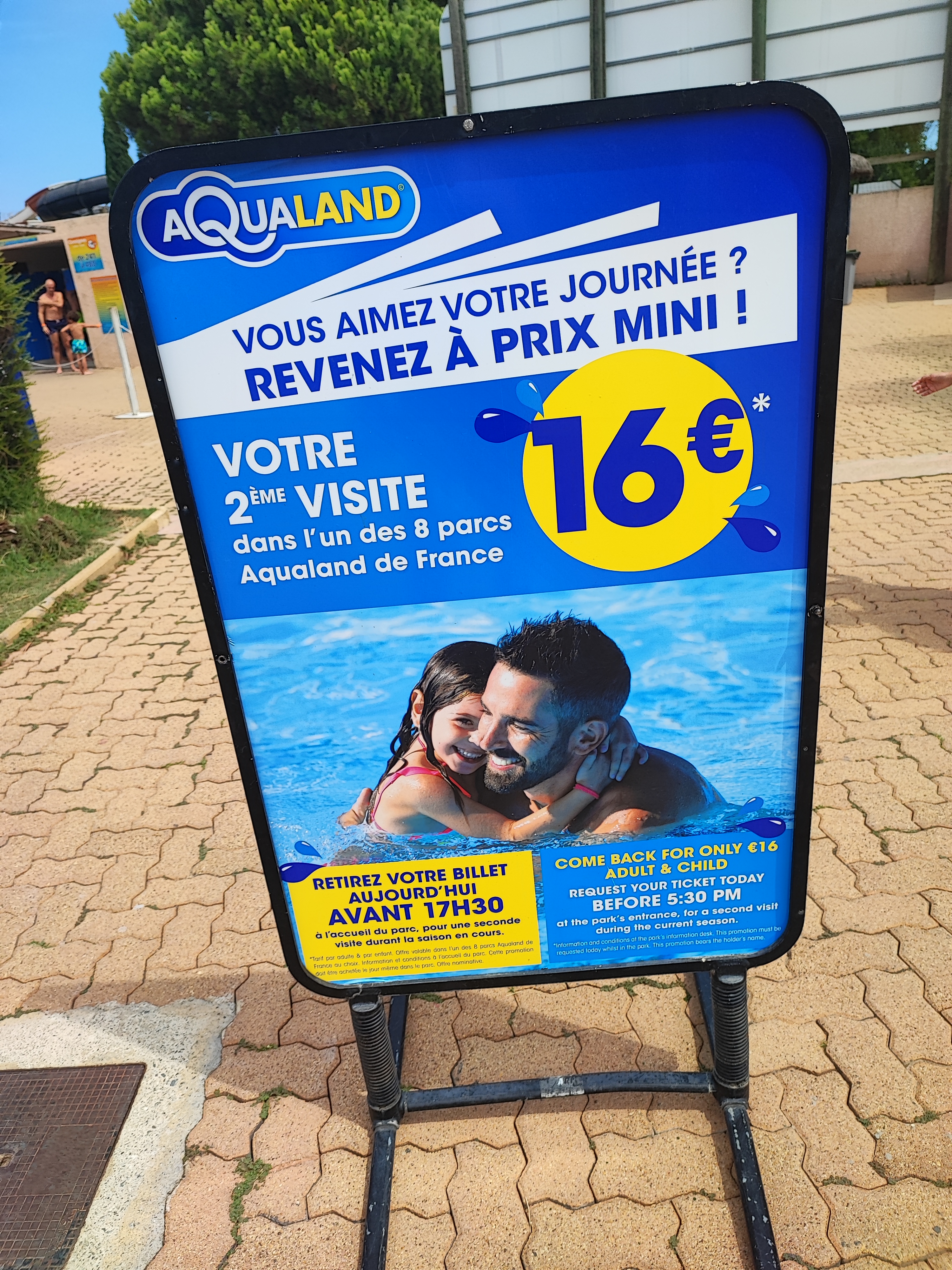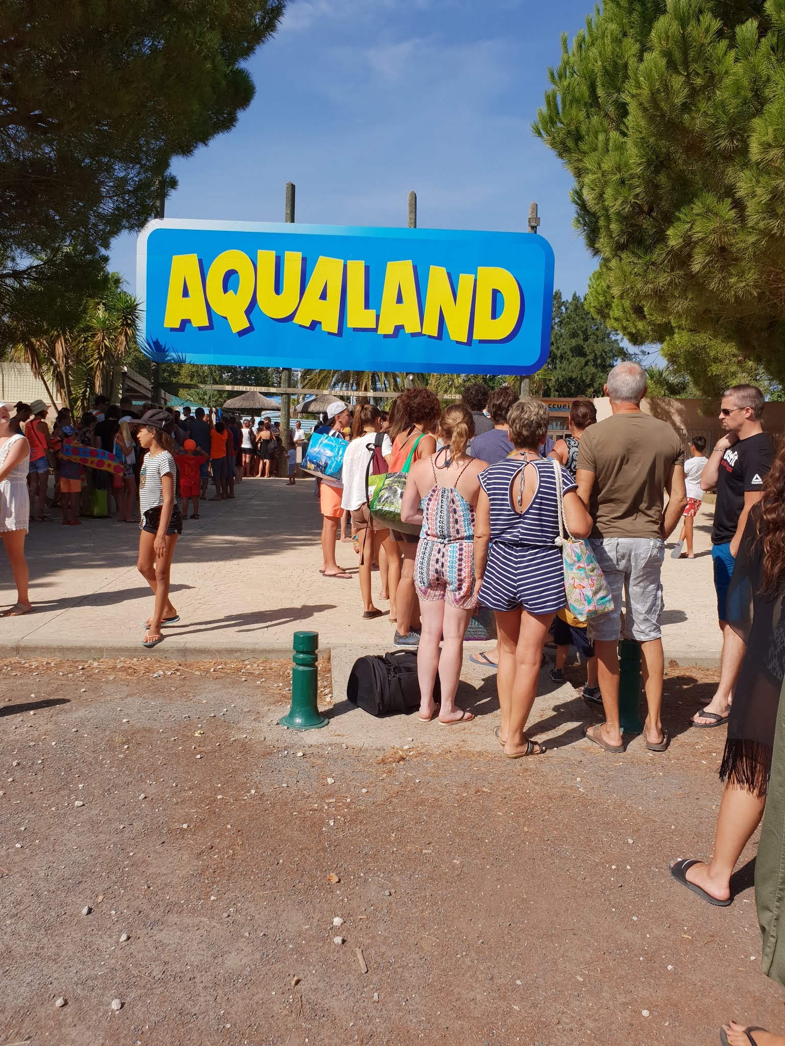 Très grand Aqualand. Toboggans de différents niveaux, zone enfants, zone bébé. Pelouses propres et espace repos. Pas mal de monde en saison... Les Plus: + grand toboggans, variété et nombre de toboggans + zone enfant, pelouses, ambiance familiale + accès facile, parking facile, propre + magasin sur site pour souvenirs et utile en cas d'oubli : casquette, crème solaire, etc. Les Moins: - file d'attente pour déjeuner (dommage), file d'attente pour casiers en arrivant - longue file d'attente pour les attractions principales Le tarif est d'environ 23 à 28 euros par adulte ou grand enfant, selon les promotions, et à cela il faut ajouter 4 euros pour parking, 4 ou 5 euros par chaise longue, quelques euros pour le casier. Possibilité tarif VIP Fast Pass permet de mieux profiter des attractions mais compter 20 à 30 euros par personne selon les formules. C'est rentable en nombre de passages.