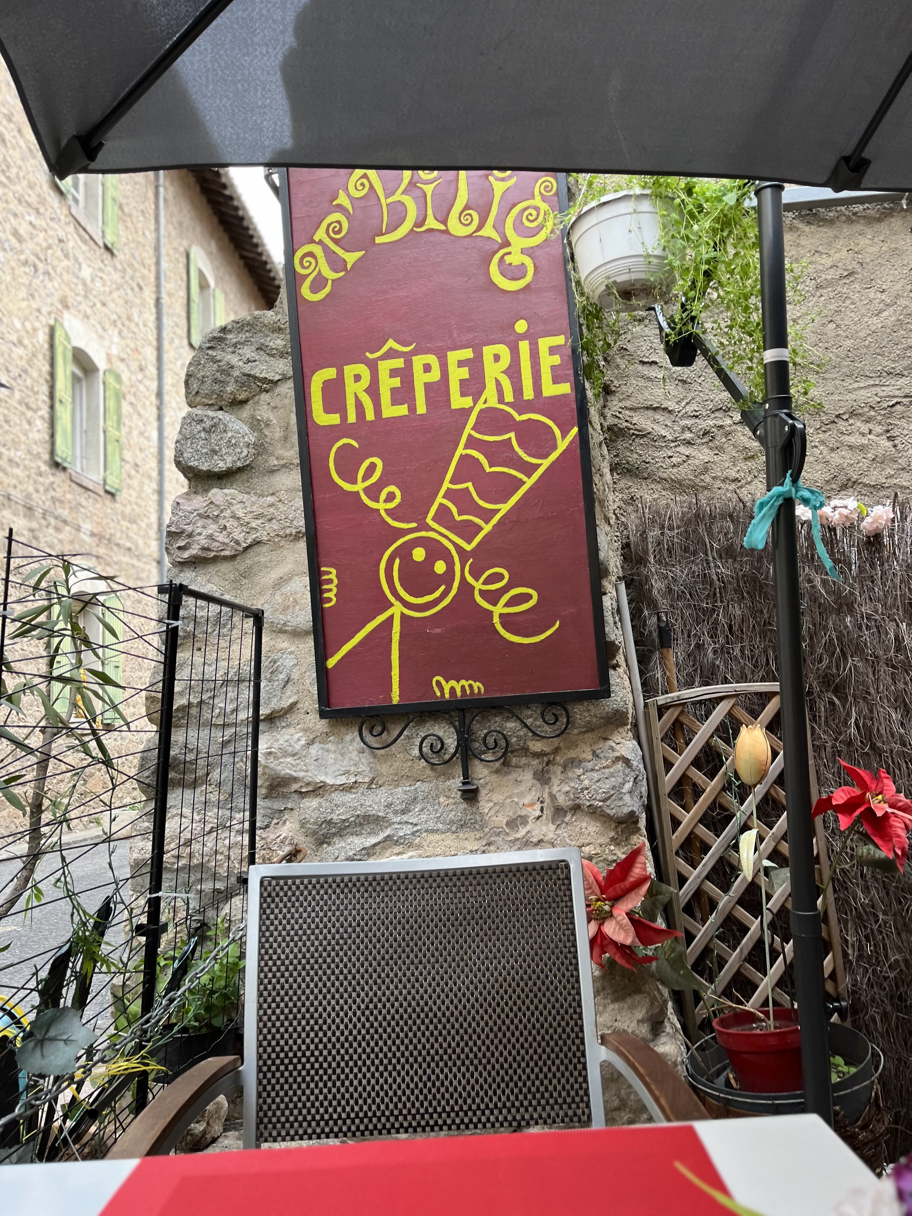 Presque 15h... Et nous avons été accueilli très chaleureusement pour prendre le menu. Choix entre plusieurs crêpes. On se sent chez soi sur la terrasse, et service attentif