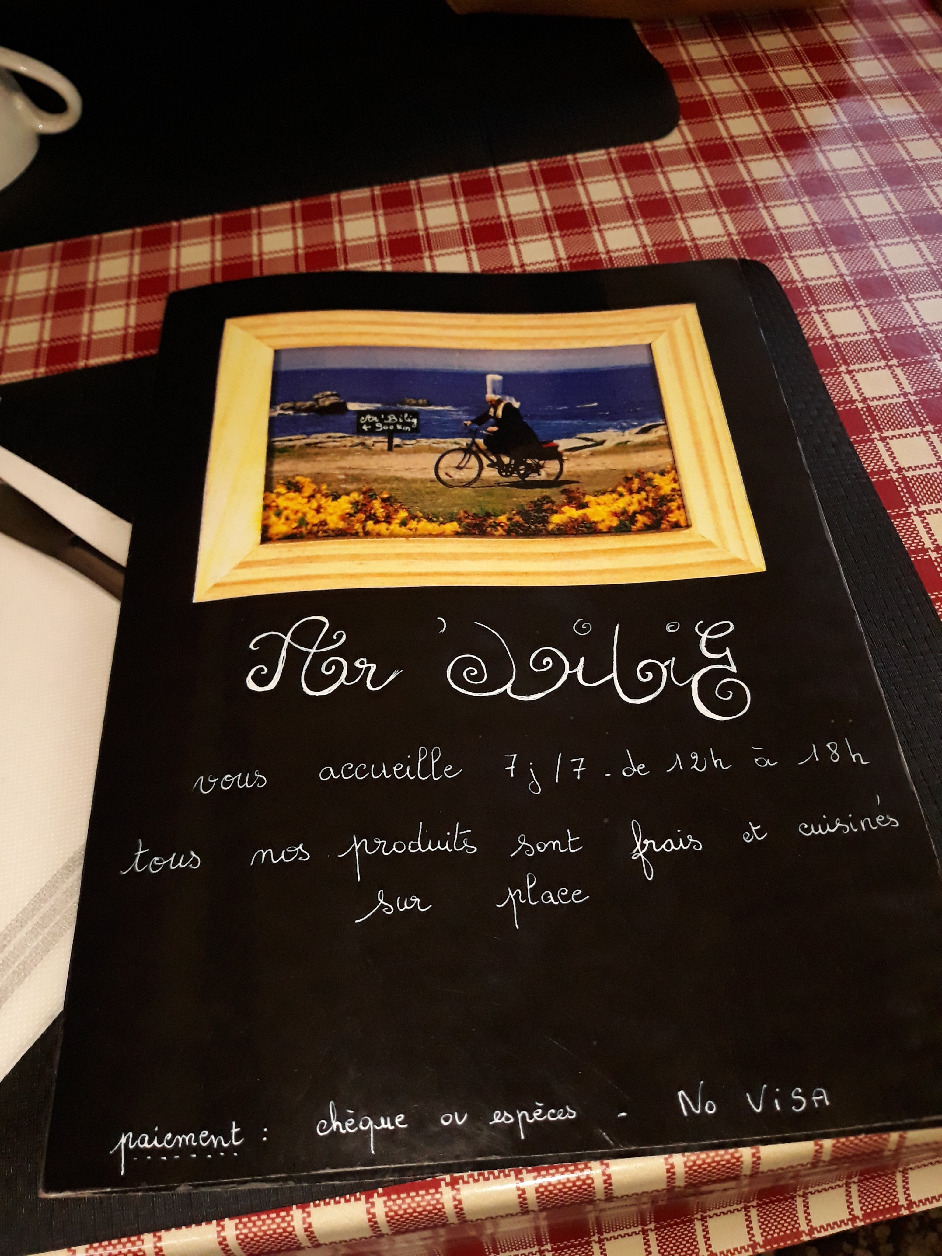 Menu très très bonnes crêpes bretonnes maison produits frais qualités et service agréable Cidre très bon