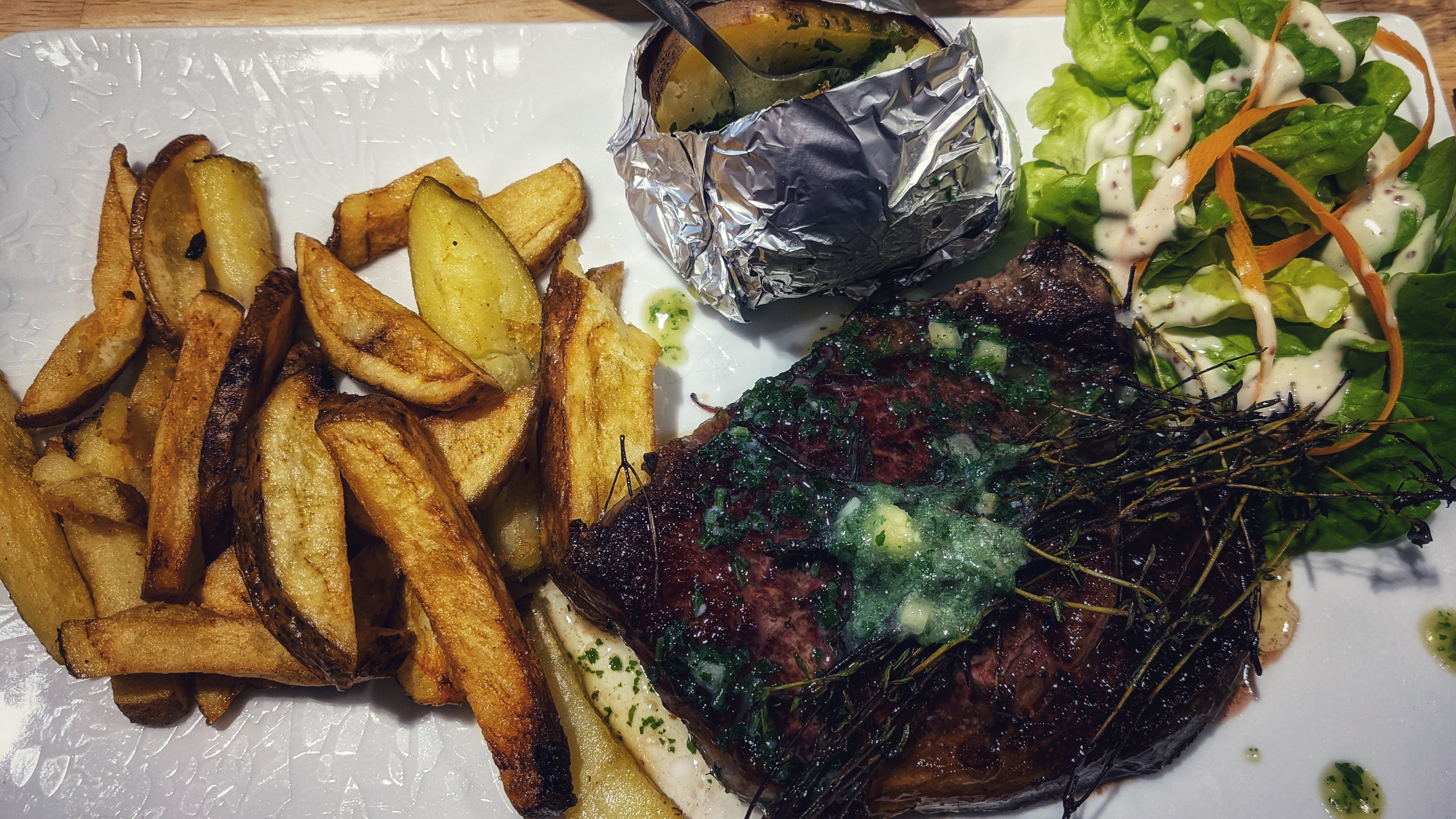 J'ai eu un steak fantastique. Le restaurant était charmant et au fond se trouve une superbe vue sur l'eau. J'ai vraiment apprécié mon steak, avec du beurre à l'ail. J'ai un peu de mal quand ils ne parlent pas anglais, ce n'est la faute de personne d'autre que la mienne, et nous nous en sommes sortis.