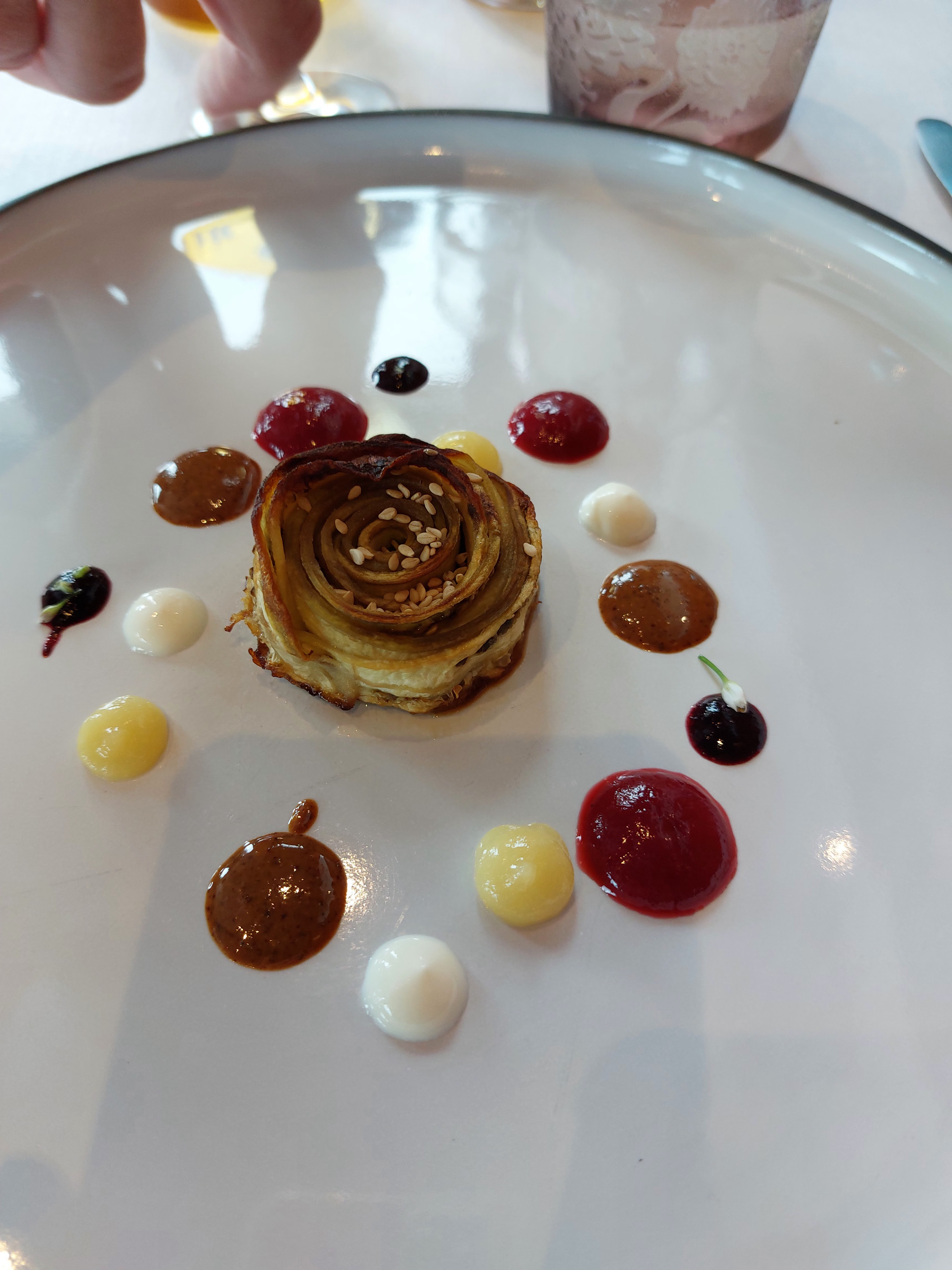 La mélodie des saveurs,une aventure culinaire exceptionnel une vue imprenable et le service Au top avec conseils et attention ne changé rien c'est parfait à tout les niveaux.les circuits courts et les petits producteurs sont privilégiés et ça on adore merci à toute votre équipe pour cette parenthèse enchantée