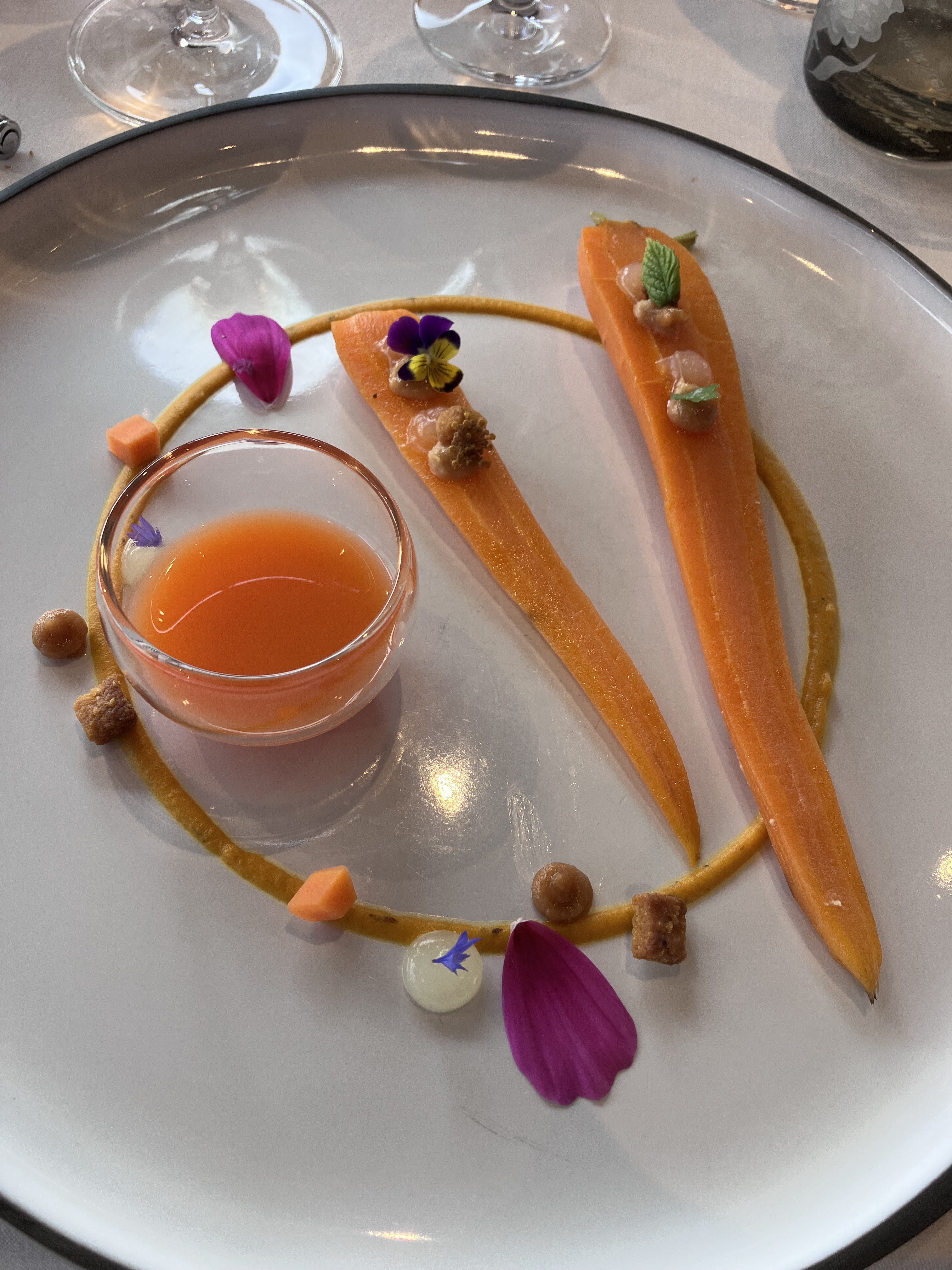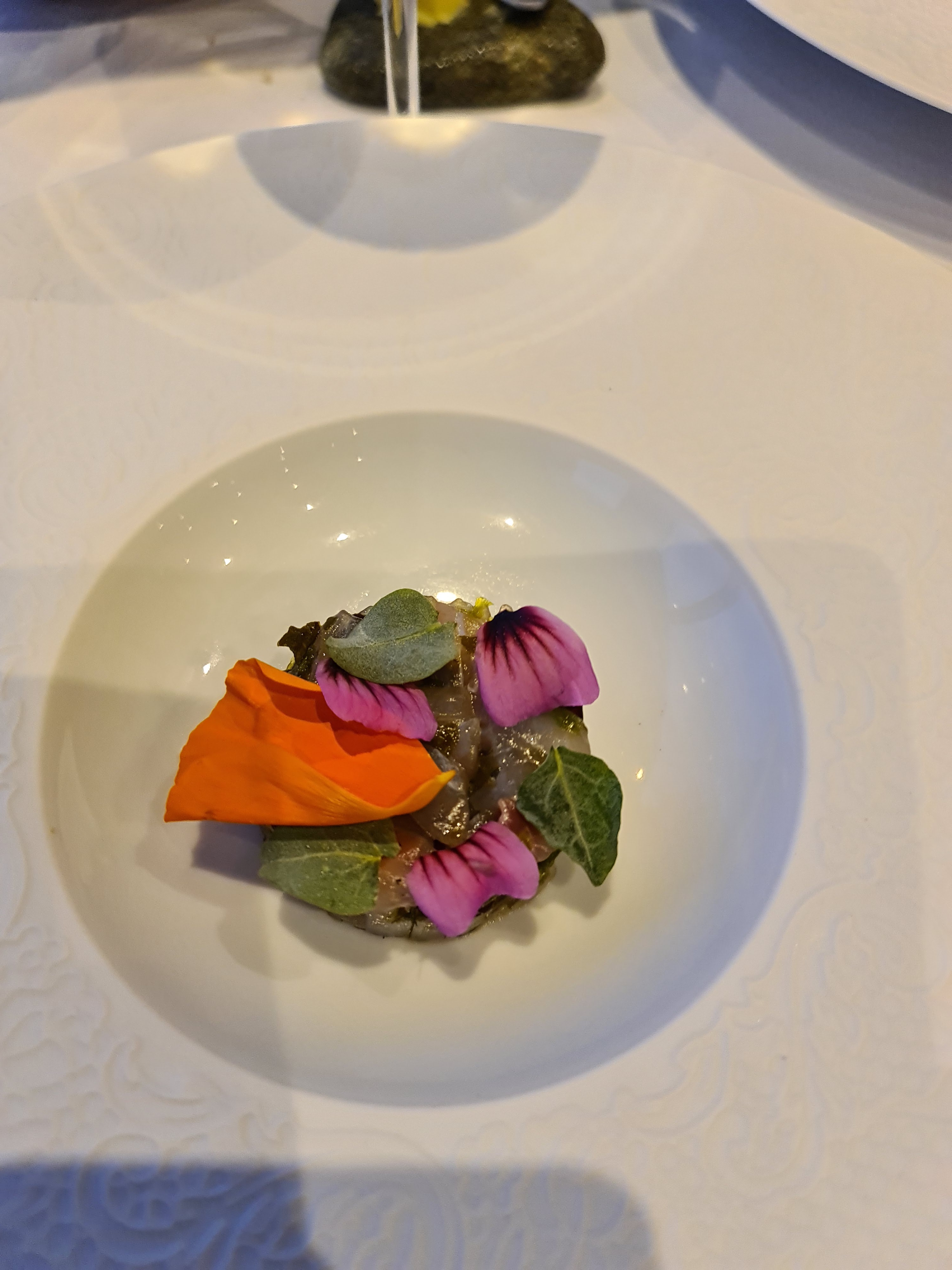 Menu signature du restaurant avec le supplément symphonie de poissons crus en entrée très décevant. D'abord, la composition du menu avec ce qui pourrait s'apparenter à une première entrée qui n'est qu'une mise en bouche. Intérêt gustatif du poisson cru pêché selon une méthode traditionnelle japonnaise (ikejime) n'est pas à la hauteur de l'attente. La quantité dans les assiettes reste insuffisante et on repart , malgré le nombre de plats, avec une sensation de faim ( une première dans un restaurant étoilé). Seule bonne surprise, le pré-dessert qui n'est pas annoncé dans le menu. Prévoir un supplément pour un plateau de fromages si vous le souhaitez. Le service est agréable et les conseils du sommelier très appréciables. Le cadre, quand à lui reste exceptionnel.