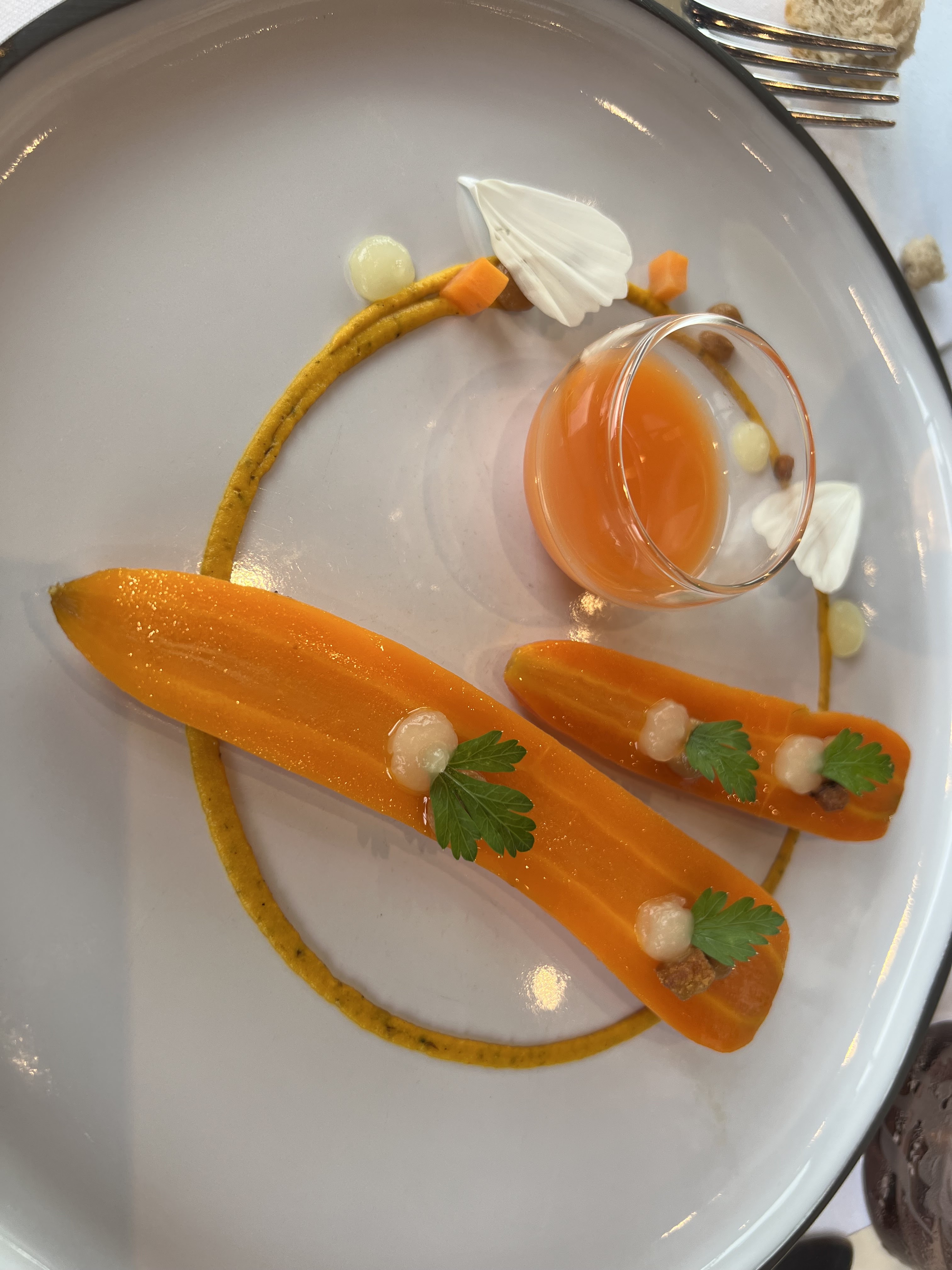 Déçu par le menu signature. Plats très jolis, bons produits, mais aucune surprise, ou complexité en bouche. J'ai trouvé que seul le dessert apportait de la surprise. Ma déception a grandi au fil des plats. Je regrette aussi que le sommelier pousse un peu à la consommation. Je dis 2 verres pour le repas, il me dit 1 verre par plat... je dis ok pour 3... puis étant déçu par les plats, je finirai sur 2 verres. Petit-déjeuner pas vraiment la hauteur (toujours de mon point de vue), du jambon blanc (pas du jour) et du pâté pour la partie salé. Note positive dans cette expérience : un excellent massage.