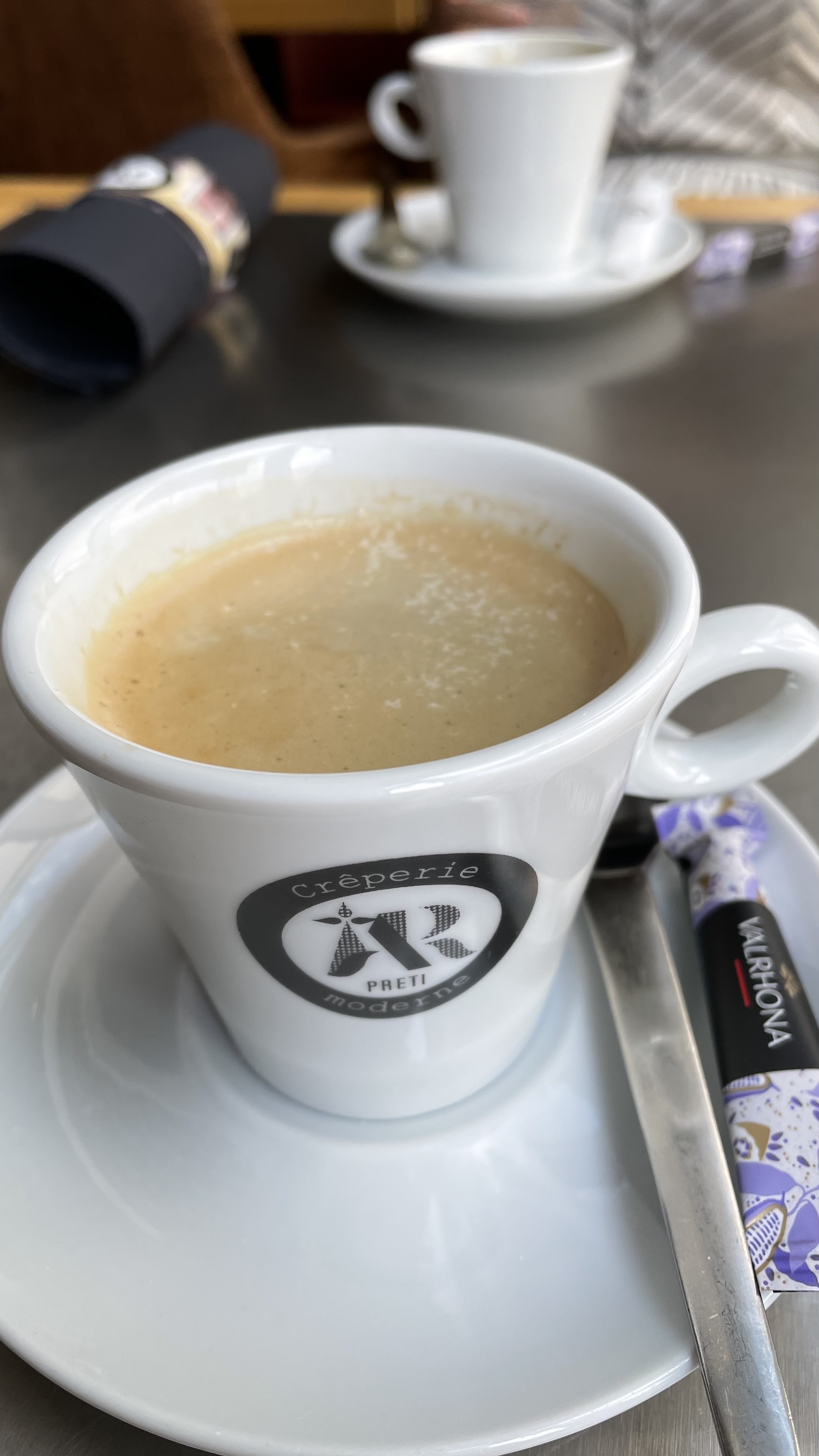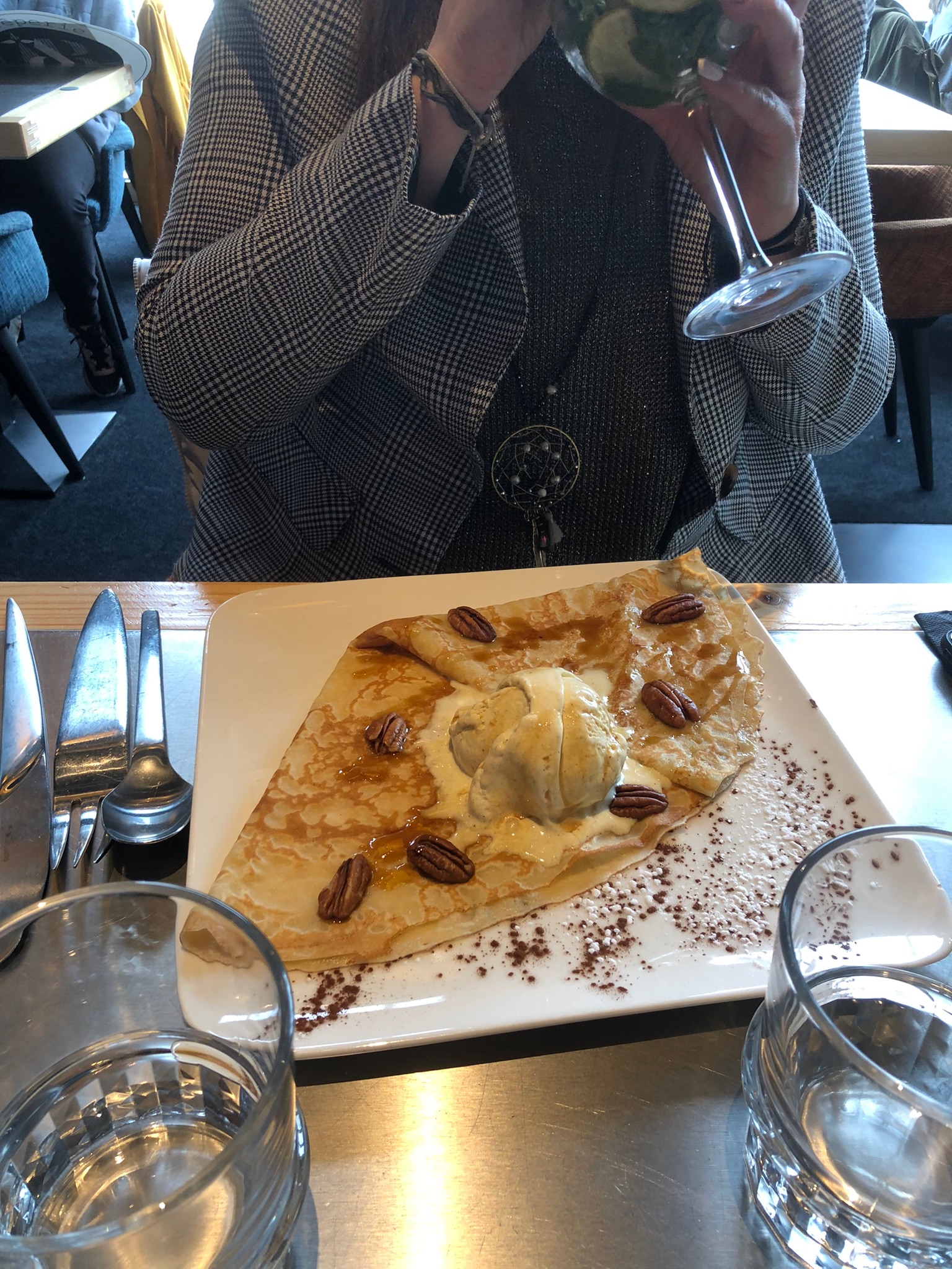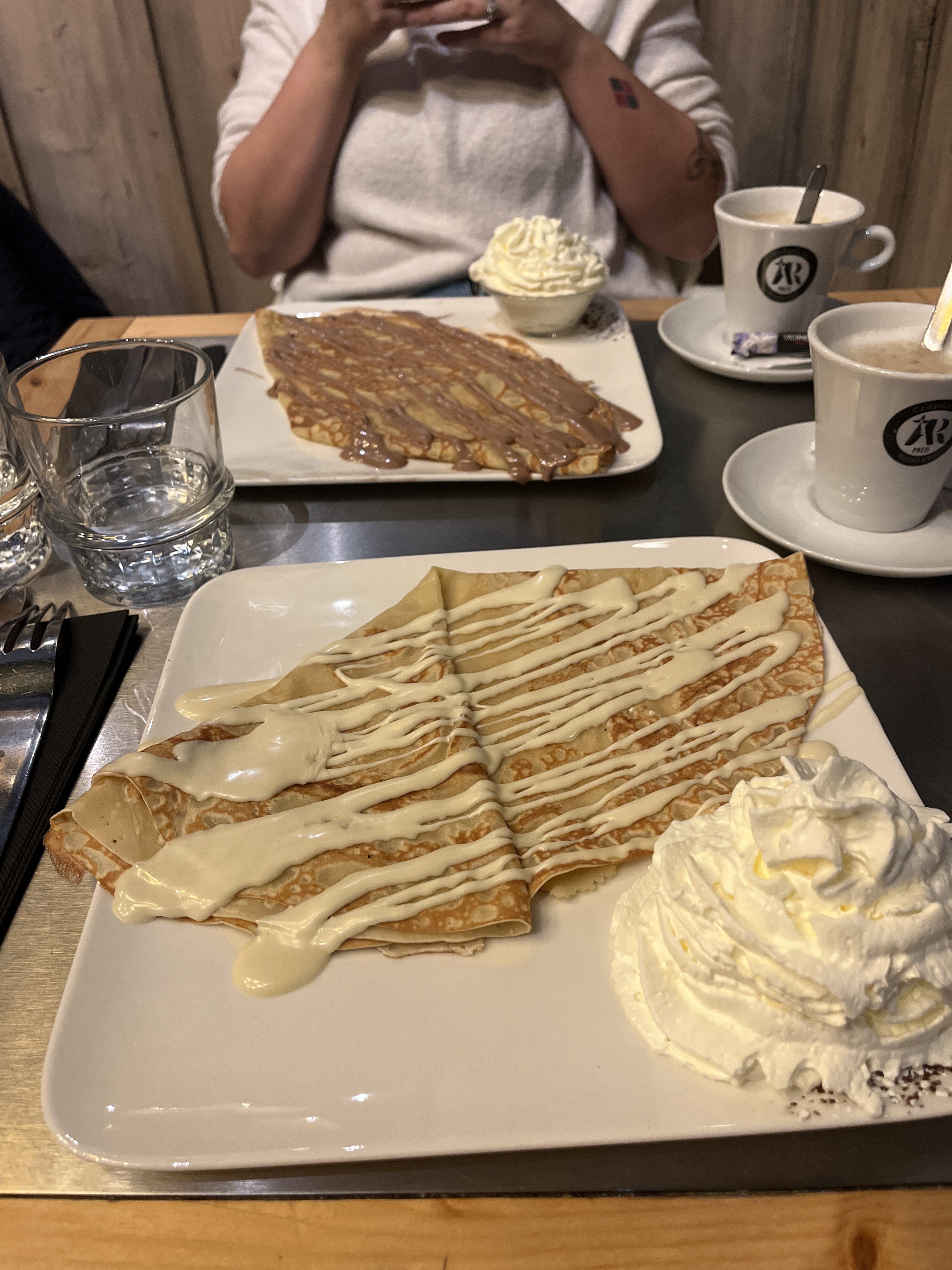 Superbe expérience, installées en terrasse avec des petits plaides mis à disposition par l’équipe de la crêperie qui d’ailleurs est très gentille avec sa clientèle. Les crêpes ainsi que les cafés gourmands sont super bons ! je recommande fortement !