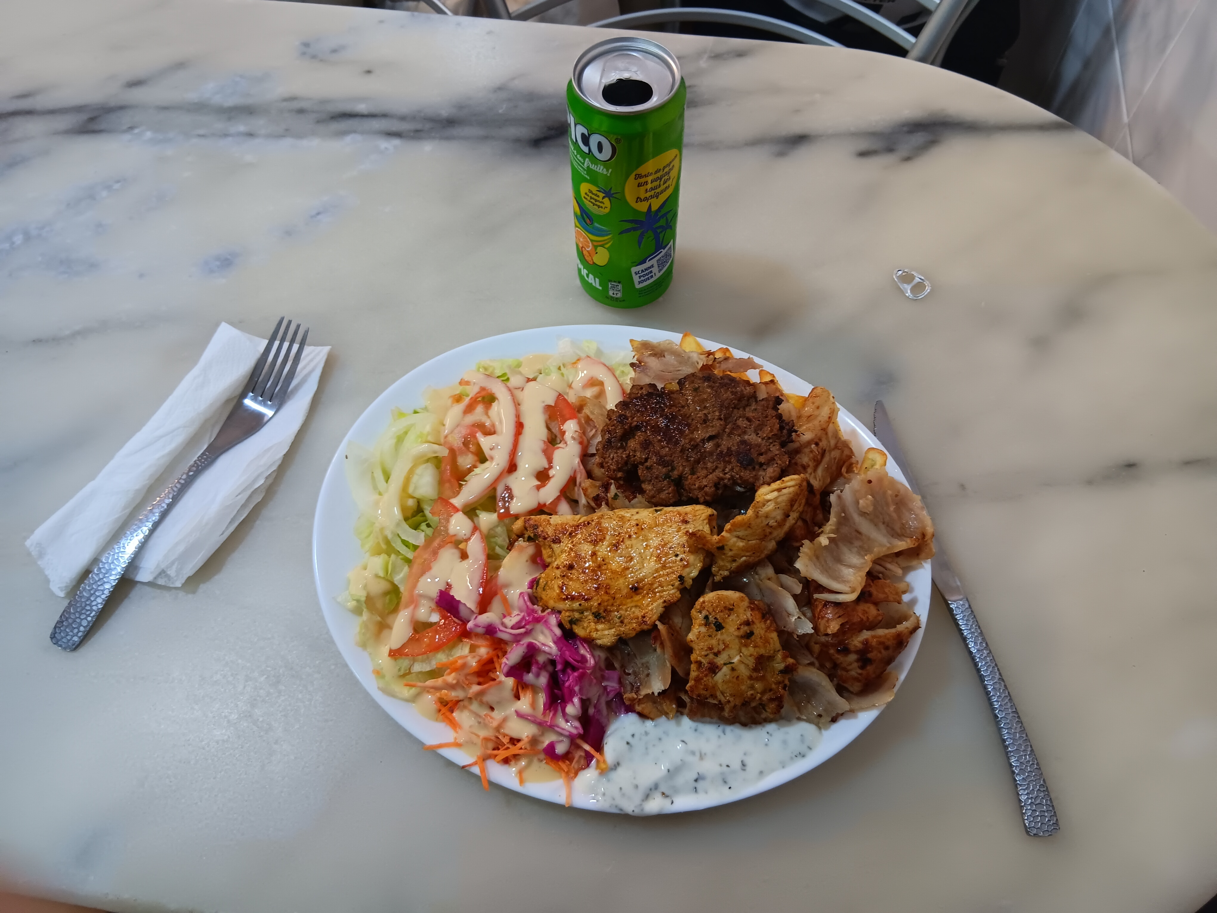Assiette mixte bien chargée. Kefta épicée très goûteuse. Poulet tendre et viande de kebab bonne. La sauce blanche est certainement faire maison.
