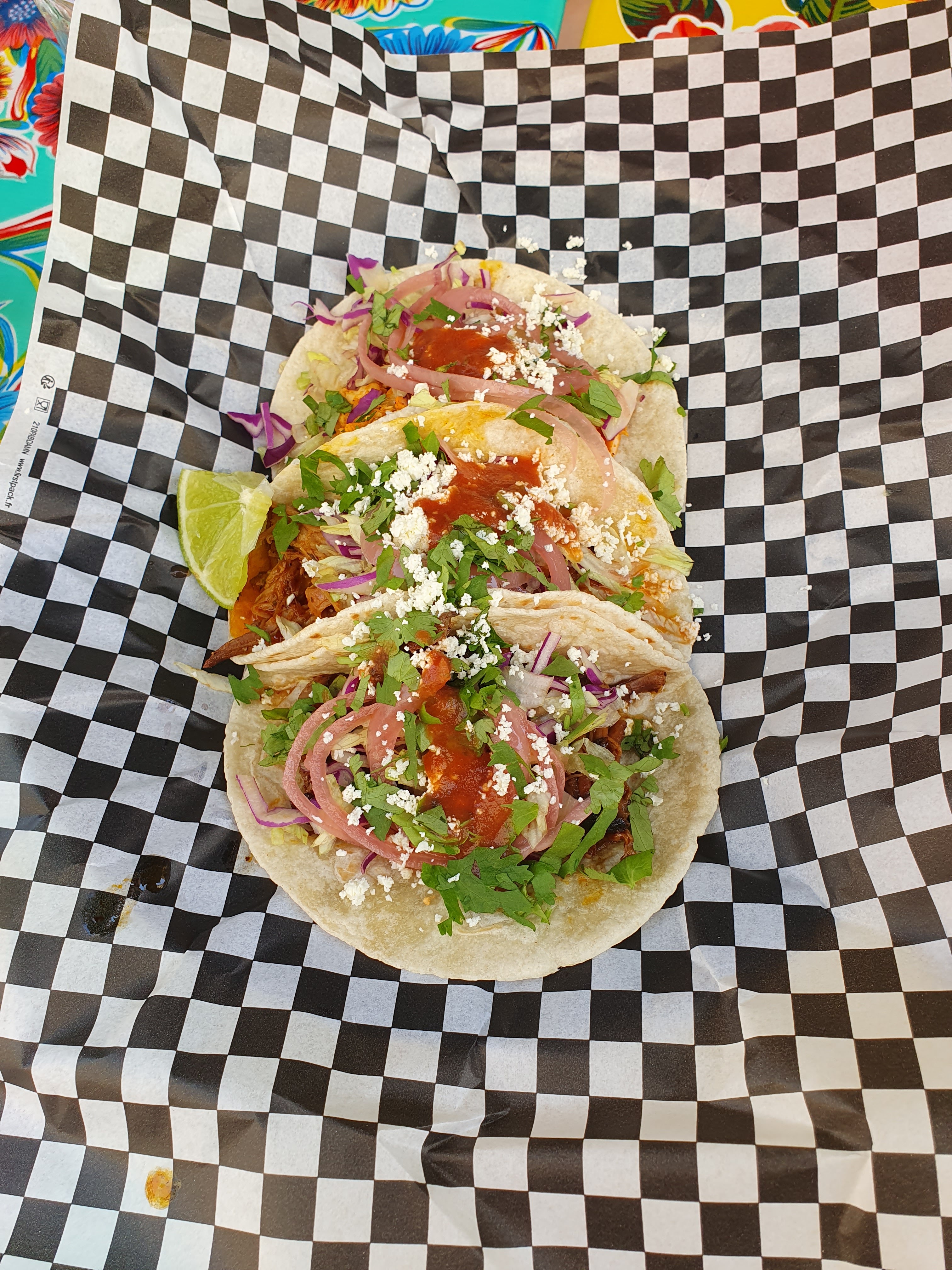 3 petites tortillas de blé ou de maïs garnies d'oignons pickles, fromage frais, mesclun laitue & chou rouge, coriandre, citron vert, sauce (9 €) On a pris un au porc, un u poulet et un au bœuf gros coup de cœur pour celui au bœuf, je ne connaissais pas et ça fait déjà 12 ans qu'ils ont ouvert je vous conseil d'y aller dans ce restaurant ;) l'accueil est top en plus