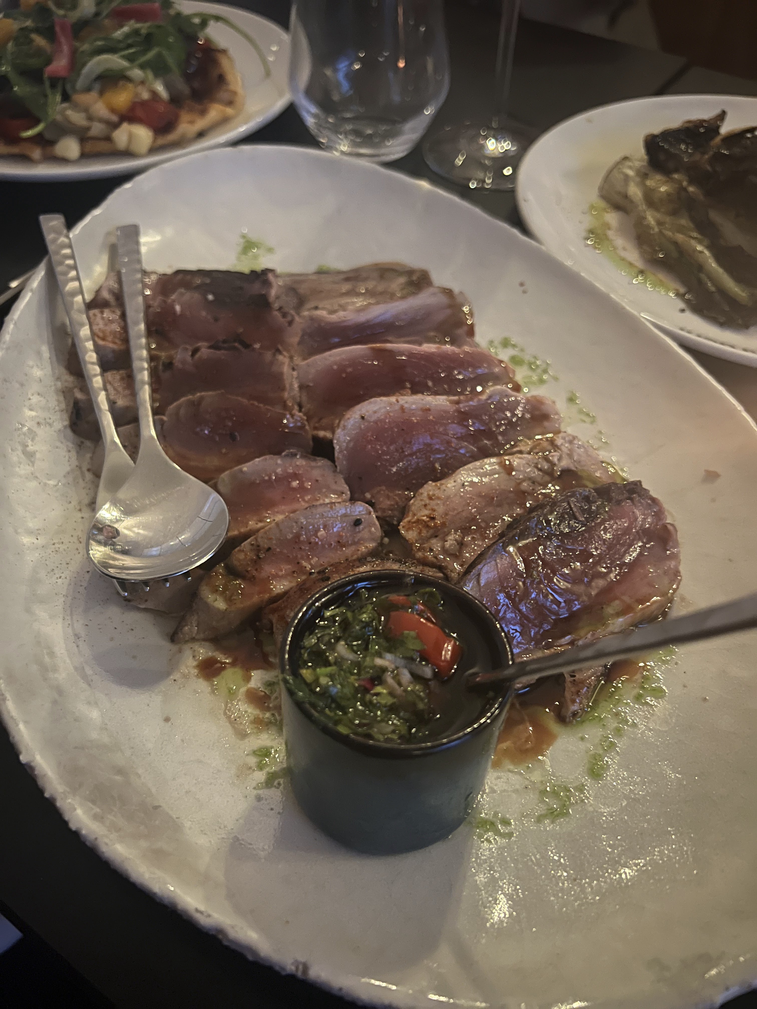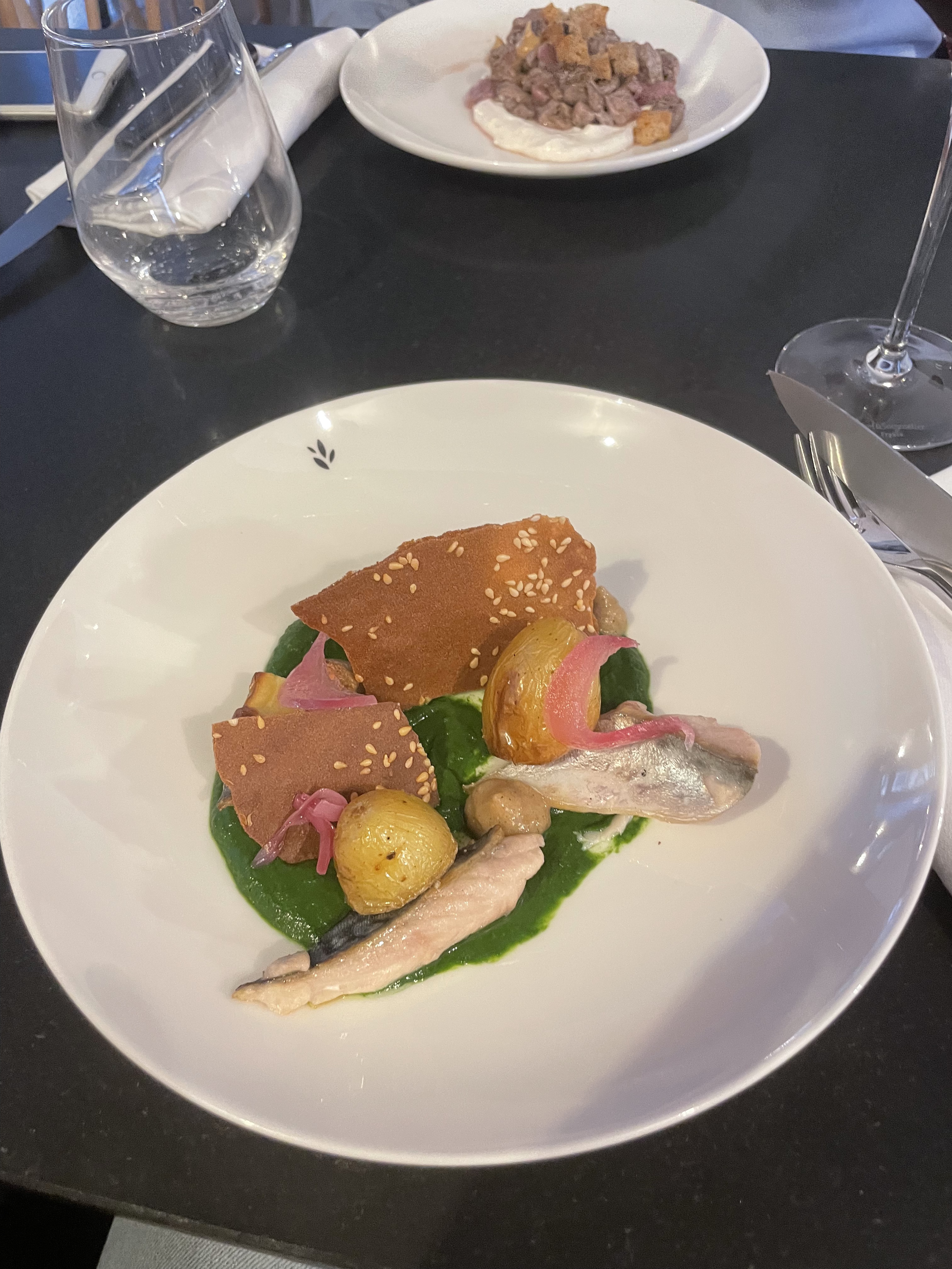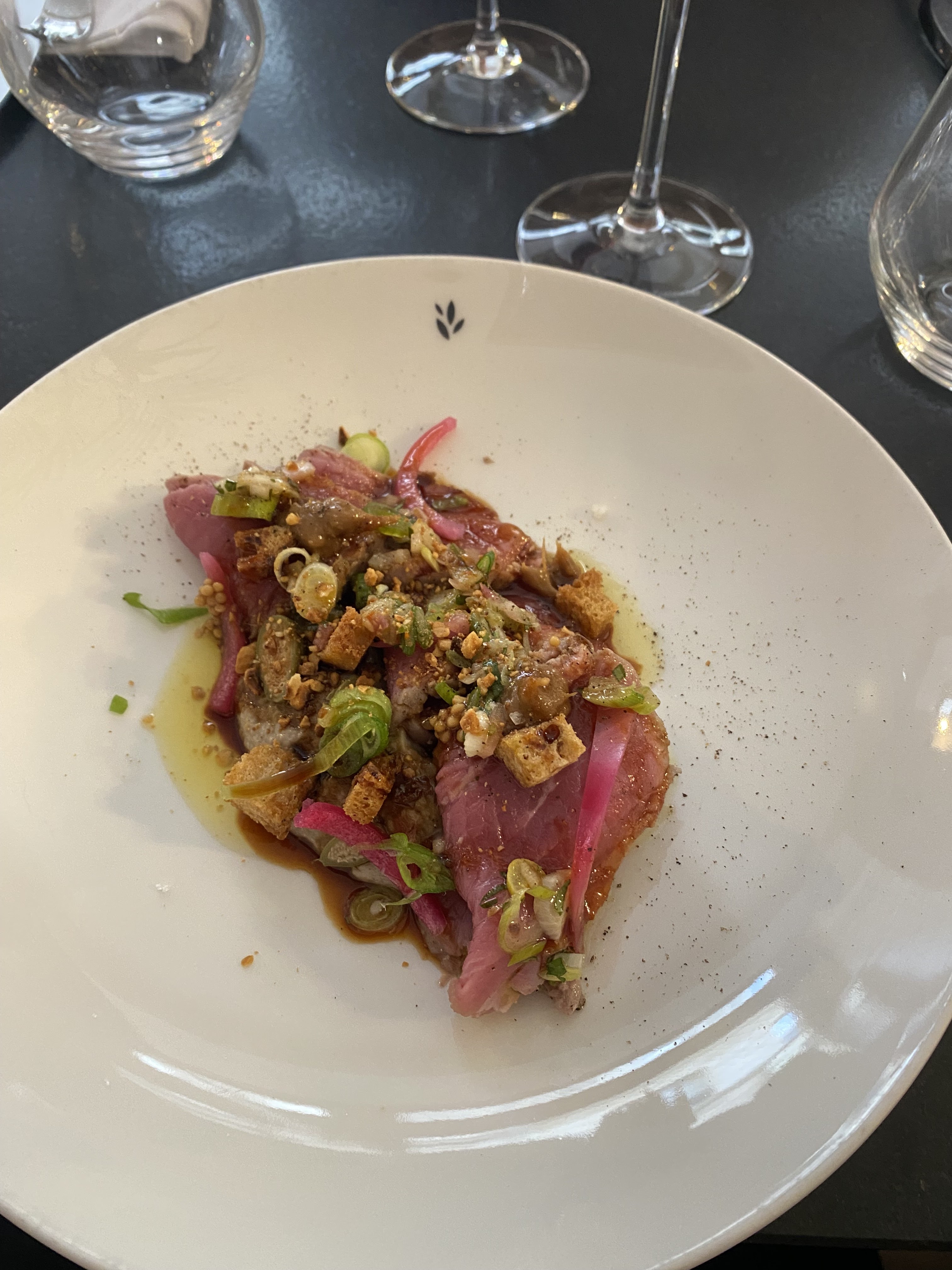 Très belle découverte Tarama à partager excellent Ris d’agneau avec coques en entrée. C’est très bon, le mélange terre-mer est bien réussi. Thon snacké en plat avec des artichauts. Très bien aussi. Le carpaccio de poulpe manque un peu de peps, peut-être un peu d’agrumes car c’est assez plat dans la bouche. La glace poivron fraise est à conserver, mélange équilibré qui permet à la fraise de ne pas être totalement éliminée avec la puissance du poivron. Super service Deco sympa Bonne playlist Vin chateau d’arlay du Jura très agréable pour accompagner notre dîner