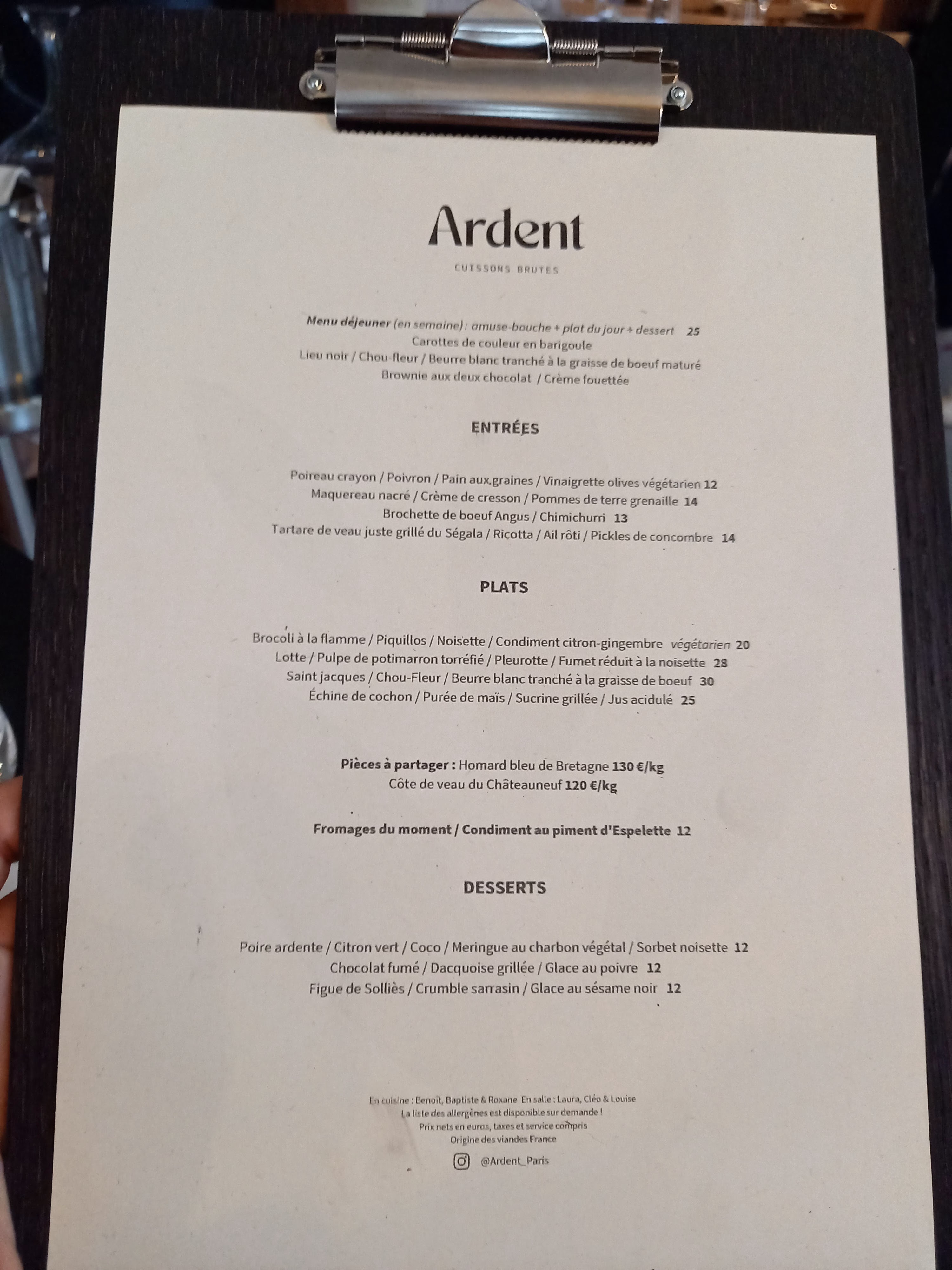 Superbe diner à Ardent Paris. Cuisine savoureuse et originale : la cuisson aux braises, parfaitement maîtrisée, sublime des produits exceptionnels (mention spéciale pour l’échine et la truite). Très belle carte des vins. Personnel souriant et disponible. Déco très soignée. Je recommande a 100%.