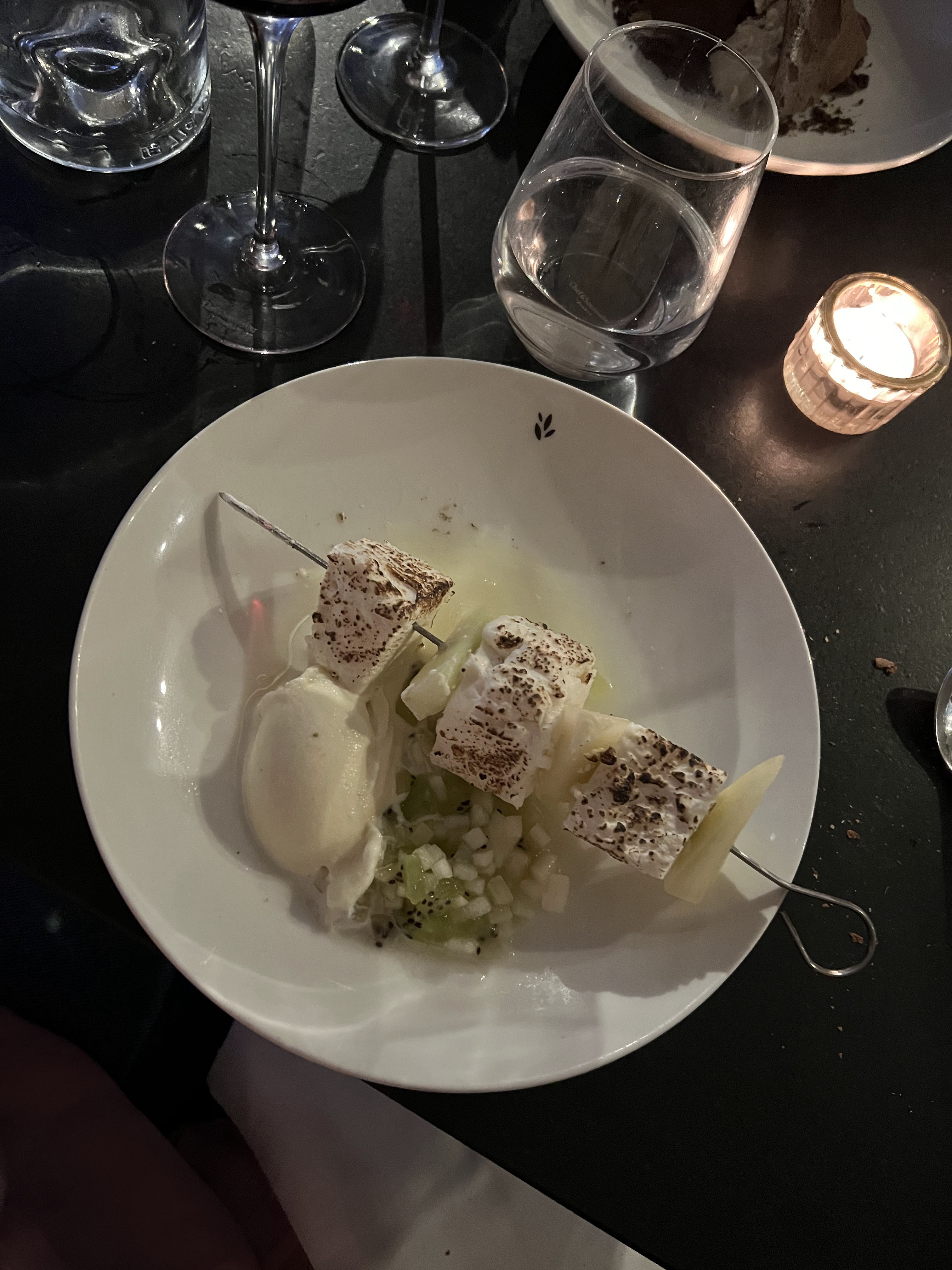 J'ai bien aimé, sans plus. Avec la méthode de cuisson à la flamme je m'attendais à avoir vraiment beaucoup de saveurs incroyables, malheureusement ce n'est pas toujours équilibré. La pizzetta végétarienne est bonne mais on sent beaucoup le brûlé. La mousse au chocolat est très bonne, et la glace au thé fumé vraiment originale. La plupart des softs qu'on a commandés n'étaient pas disponibles. Et l'ambiance est un peu trop tamisée, on ne voit rien à ce qu'on mange et c'est dommage. Il est même difficile de lire le menu ! Il faut faire quelque chose avec l'éclairage.
