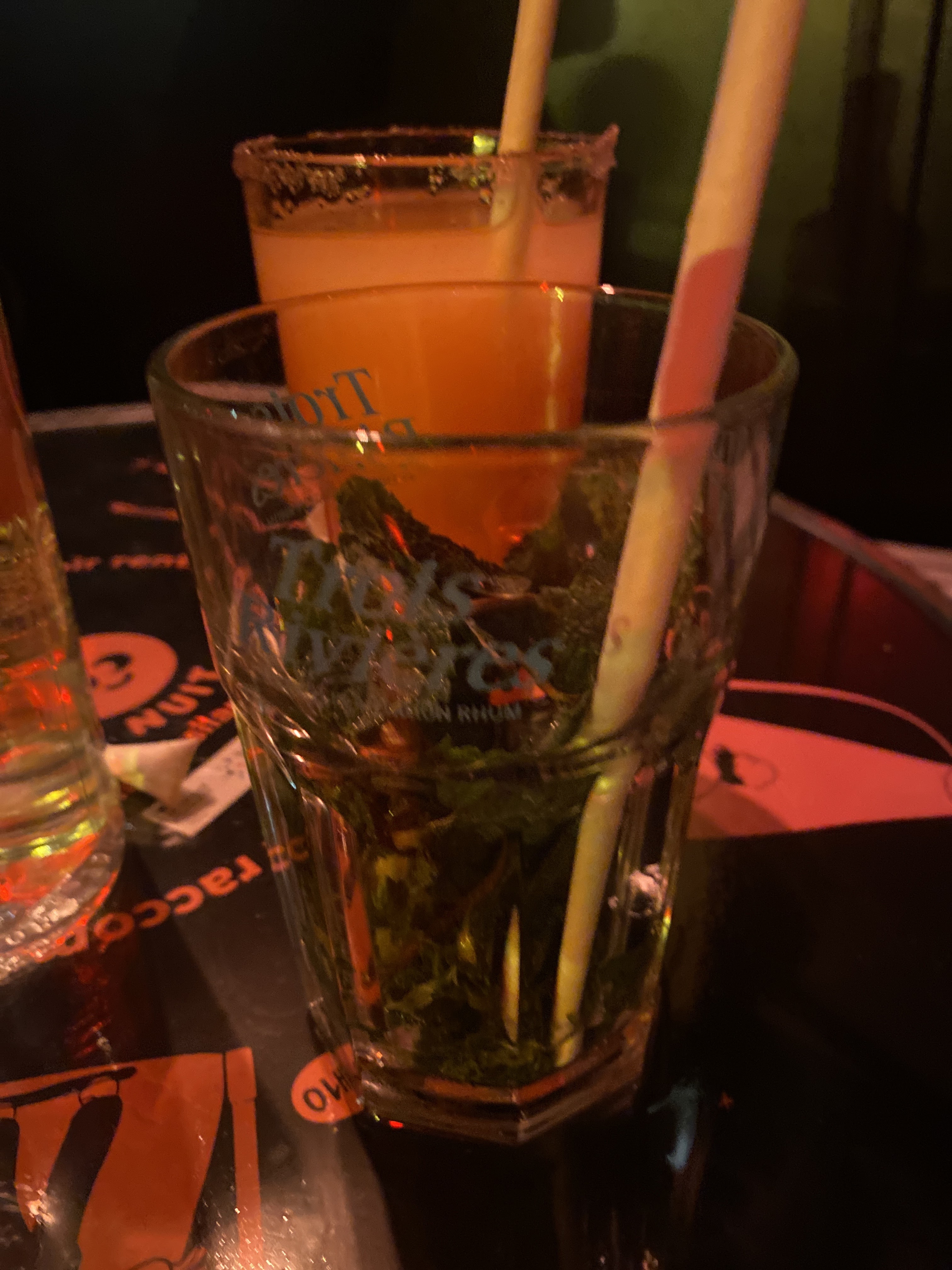 Mojito prêt en 5 secondes (déjà fait à l'avance je pense) 2cm de sucre au fond. Goût pas top. Intérieur un peu vieillot et pas très chaleureux.
