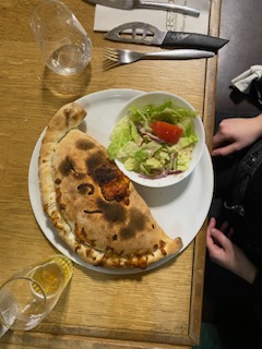 Déjeuner d’une délicieuse Calzone au bœuf haché, énorme, pleine de fromage comme j’aime et une bonne pâte à pizza. Bémol : les tarifs, excessifs pour des pizzas 19,5€ la calzone. Atout : le service (Sebastien), attentif, plein d’humour et très serviable.