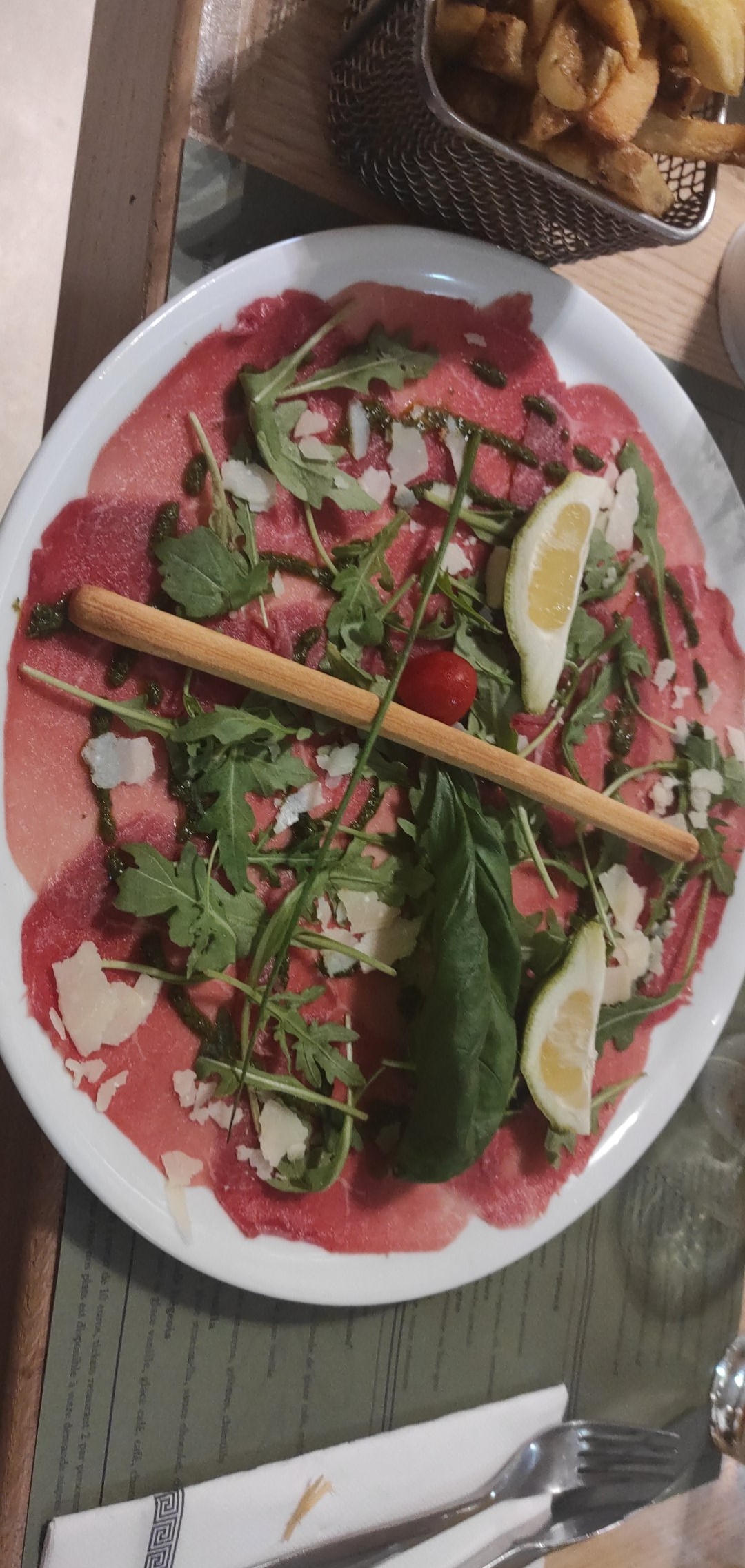 Nous étions Adultes très bonnes salades au chèvre, ainsi que la pizza et le carpacio de bœuf