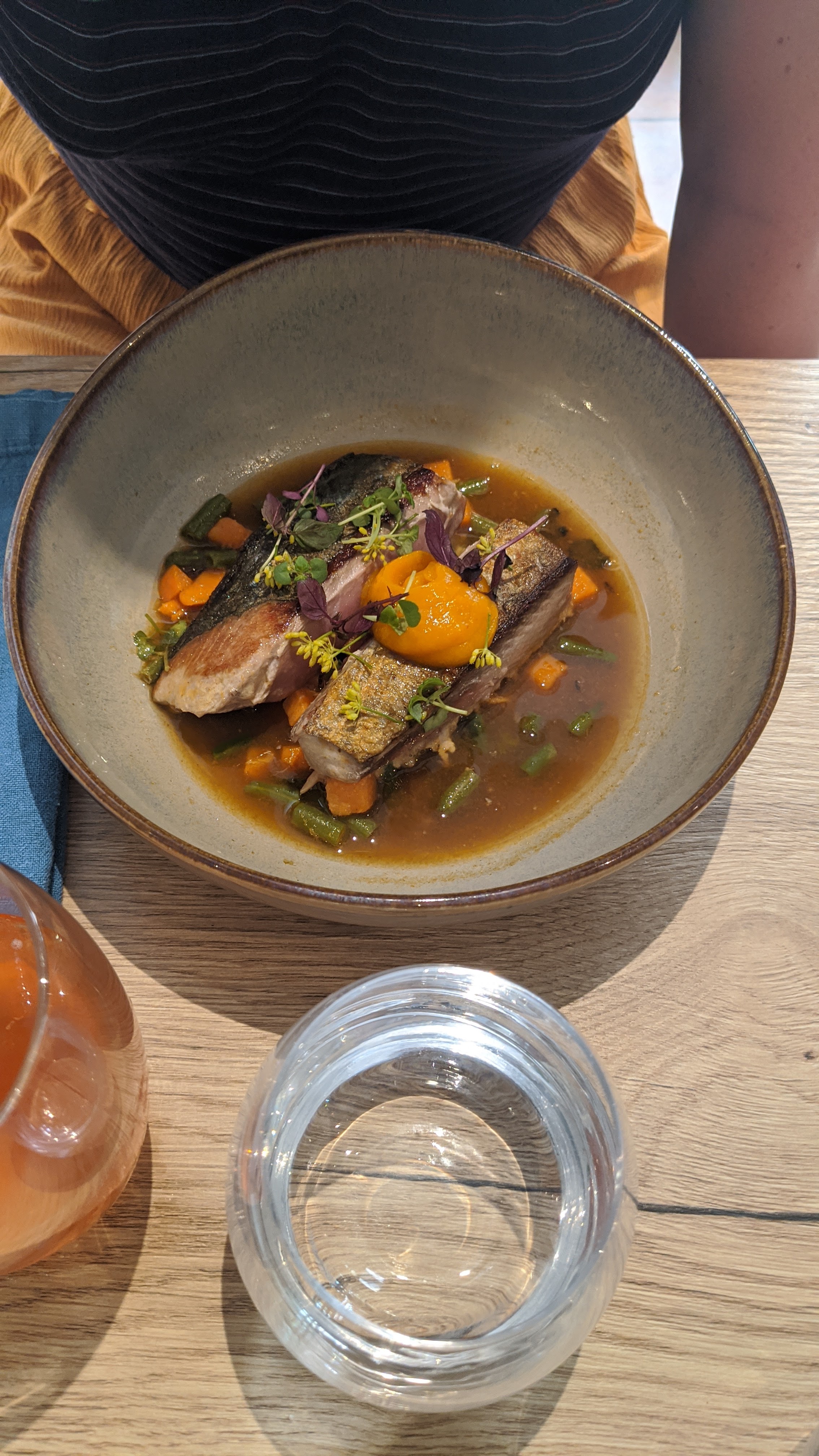 Pas mal, je m attendais juste a mieux vu les commentaires et les recommandations trop advisor et Michelin. Le poulpe annoncé a la carte n était plus disponible. Réservation pour midi trente, j annonce commencer par l entrée et que je prendrai après éventuellement un plat si j avais encore faim. Mon entrée terminée ( os à moelle, bon, basique, malheureusement on ne m a pas proposé de pain toasté, juste du simple) j annonce au serveur quel plat je voudrai, il me dit je vais me renseigner, comme il n' y a pas de monde on va peut être fermer. Fort heureusement j ai eu le droit de continuer mon repas. Je pense néanmoins que c était maladroit. D autant plus qu on ne mettait pas longtemps à manger et je rappelle que nous avions appelé, une heure et demi avant, pour réserver. Plat, un saumon ( poisson qui varie selon arrivage) associé a des saveurs de fenouil gingembre et coco, ensemble assez mou en texture mais les goûts étaient harmonieux même si un poisson blanc aurait été plus adapté pour mon palais. L ensemble était bon, les proportions bien aussi. Le service était agréable si on ne tient pas compte du moment où j ai cru que je devais partir 20 minutes apres être arrivée en ayant encore faim. La déco est chouette. Le resto est plein de fenêtres donc très ouvert sur l extérieur et c est plaisant. Une carafe d eau est apportée directement à table sans que nous ayons demandé, ce qui était bienvenu et attentionné. Au final la facture était un peu plus élevée que celles des autres resto de villages a visiter qui proposent des plats bien moins cuisinés, donc le tarif est cohérent