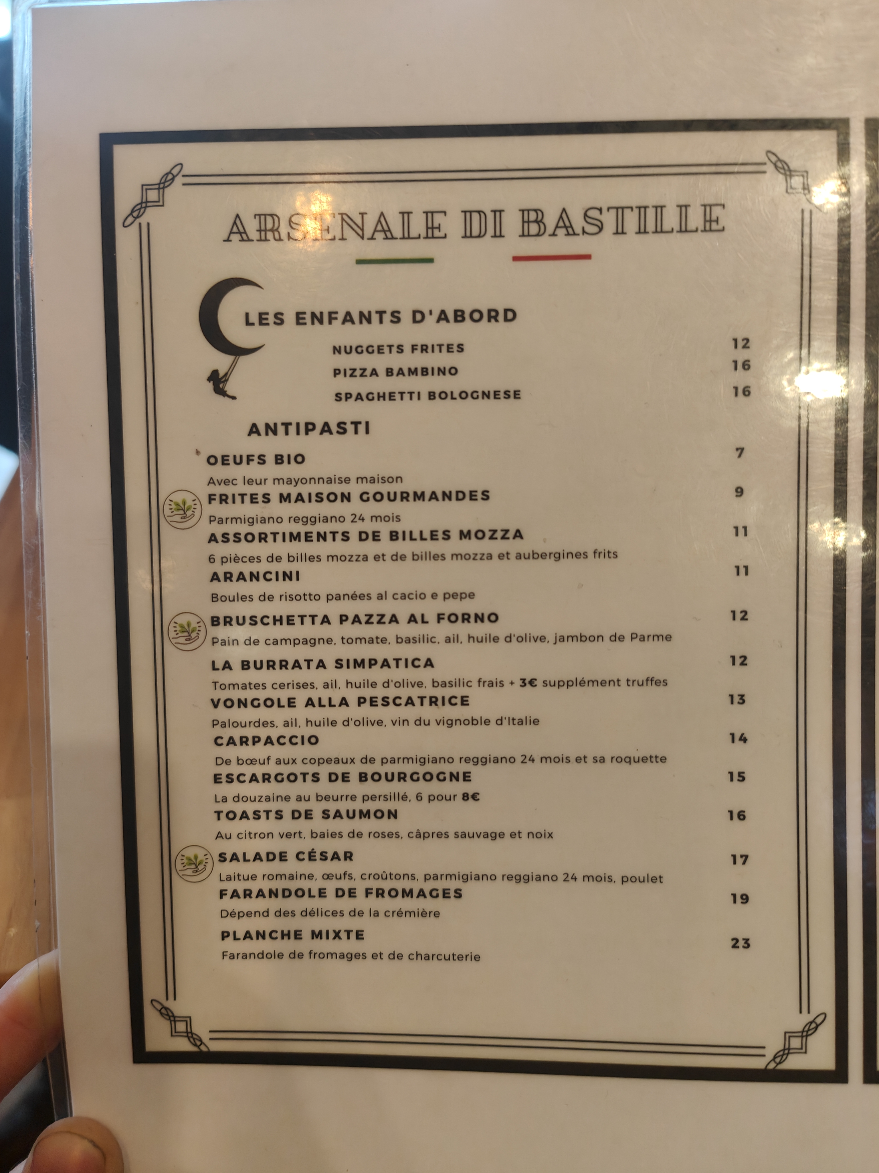 Si vous souhaitez manger de la gastronomie, italienne et familiale, et que vous êtes dans le quartier de Bastille, aller à l’arsenal, Tous les plats proposés sont faits, maison et frais, un délice pour les papilles. L’équipe de salle est très chaleureuse et l’ambiance y est famille. Dans un endroit simple et donc chaleureux. On s’y sent très bien, et on ressort de la avec de bonnes saveurs en bouche naturel.