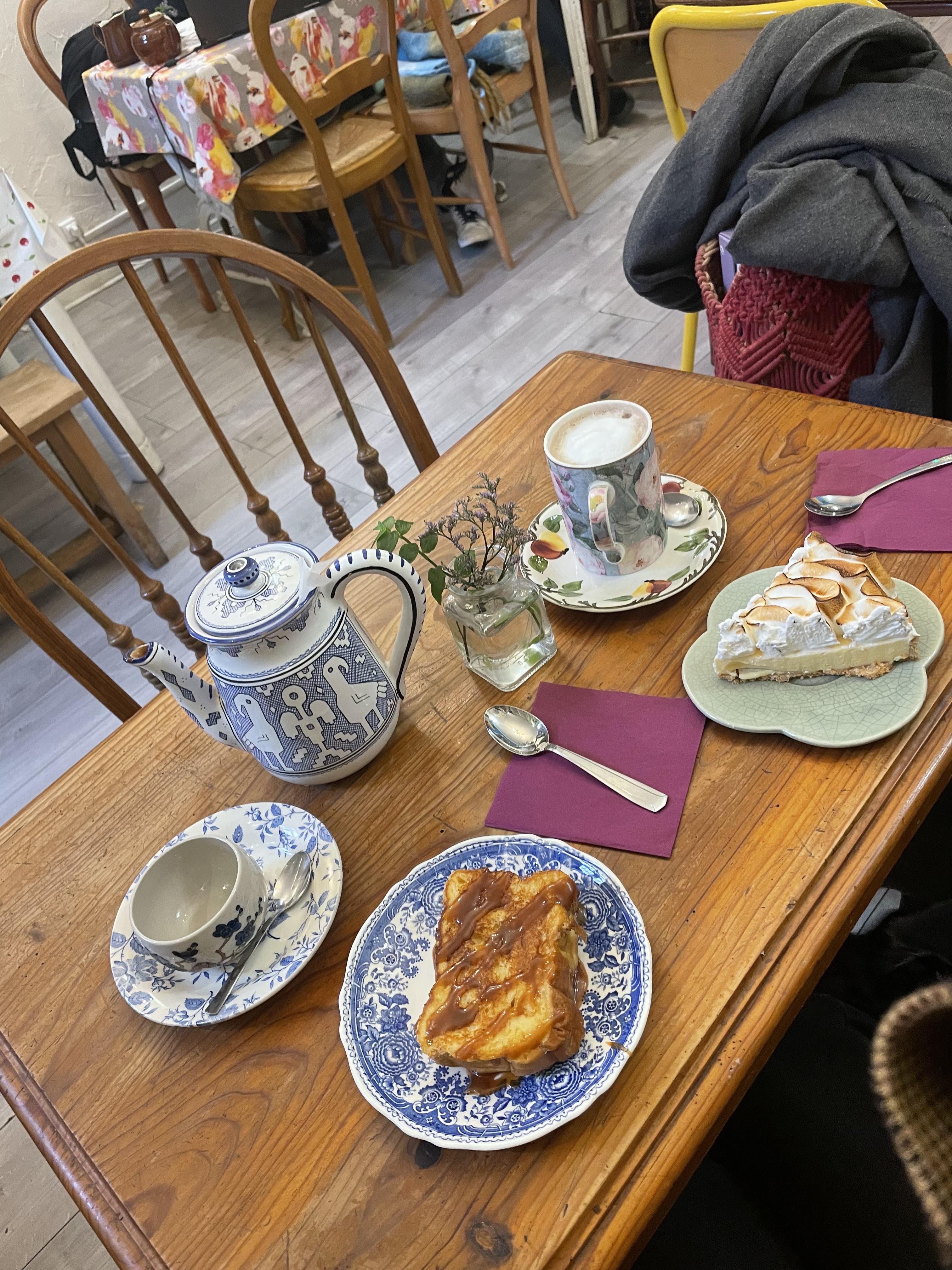 Excellent petit tea shop ! Il y a une énorme sélection de thé, pour le moment mon favori est le earl grey lavande 🪻☕️ La vaisselle est très jolie et unique, en plus il y a même moyen de l’acheter si on a un coup de cœur Les gâteaux aussi sont très bons, copieux sans être lourd, coup de cœur sur le banoffee