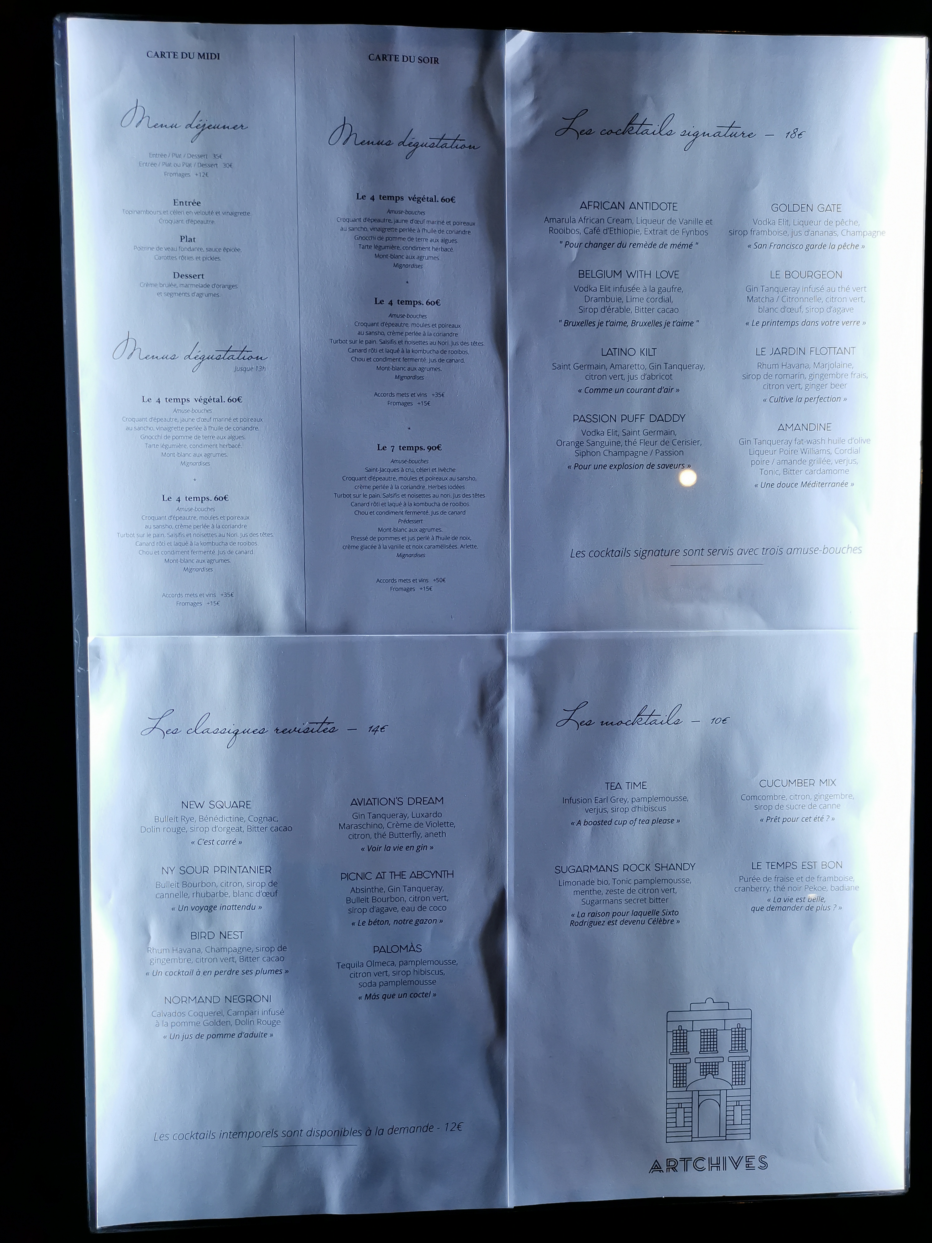 Superbe endroit! Dès votre arrivée vous serez accueilli par un très bon physionomiste et agent de sécurité, une fois à l’intérieur au rdc la magie opère! L’amabilité du personnel, la déco, la qualité du mobilier... la musique les lumières... tout y est! Nous avons commandé une planche mixte délicieuse... large choix de vin et cocktail... plusieurs niveaux... des expos... du design et UN RESTO au 3eme étage! Miam! Bravo à toute l’équipe du Artchives! Nous reviendrons... et bien dès demain avec des amis! Allez y les yeux fermés!