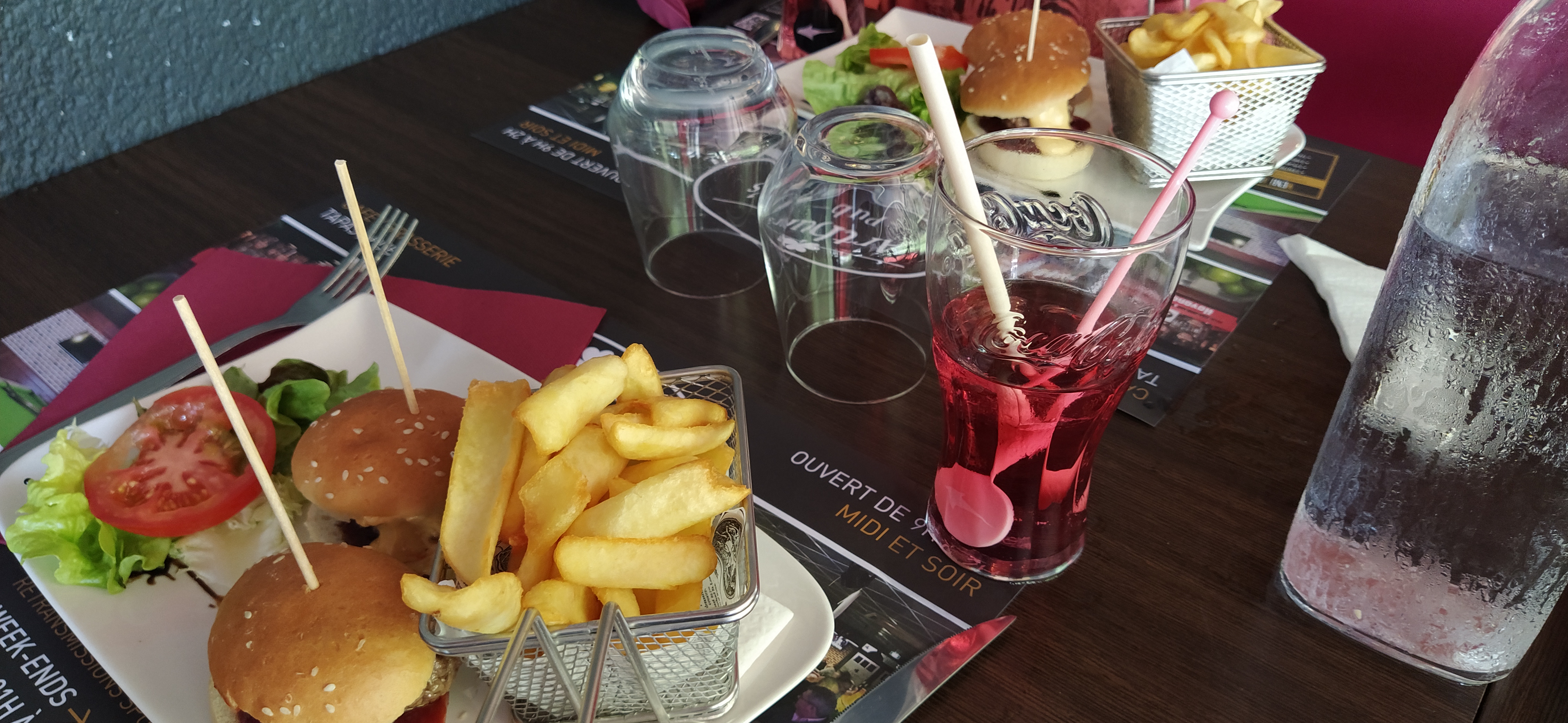 Lieu correct, service trop long , Il faut réclamer les cartes , table pas débarrassée entre apéritif et plat, pas nettoyée obliger de le faire soit même, cuisson des viandes pas respectées, moules froides et trop salées (pour des marinière où est vin et l ail .....) hamburgers froids , frites trop cuites et froides . Heureusement que l'on a pas pris de dessert si non au bout de 4 heures on serait toujours pas parti .