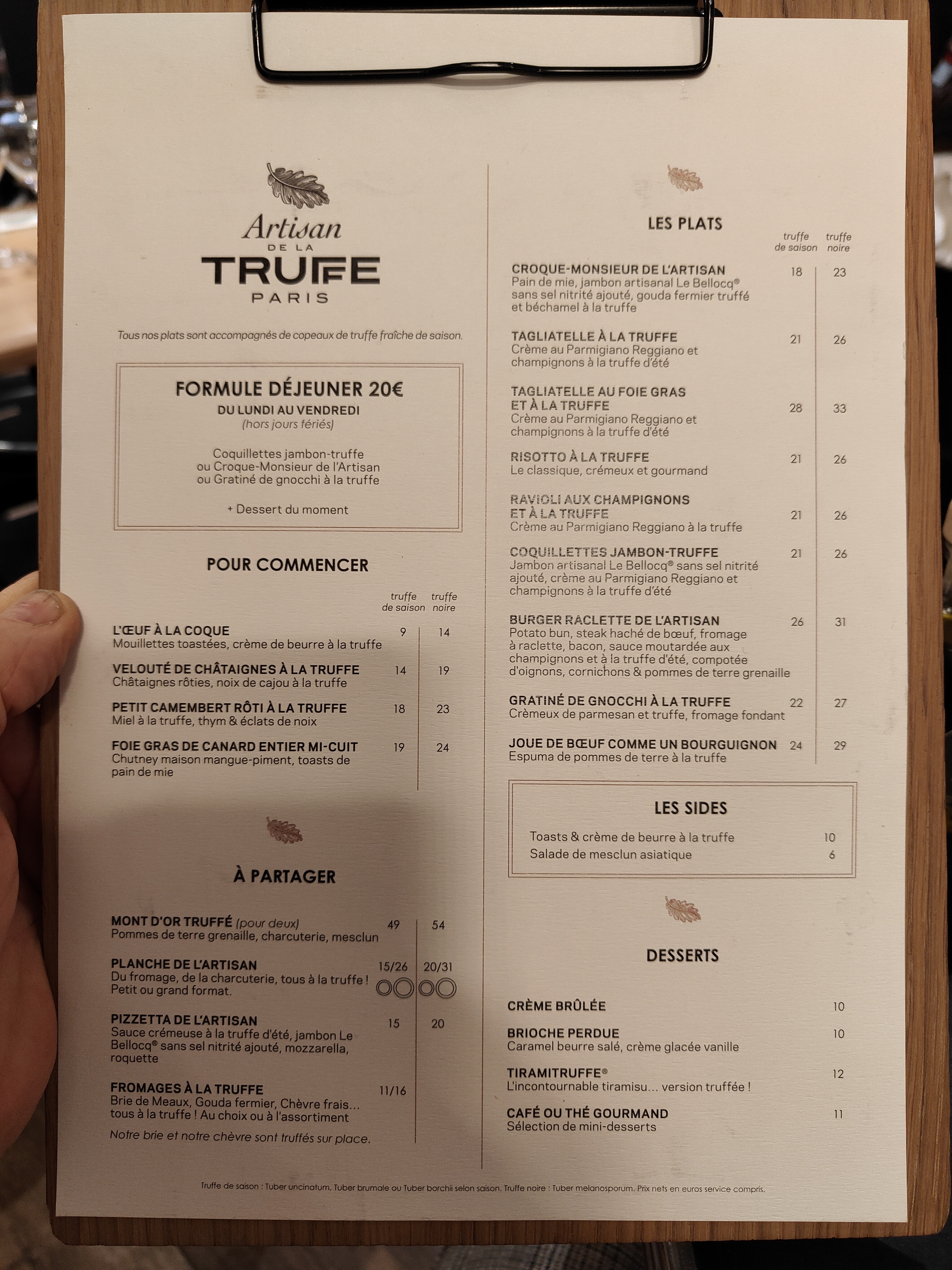 Petit restaurant Parisien qui tient son originalité avec la truffe. La truffe y est partout. De l apéro au dessert. C est un régal. Service irréprochable également, avec un accueil chaleureux. Pour les précédents commentaires qui disent qu il manque le goût de la truffe, avec la truffe noire, le goût est pourtant bien présent, à moins que d avoir la COVID.