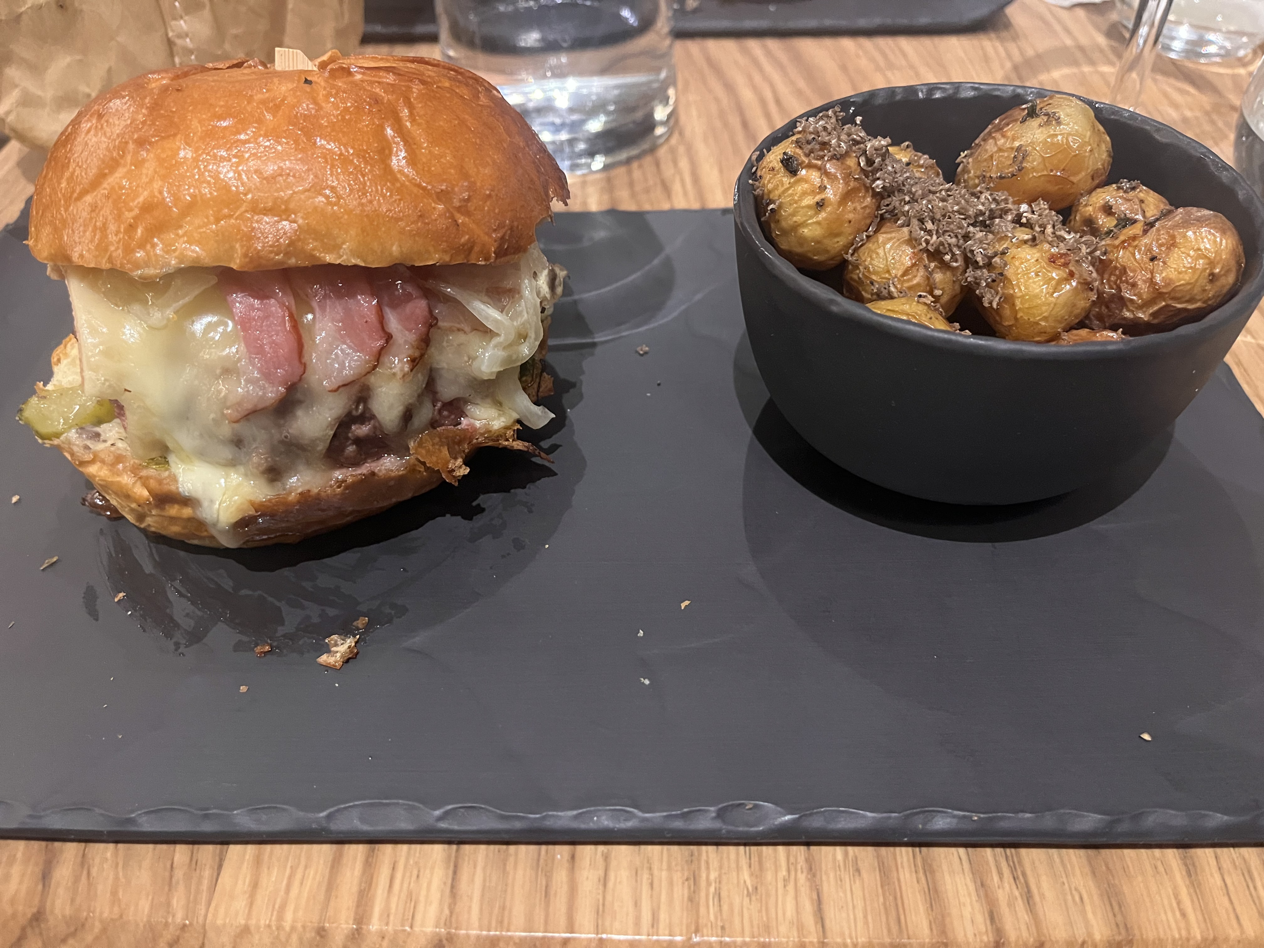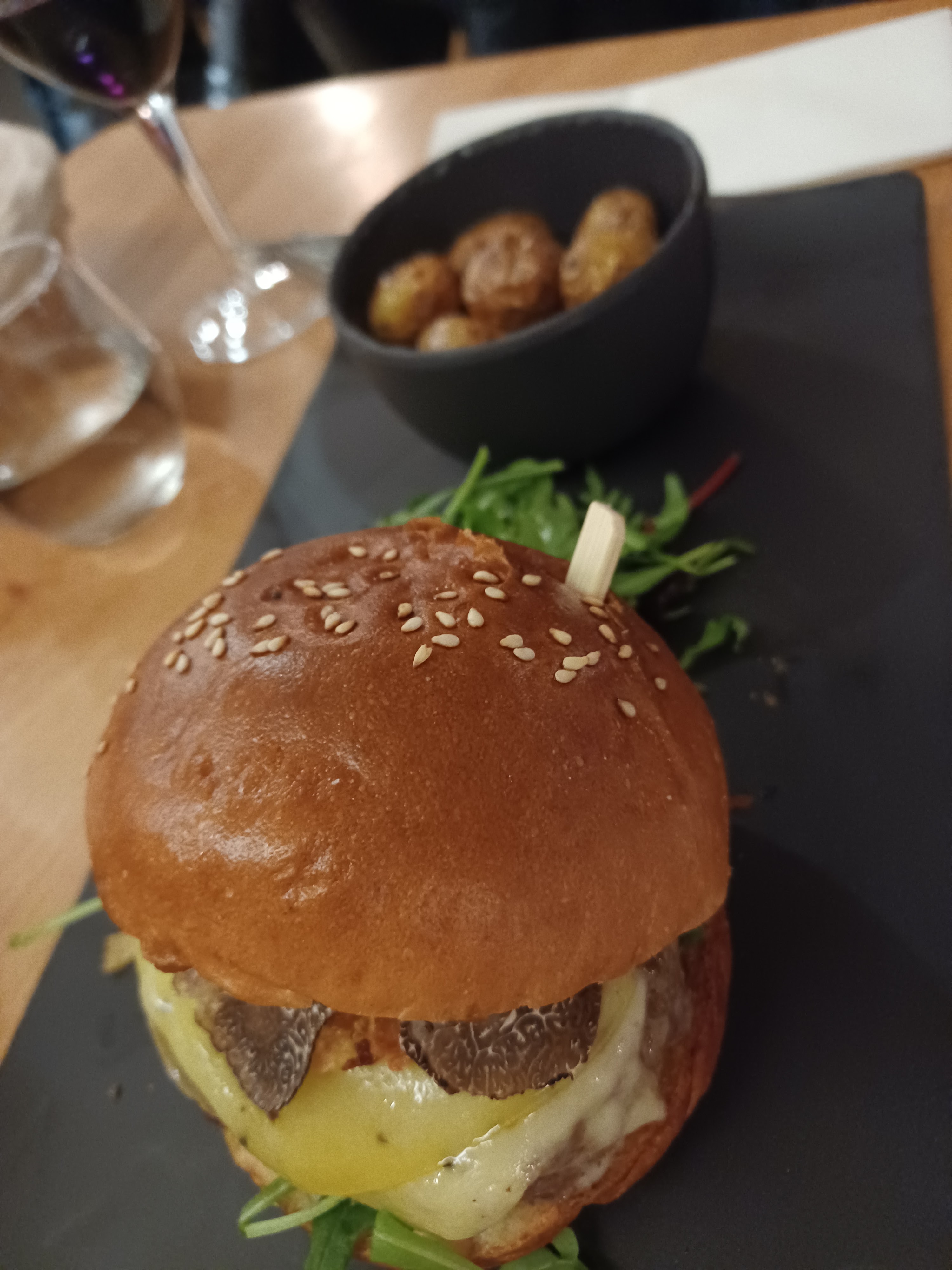 Planche copieuse, top en entrée à partager. Burger généreux et bon goût de truffe. Mention particulière au praliné à la truffe en accompagnement du café, une tuerie. Super découverte !