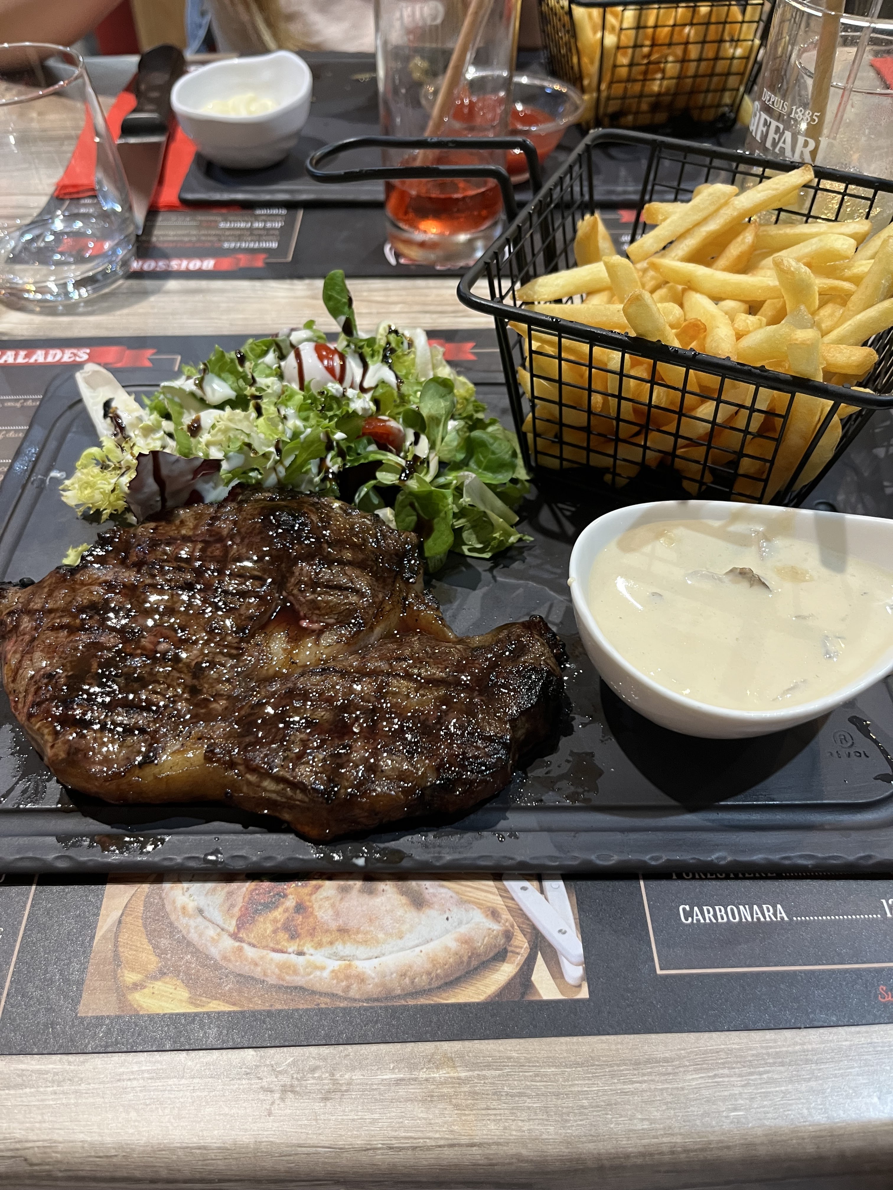 Bon je commence par le mieux, sauce forestière et sauce poivre top 👍🏼 Le pain aussi est très bon. Pour le reste salade très très moyenne moins bonne que celle de Bufalo gril… Assiette extrêmement petite (ne pas avoir très faim si vous allez la bas.) Portion de frite extrêmement maigre aussi au passage. Assiette servis sans sauce pour un grill house j’ai jamais vu ça il vous faudra payer 2€ pour avoir un peu de sauce….😆 La cuisson de la viande aussi n’a pas été respecter, arrivé saignante alors que demandé bien cuite. Dessert surgelé surement de chez métro vendu a 5/6€ pièce pas besoins d’en rajouté. Cuisine fermé a 21h50/22h alors que le resto ferme a 22h30… Pour finir prix trop cher a revoir a la baisse.