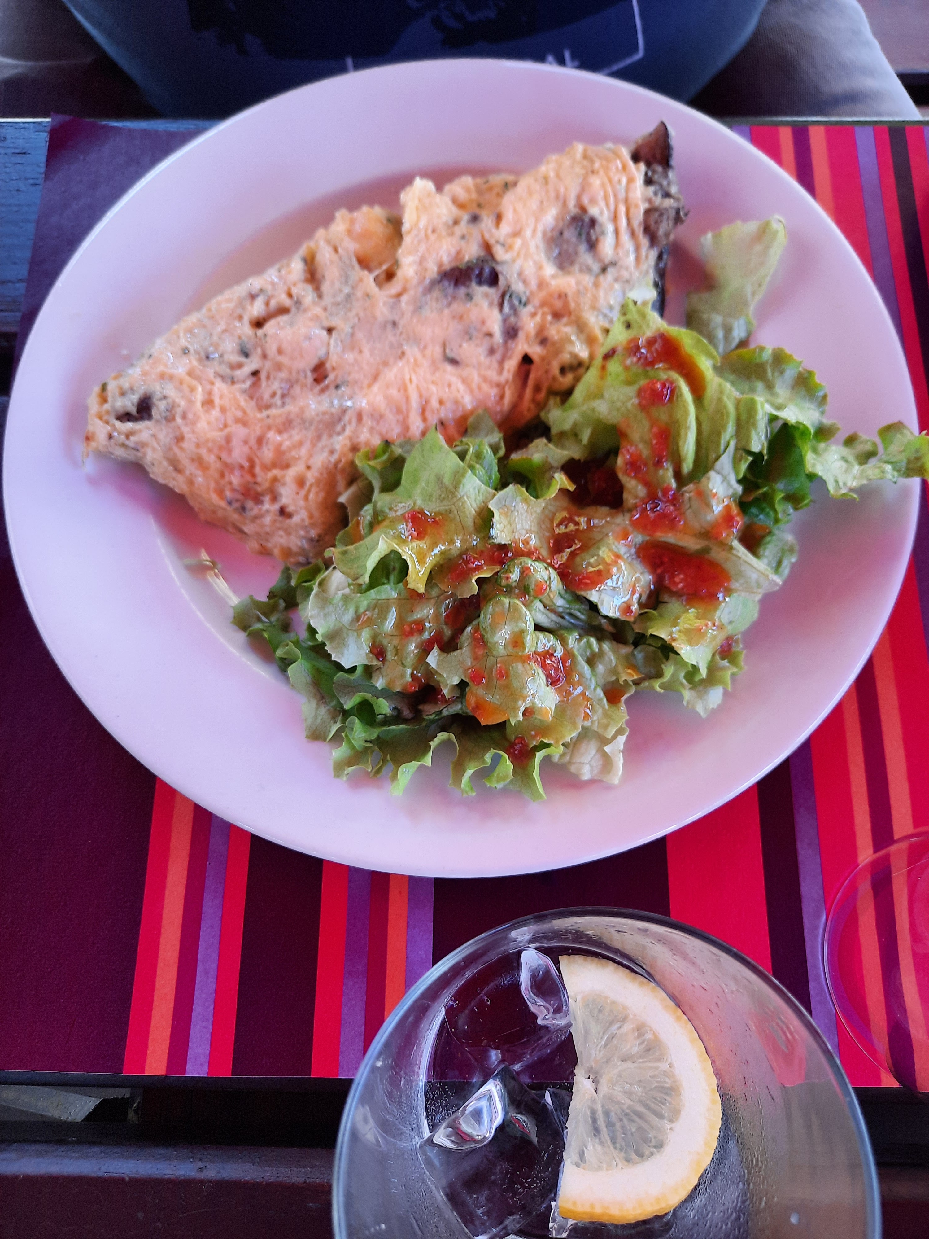 Malgré que le cadre soit magnifique, le repas quand à lui ne l’est pas. 6 choix de « viande » dont 3 sont de l’agneau (la seule viande que je n’aime pas) et les autres sont pour 2 personnes , donc très restreint comme choix. J’ai donc simplement pris une salade, qui pour 11€ reste très cher, une demi tomate, un seul œuf dur et quelques miette de thon.. j’ai demandé une portion de frite à côté qui m’a coûté 5€. Très déçu