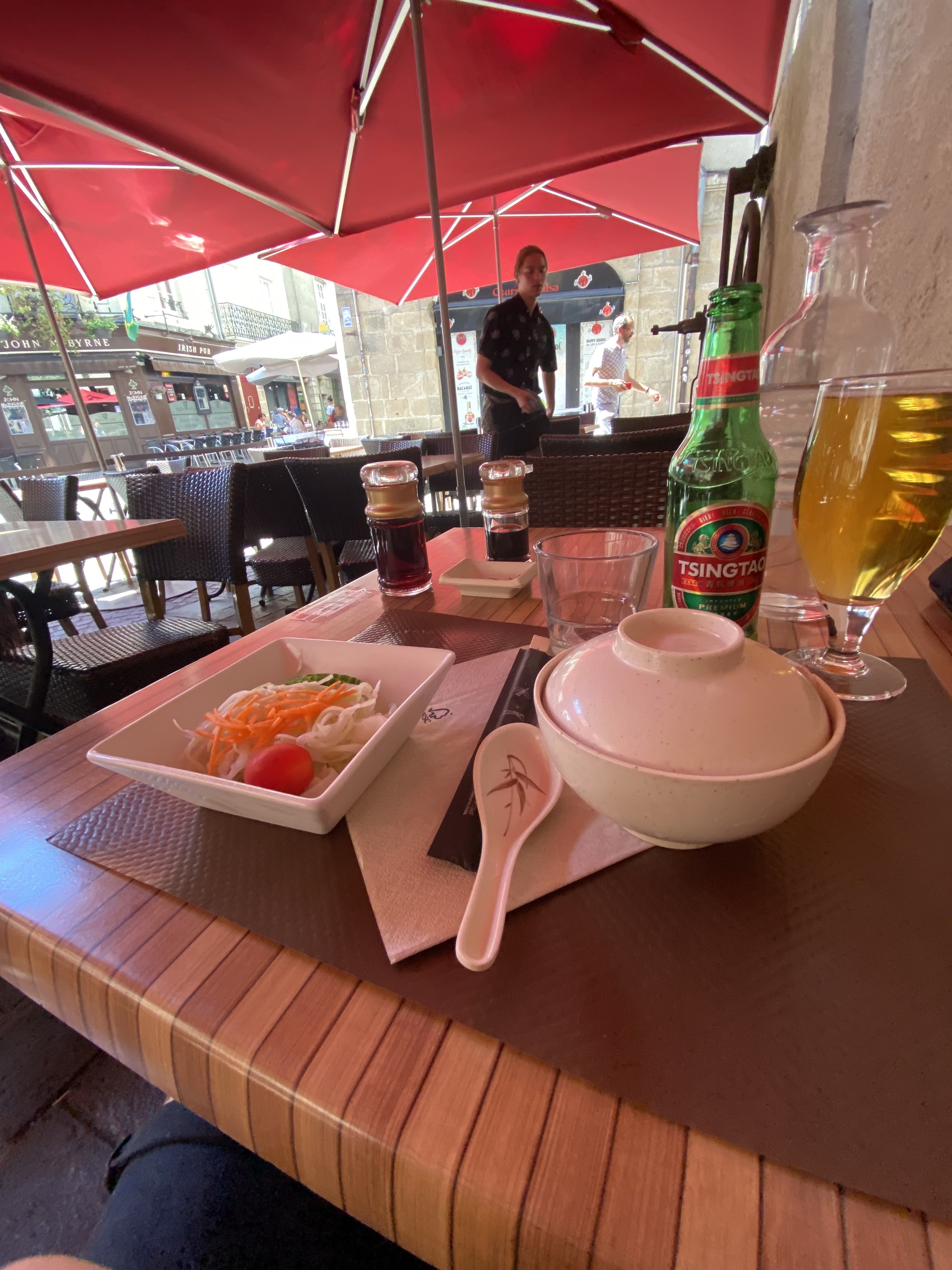 Endroit très sympa à l’ombre sous les parasols dans cette petite rue piétonne. La cuisine coréenne très appréciée. C’était délicieux. Service rapide et serveuse adorable et très discrète. Un très bon moment avec mes deux enfants d’origine asiatiques qui adorent cette cuisine.