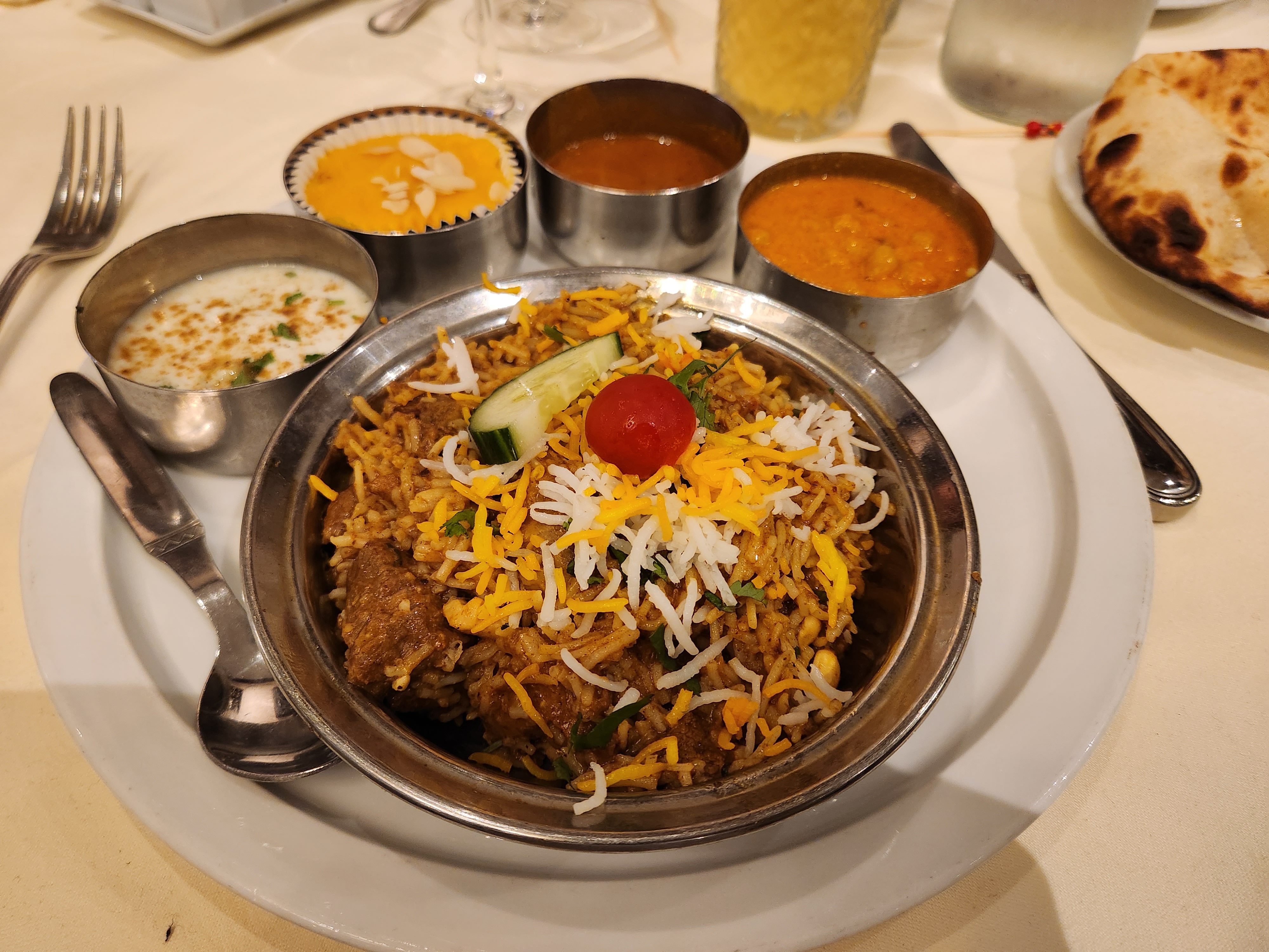 Agneau vindaloo, nan fromage et riz basmati excellents, service attentionné
