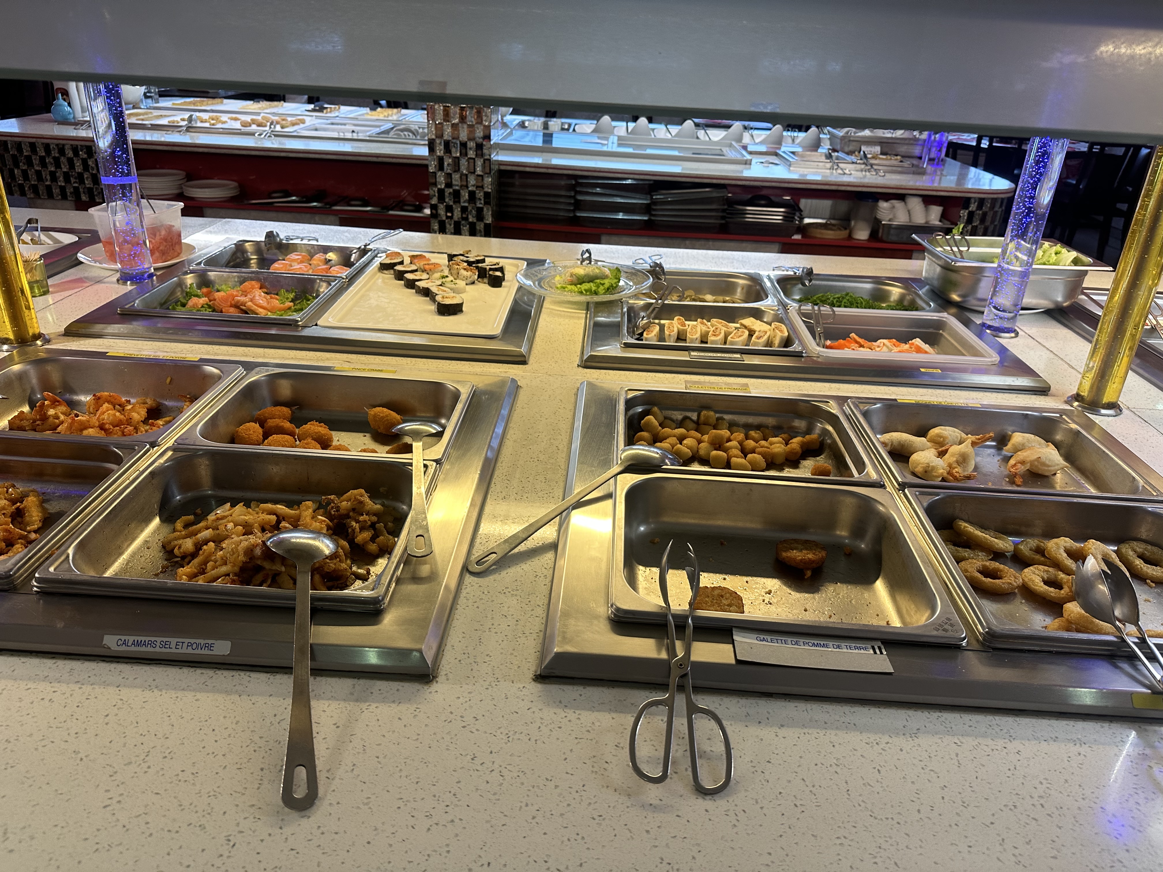 Buffet basique, pas trop achalandé, pas du tout de poisson, sauf crevettes ou calamars fris, aucun fruit asiatique.. bof
