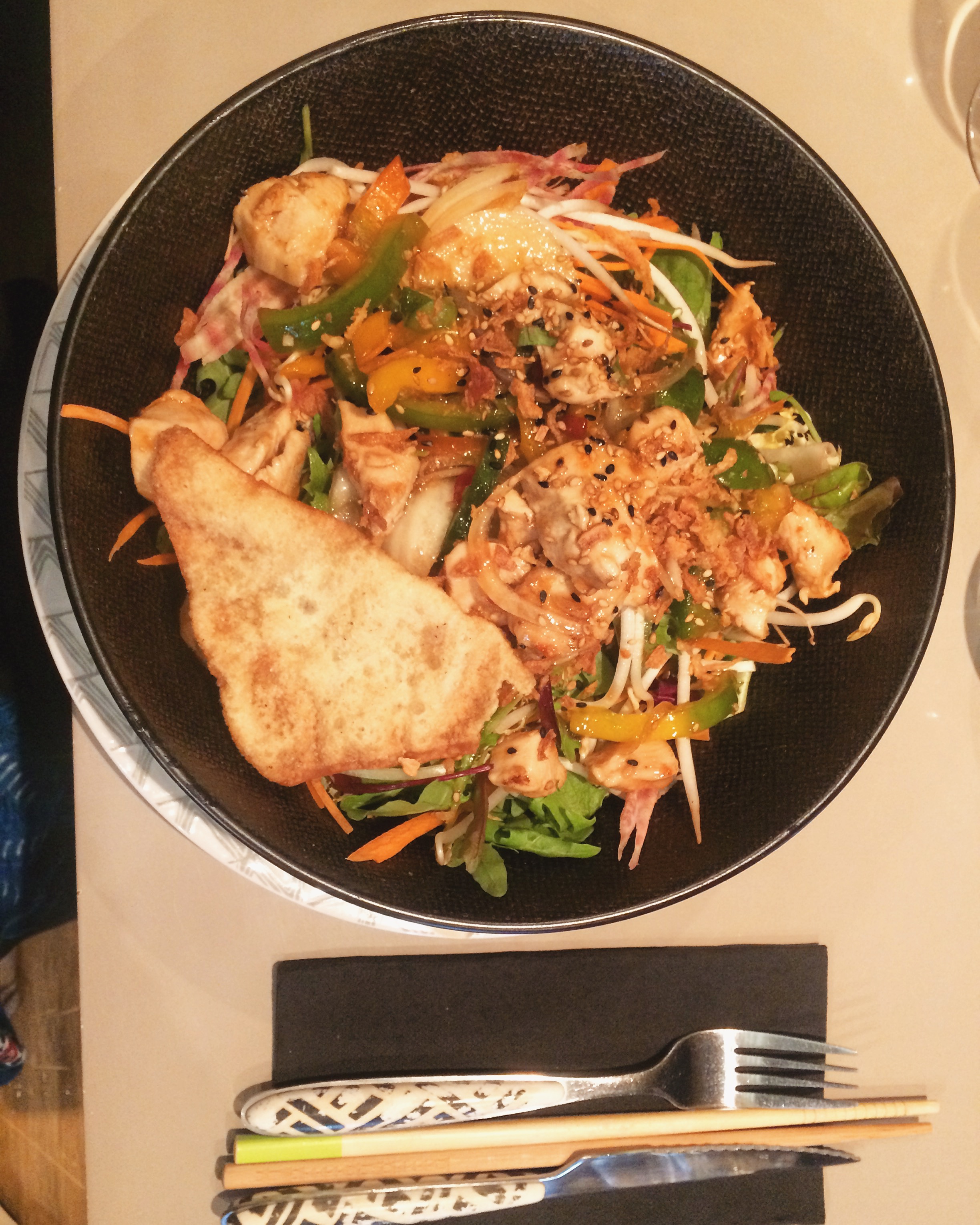 J'y suis allée hier soir pour la première et dernière fois. Bien sûr c'est cher vu l'emplacement. J'ai commandé un asado de boeuf qui n'était pas mauvais mais j'ai fait une intoxication alimentaire. Phad thaï pour une amie, qui a trouvé cela moyen. Une autre amie a pris un tataki au thon. C'était sec et elle avait des doutes sur la fraîcheur. Service correct. Il y a tellement de meilleures adresses !