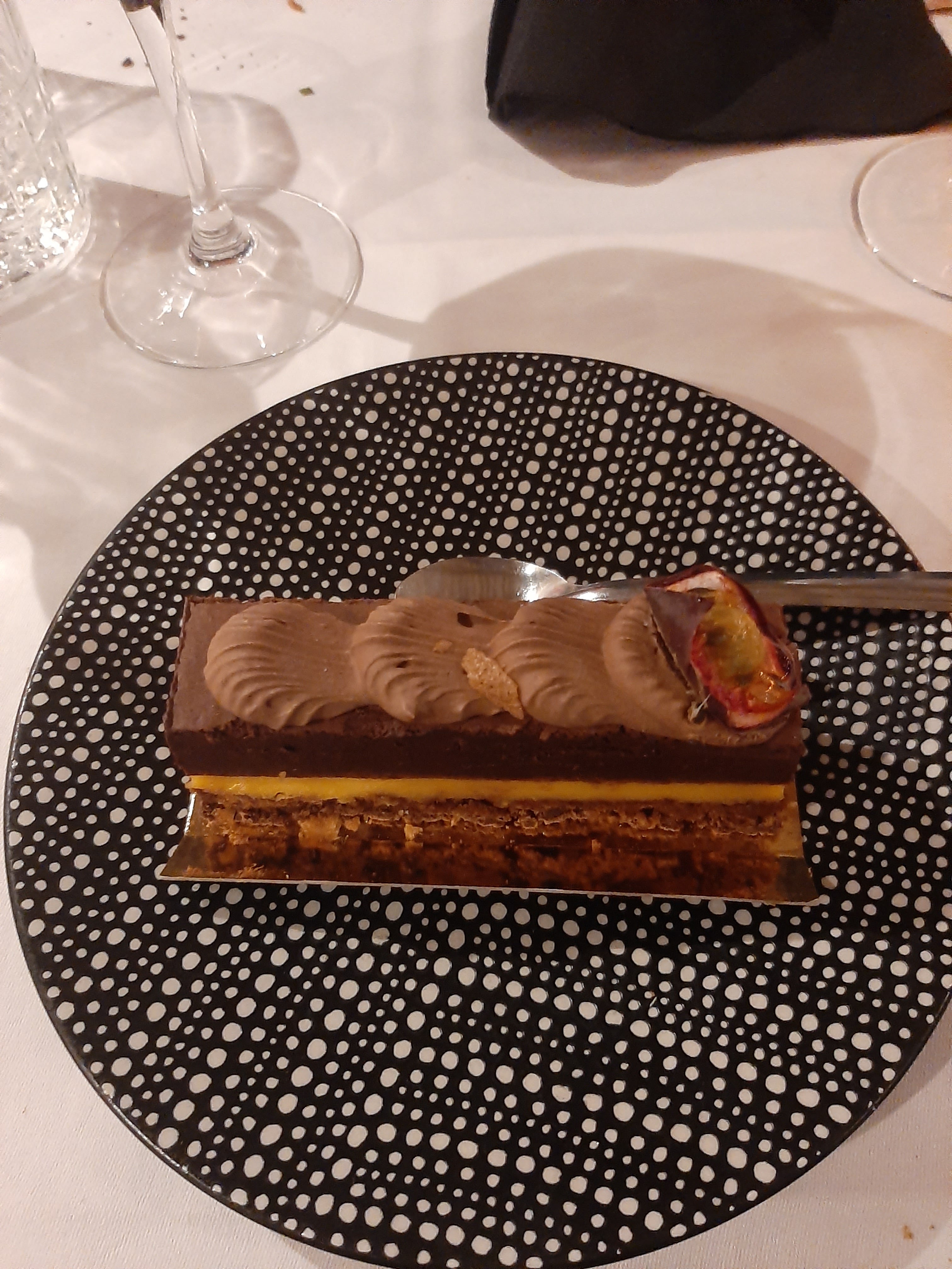 Plats correct sans plus 3 étoiles (seulement pour mon plat végétarien )car la surface de notre table dressée était mal nettoyée du service précédent et il était seulement 19h45 ( donc je suppose service du midi) serveur certe professionnel mais vraiment pas sympathique et il faisait très froid dans le restaurant car porte ouverte pour les allez/venu des serveurs pour le service en terrasse Donc ce n'est pas une expérience que je retiendrai