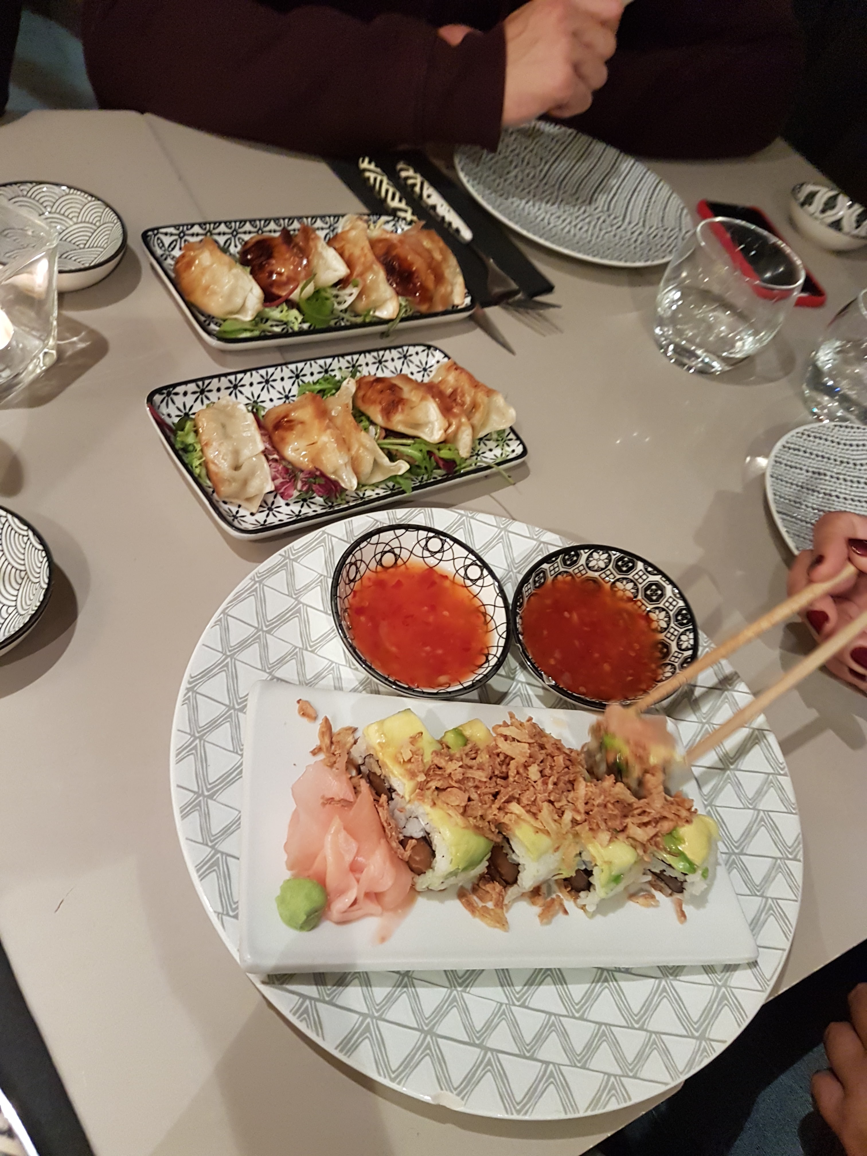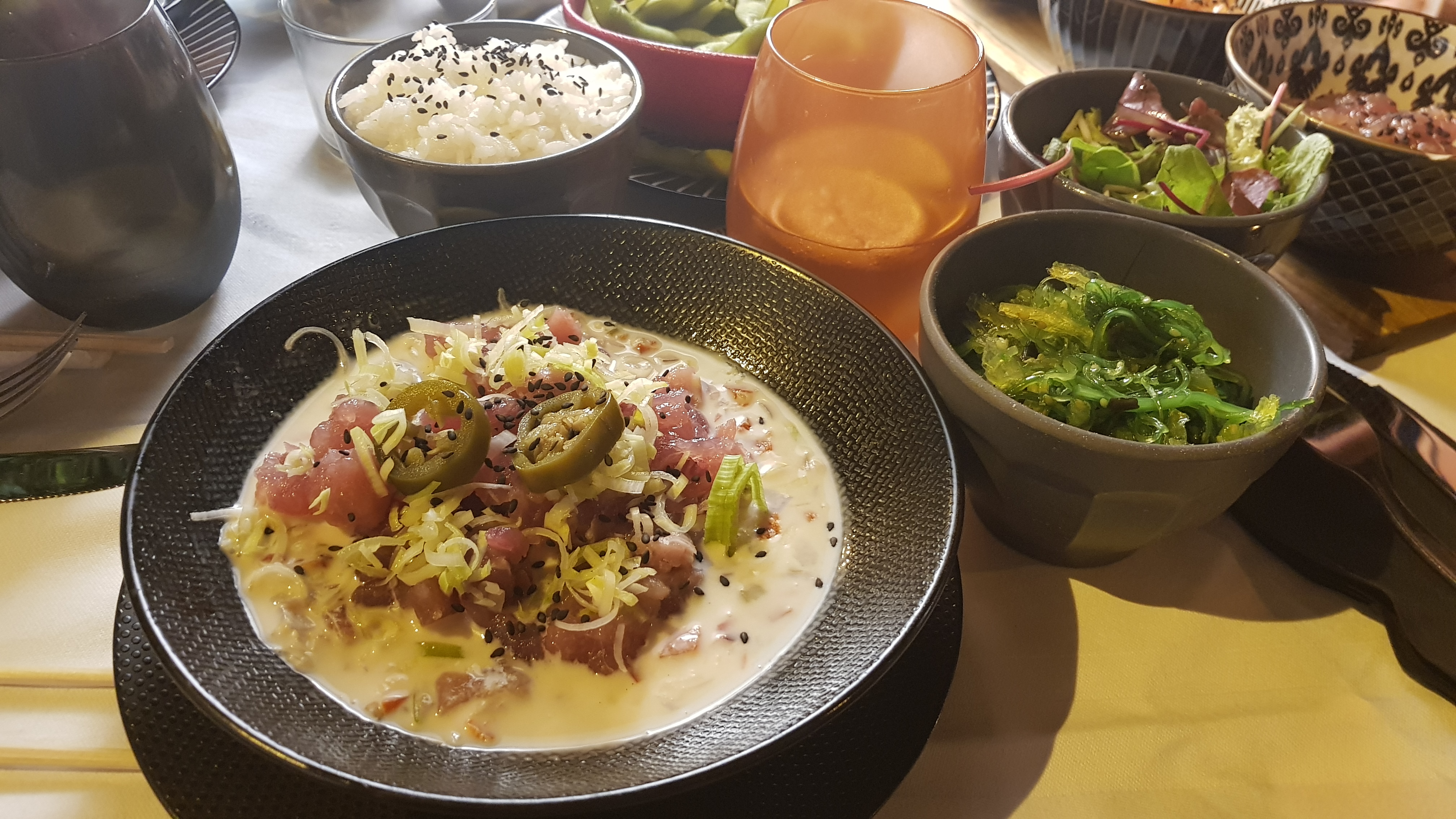 Venue dîner avec une amie, nous commençons par un apéritif avec des gyozas frits aux légumes à partager. Très bon. Ensuite, nous avions commandé un boeuf thaïlandais et un ceviche de daurade en plats principaux accompagnés d'un bon verre de vin. Nous avons bien eu le bœuf thaïlandais, succulent au demeurant mais le ceviche de daurade a mis plus de 45 minutes à arriver malgré nos relances et celle de notre serveuse qui fut plus qu adorable ... Mon amie a bien entendu fini son plat que le mien n était toujours pas là. Le responsable de l établissement vous explique qu il y a deux cuisines différentes et que celle de ceviche a du retard.... Blablabla il a fallu hausser le ton et dire que cette attente était inadmissible surtout quand vous voyez la taille de l assiette du ceviche qui ressemble plus à une entrée. Le directeur vous apporte un bol de thon rouge pour vous faire passer la pillule. Le ceviche est également excellent ainsi que le thon rouge. A déplorer le manque d organisation pour ce type d établissement et surtout le geste commercial aurait été plus que bienvenu vu la note de 72.50 euros que nous avons laissé. A découvrir une fois mais clairement je n y retournerai jamais. Vous êtes prévenus.