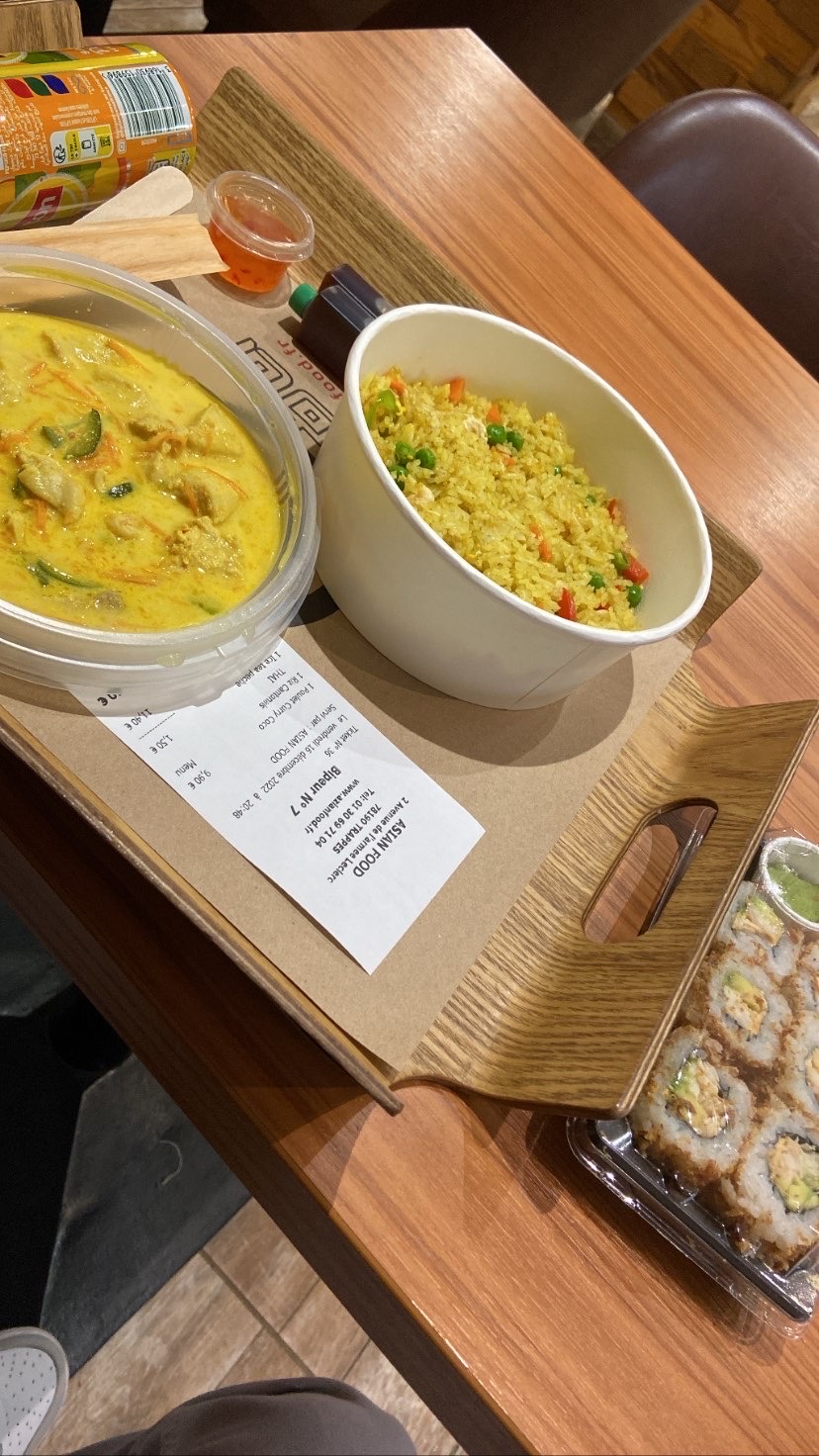 Mauvaise expérience . Le plat bœuf saute super sec aucun goût à éviter ainsi que le le plat poulet coco super gras et pas bon je vous conseille pas à fuir