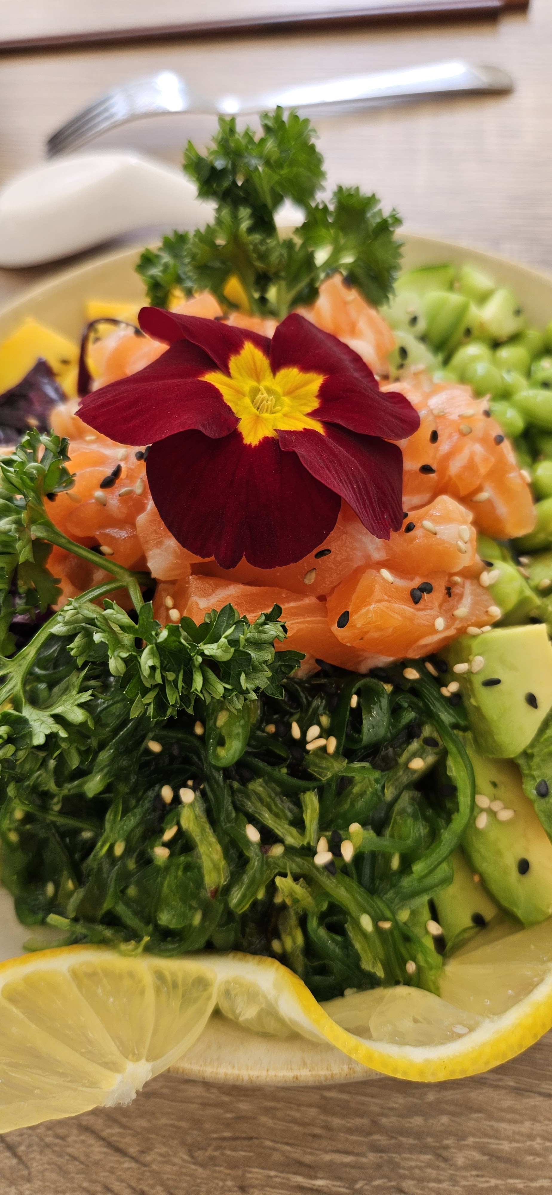 Poké Saumon, c'est trop bon ! Mangue, avocat, saumon, riz vinaigré, concombre, ect.. les produits sont frais, fraîchement coupés et le lieu est propre ! Compter 13€90 pour la taille moyenne, et la portion est assez ! Une carte de fidélité est disponible pour les plus gourmant, le 10ème c'est cadeau. Service très agréable