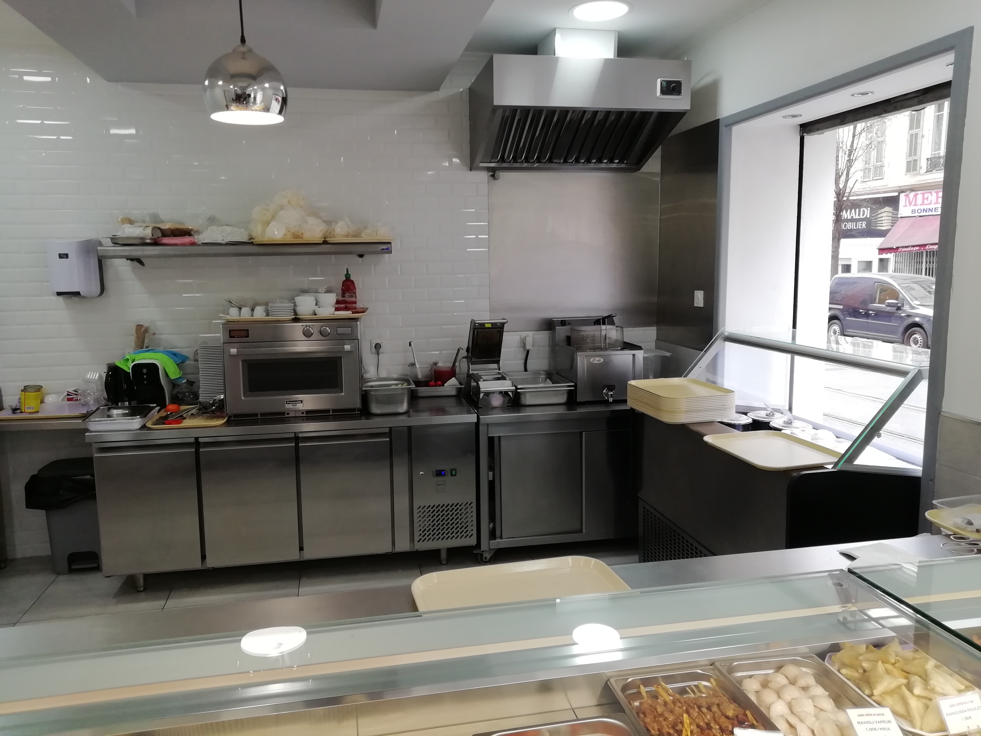 Tout est très bien : excellente nourriture, fraîche, bien présentée (tout fait vraiment envie dans la vitrine), salle très propre et accueil sympathique, souriant, professionnel et rapide. Un des seuls problèmes est la distribution à emporter de ces sacs plastiques blancs 'épais', qui sont un cauchemar pour l'environnement et la planète... le sac en kraft peut être une solution, facile à mettre en place. :D Pour la restauration sur place, il serait aussi plus pratique de mettre à disposition de la clientèle un micro-ondes, des baguettes en libre-service, les sauces 'de base' (soja, piquante, etc...), ainsi que poivre et sel. Une option 'vin' au verre et en quart serait un plus aussi, profitons de nos vignes avec votre belle cuisine :D