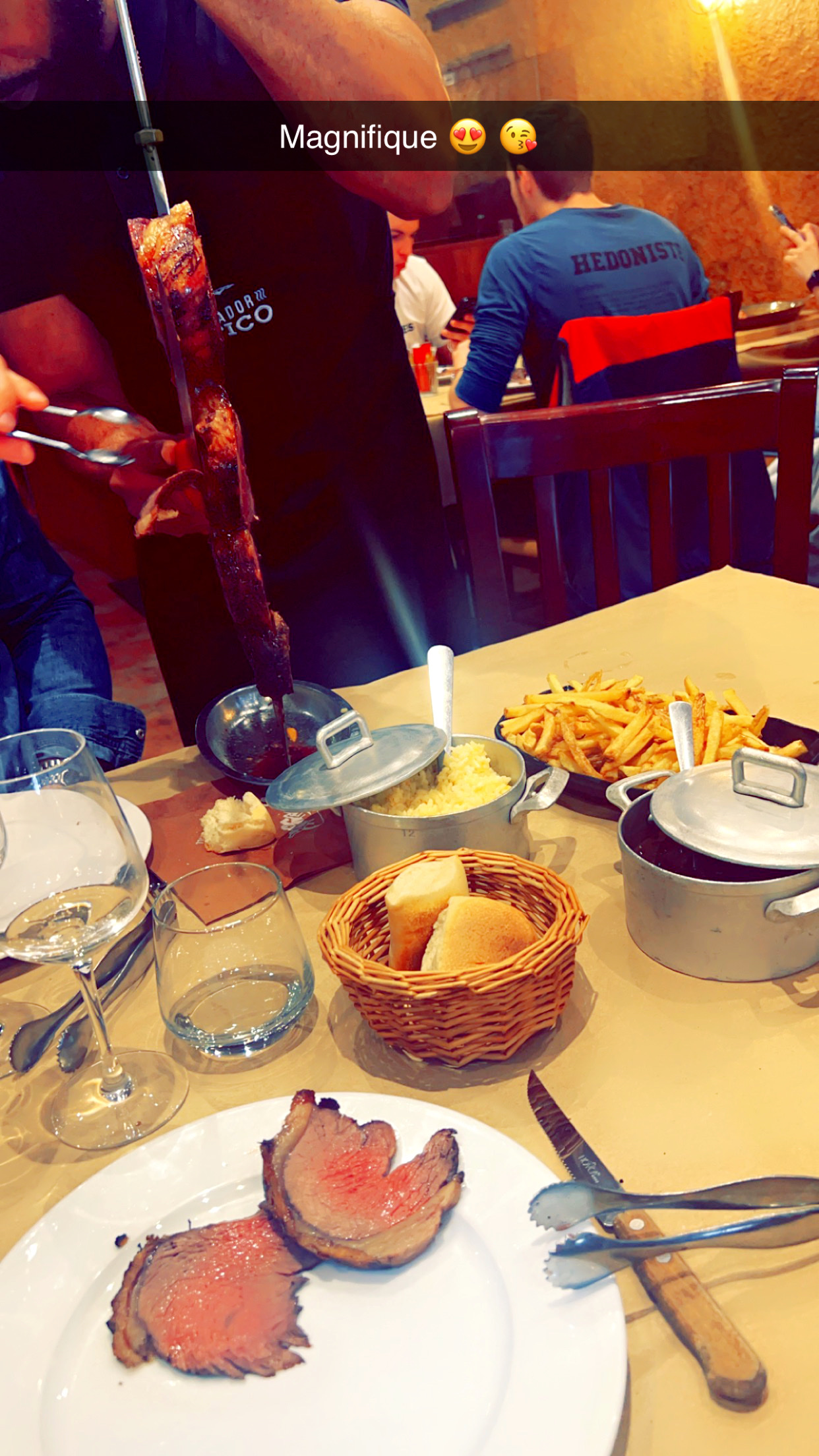 Je ne comprends pas du tout l'engouement pour ce restaurant... concernant la cuisine, les cuissons demandées ne sont pas respectées. Je demande bien cuit, on me ramène de la viande saignante (par deux fois). J'ai fini par lâcher l'affaire. La viande est super salée, j'en ai eu des aphtes. Le riz et les haricots ça va, mais les frites l'horreur... à peine cuites. Rien de pire pour plomber la digestion. Niveau service à part un serveur, tous les autres tirent la tronche. Le système de service à table est sympa, mais il y a du gras absolument partout au point de ne pas pouvoir poser les coudes sur la table. Je vous déconseille de venir avec des vêtements clairs auxquels vous tenez. L'ambiance cantine et resto d'autoroute, pas ouf du tout. Et tout ça pour une facture aussi salée que la viande. Pas glop. Bien entendu, si la seule chose qu'on attend d'un restaurant c'est d'être servi à volonté, comme c'est la mode en ce moment, ça ne m'étonne pas que des gens notent bien.