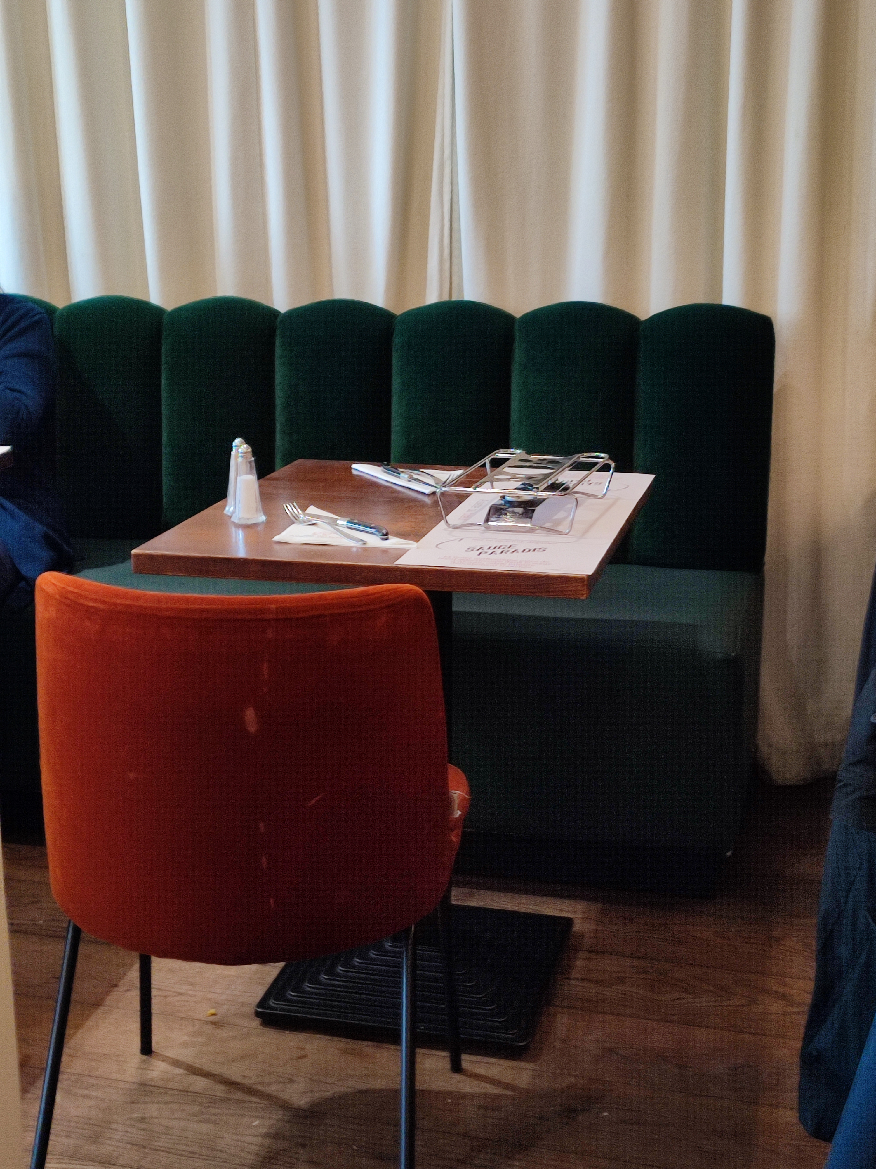 Cuisine excellente Mais : table collante, sale par terre car le serveur jette les reste de table à terre. Couvert manquant lors de l arrivée du plat. Et très bruyant